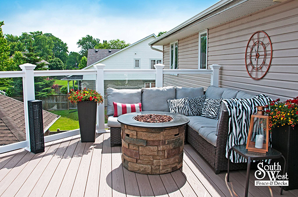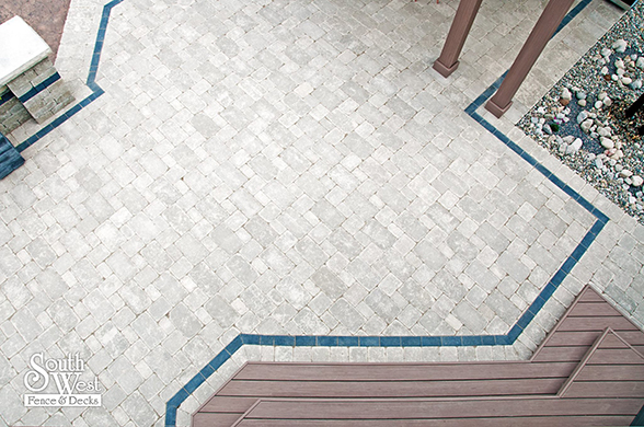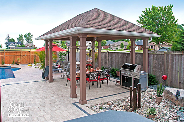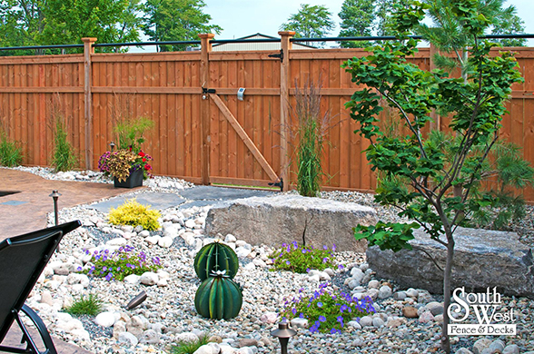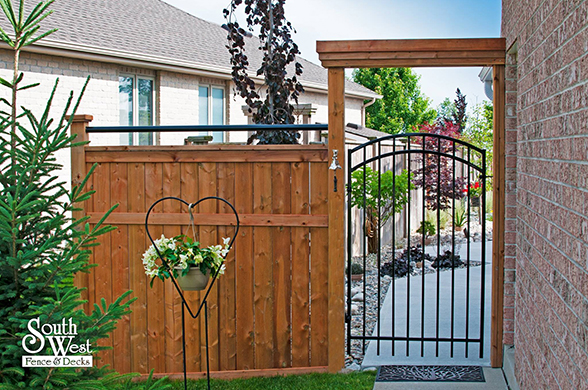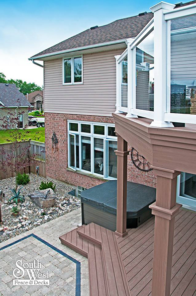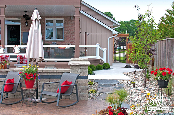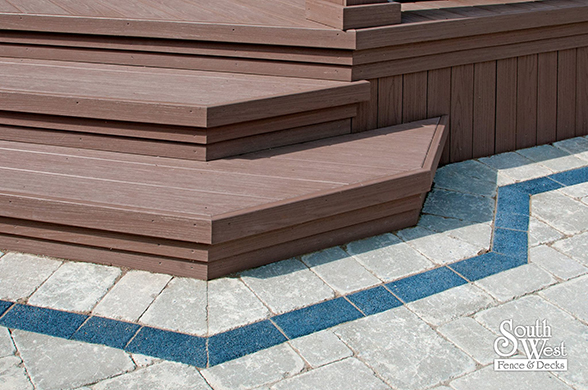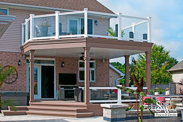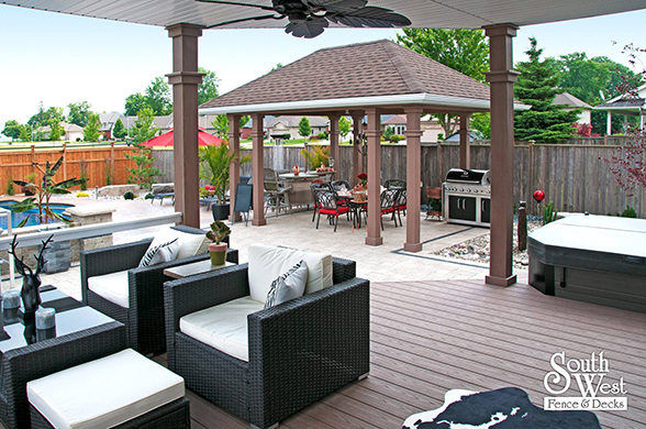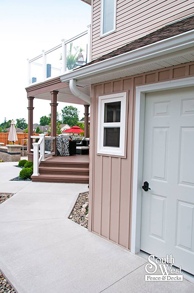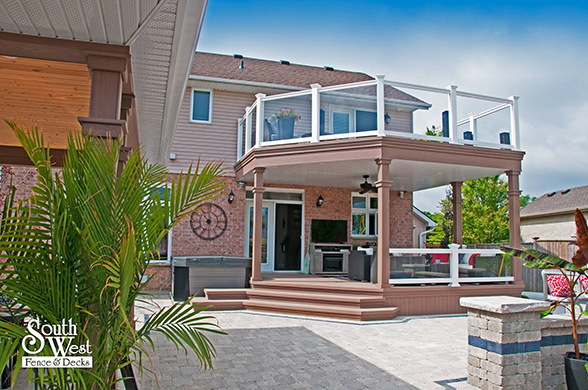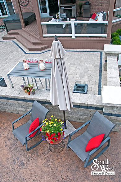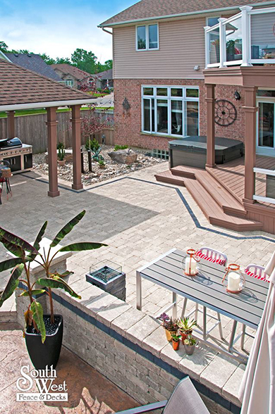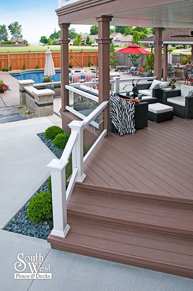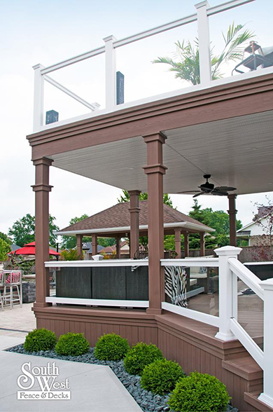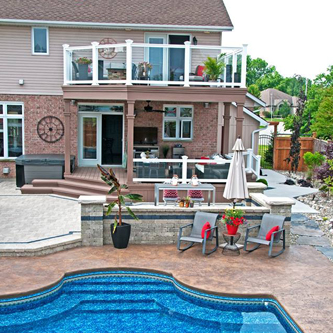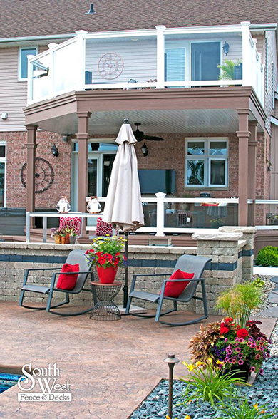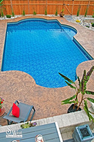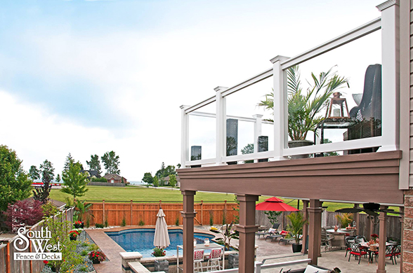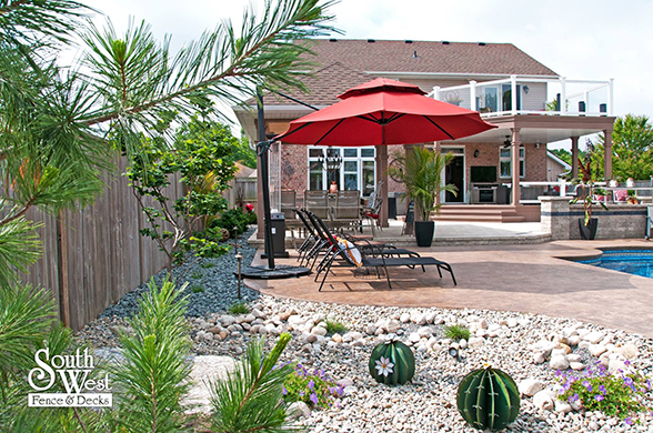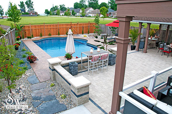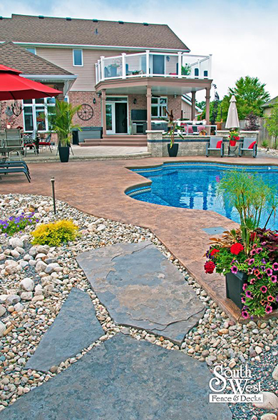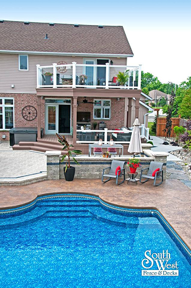 This majestic ’Complete Backyard’ project designed and installed by South West Fence & Decks includes a beautiful in-ground pool with stamped concrete decking and patio, a lofty 2-storey low-maintenance mono-tone Azek deck with white vinyl and glass railing, a regal cabana with lighting, an attached shed/change room with outdoor shower, stone patio and perimeter wall, concrete and natural stone walkways, pressure-treated wood fence with black pipe topper accent, black rod iron gate, professional landscaping with lighting.