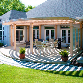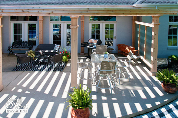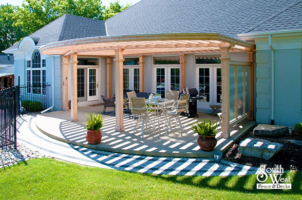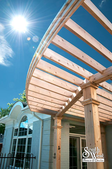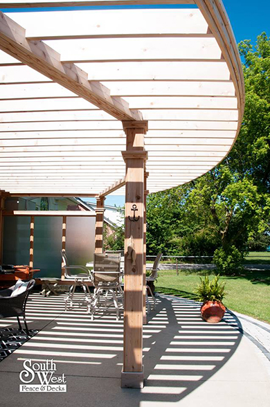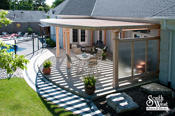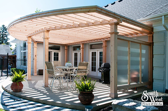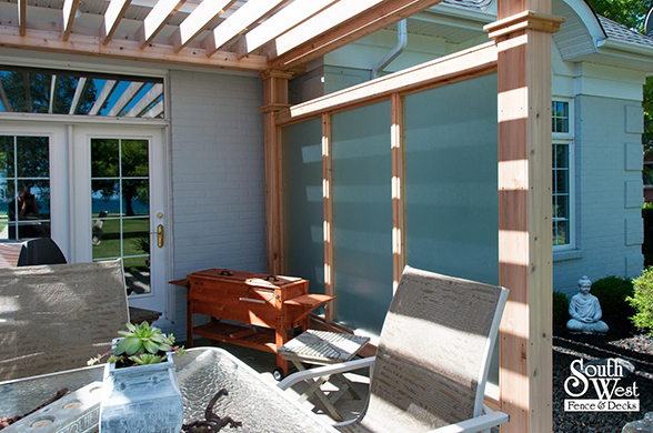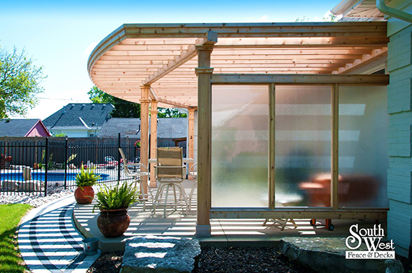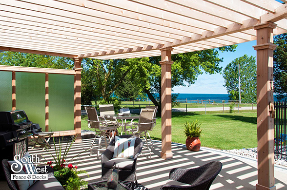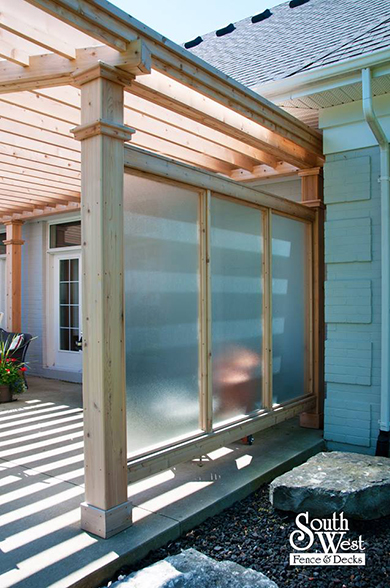 This recently designed and installed project by South West Fence & Decks includes a stunning countered cedar pergola with a frosted glass privacy screen, and a stone walkway.
