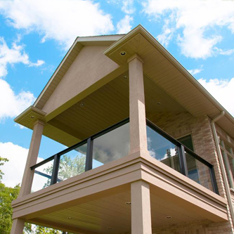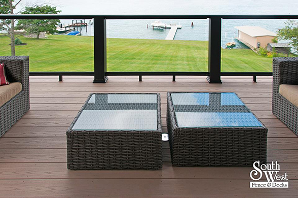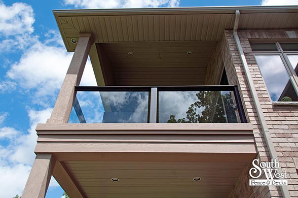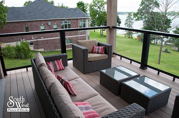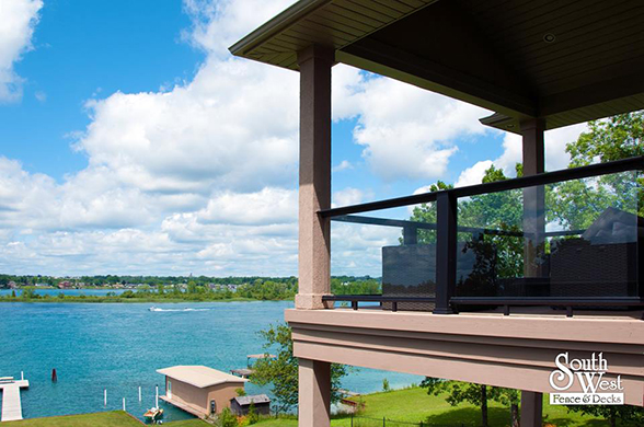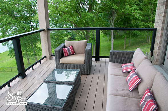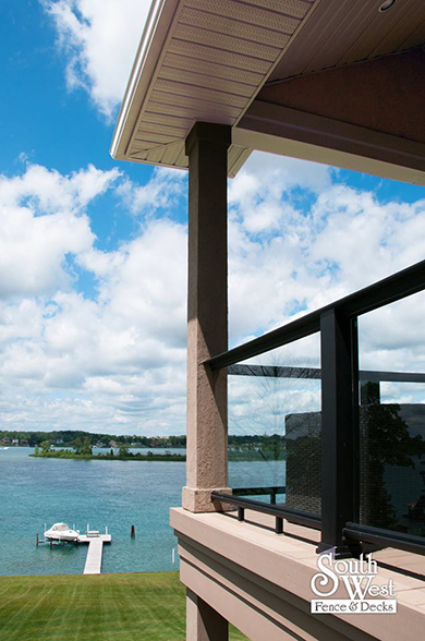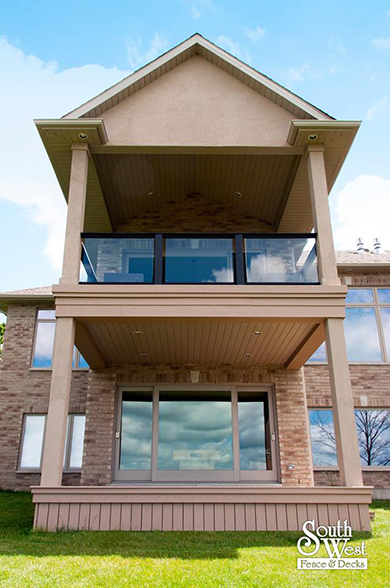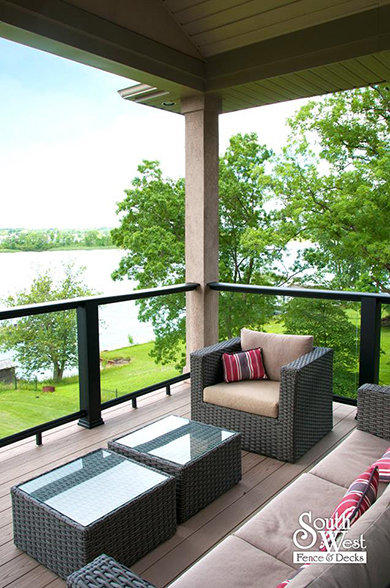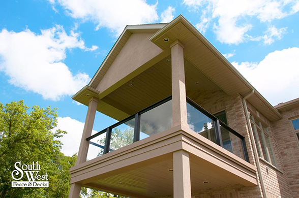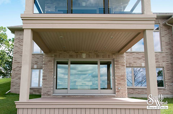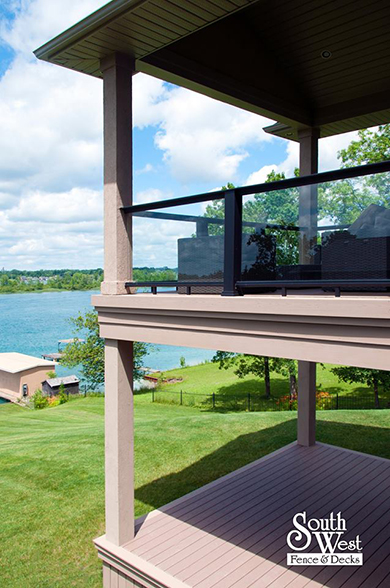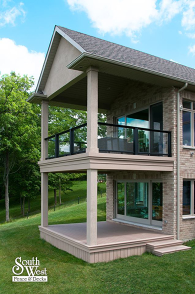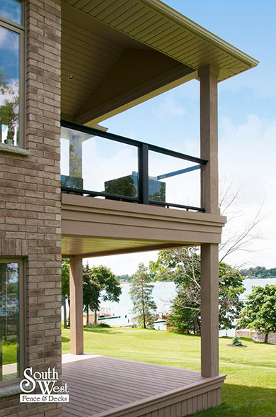 Another dynamic two-tier, covered deck design and installation by South West Fence & Decks. This project contains a ground level mono-tone, low-maintenance Azek deck with stucco posts and lighting. The upper-level, covered balcony deck is accented with a lightly tinted glass railing to enjoy an unobstructed, magnificent view.