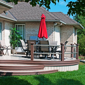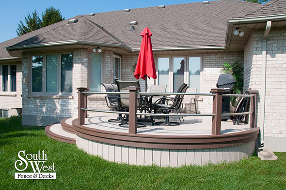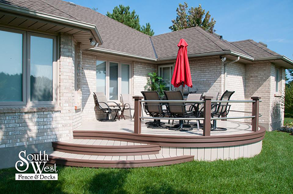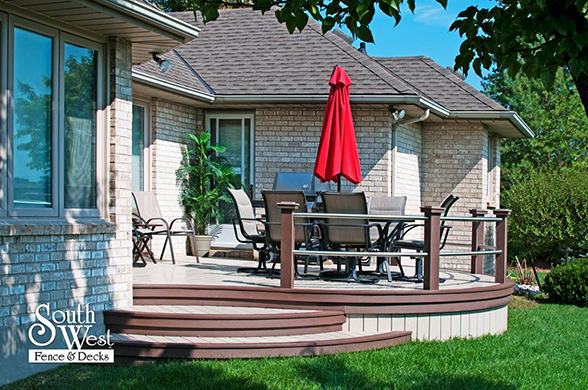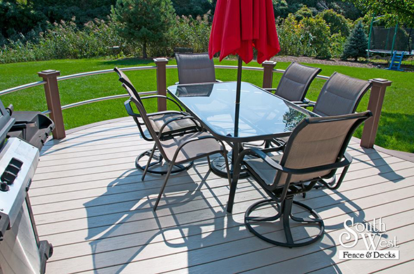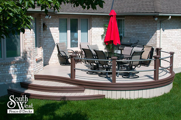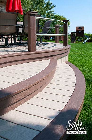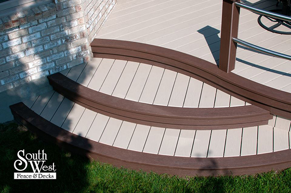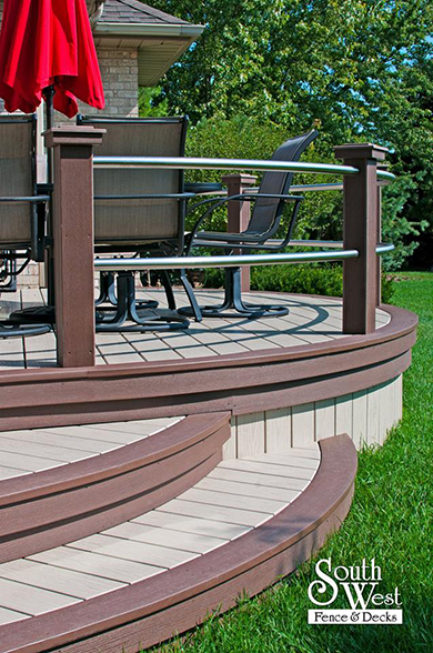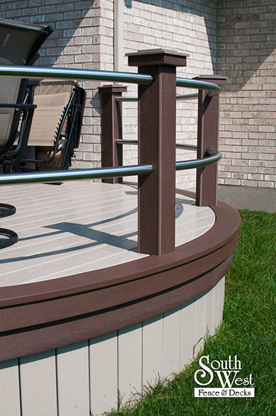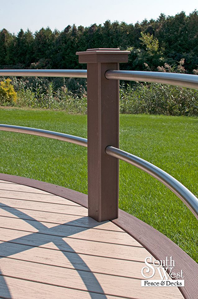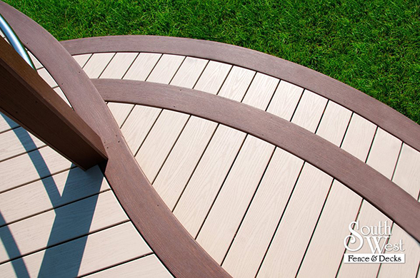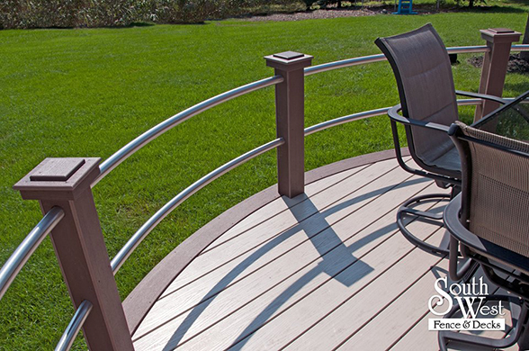 South West Fence & Decks recently-designed and installed this charming two-tone Azek, low-maintenance, contoured deck with stainless pipe railings.
