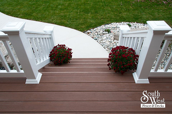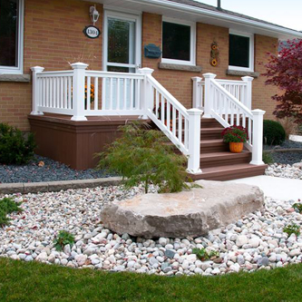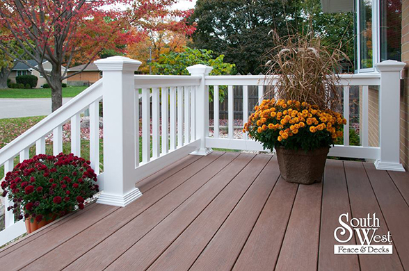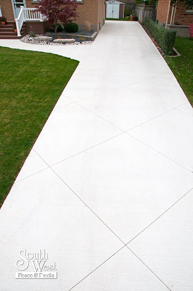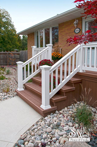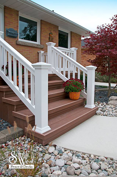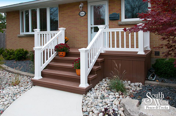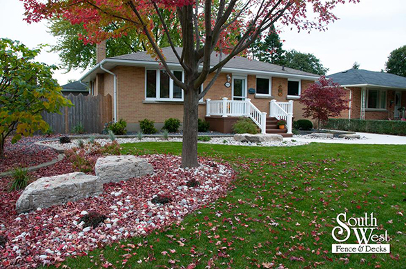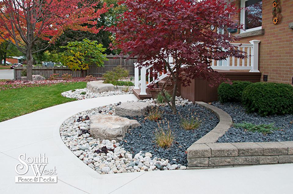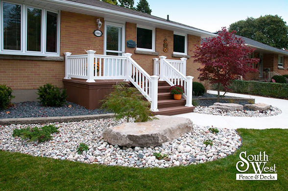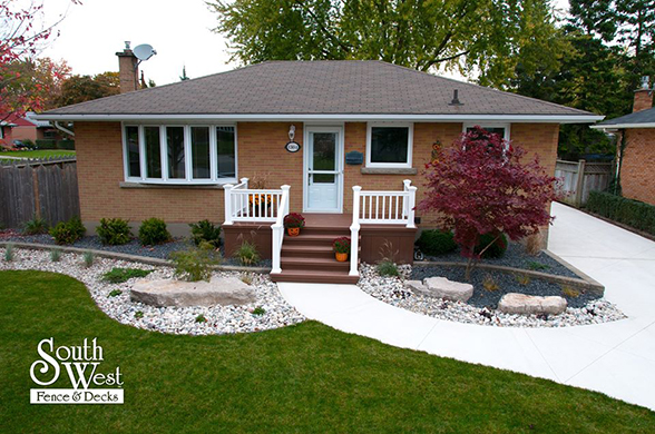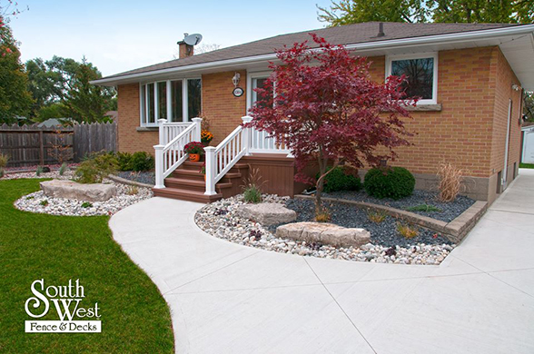 Another multifaceted front yard project designed and installed by South West Fence & Decks. Features include a charming Azek low-maintenance front porch with white vinyl railings, professional landscaping, and a broom-finished concrete driveway and contoured walkway.