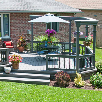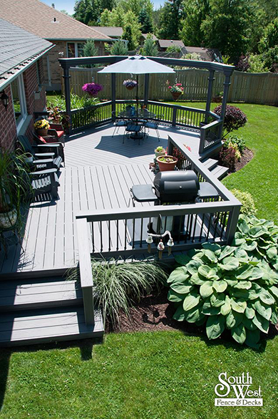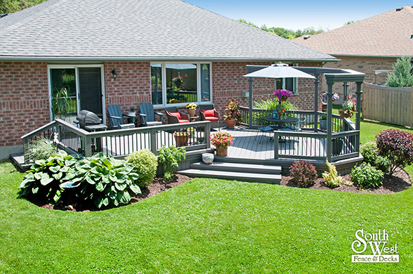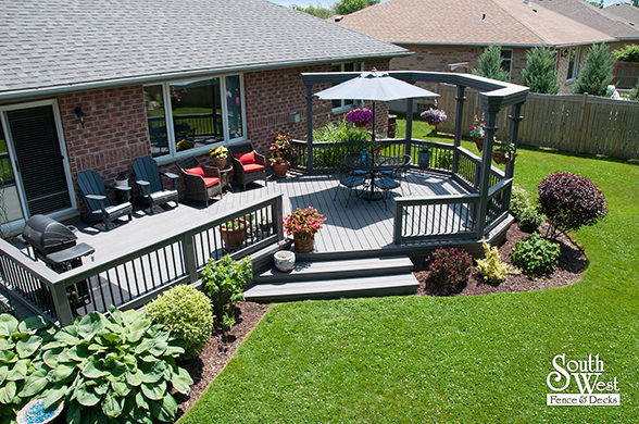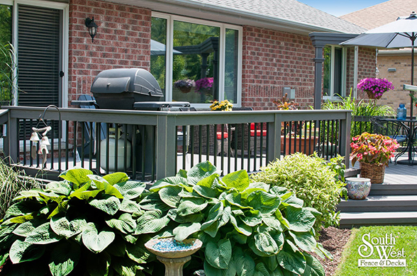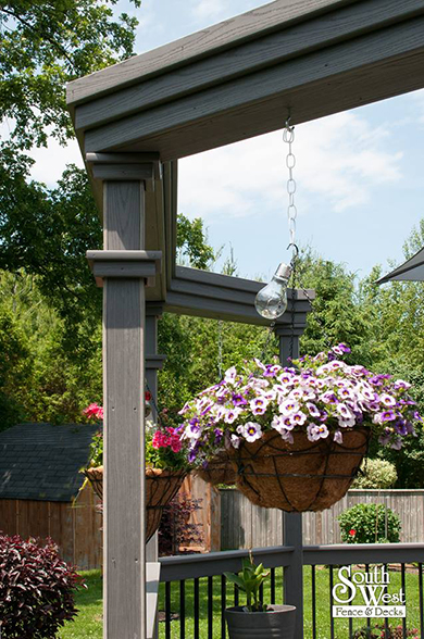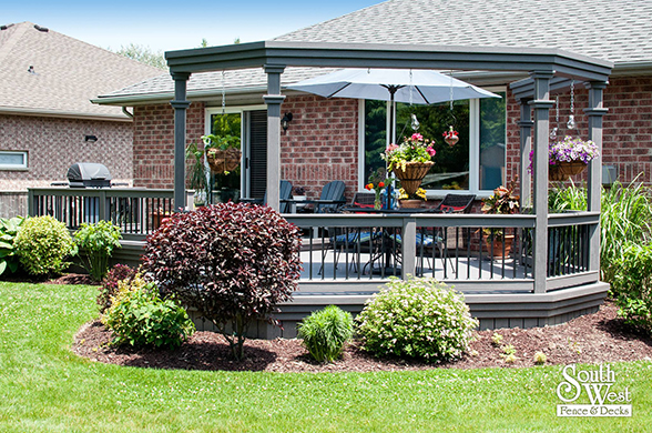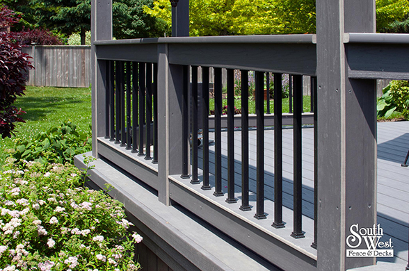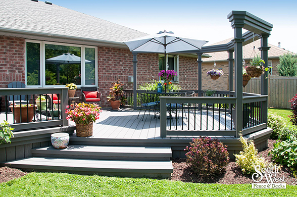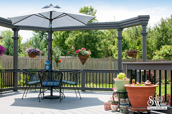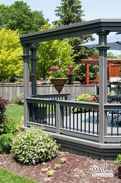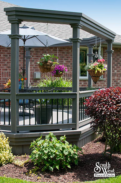 Another recently designed and installed deck project by South West Fence & Decks. This Azek low-maintenance deck includes an arbor to provide shade and a place for hanging plants. Deck railings with rod iron spindles and a modern grey & black colour scheme are a perfect backdrop for colourful outdoor furniture, landscaping and potted plants.