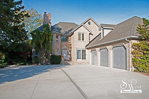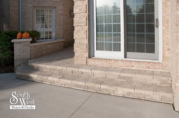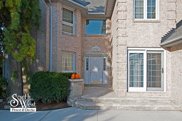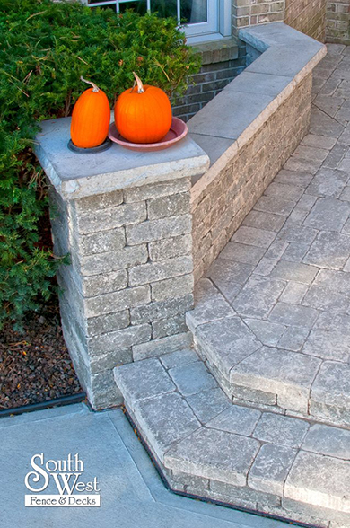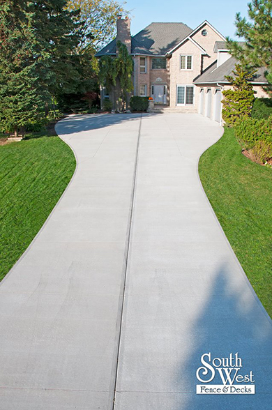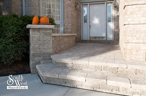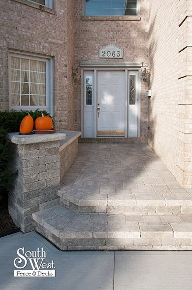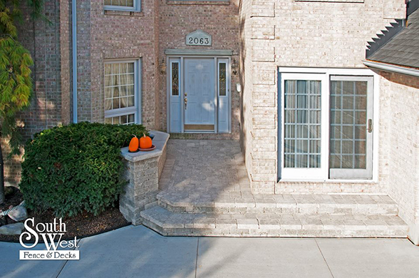 This week’s feature project, designed and installed by South West Fence & Decks, is a refined stone front porch with an accent stone wall, wide steps to incorporate an additional entrance, and an impressive, lengthly, broom-finished contoured driveway.