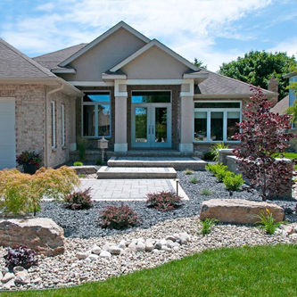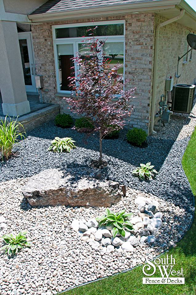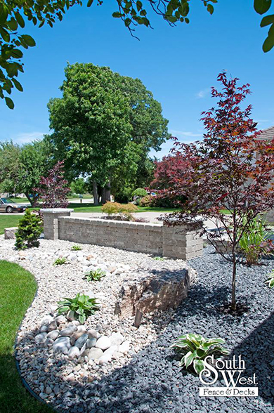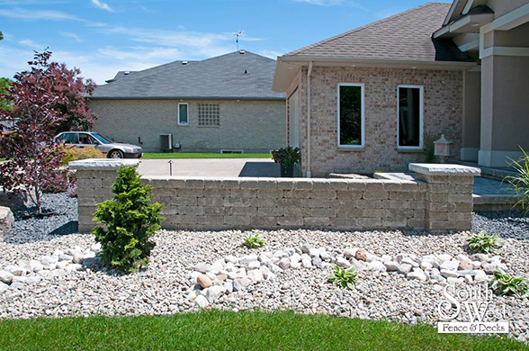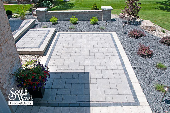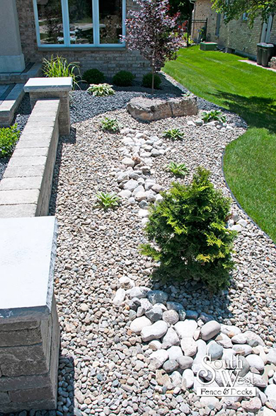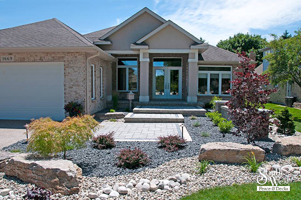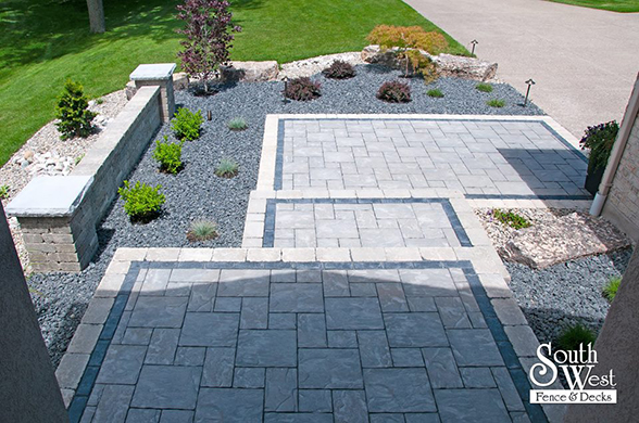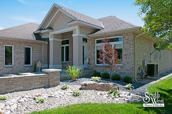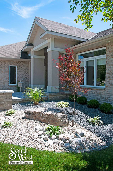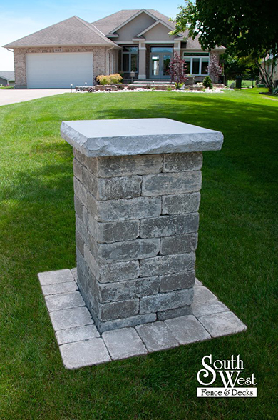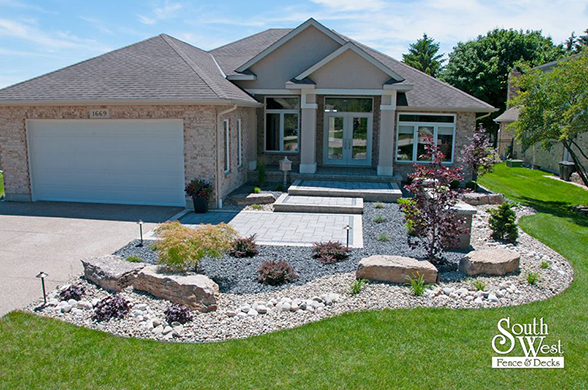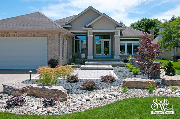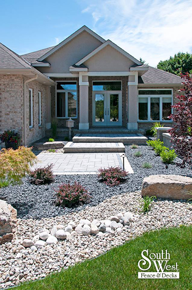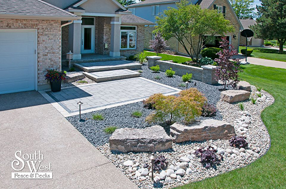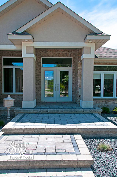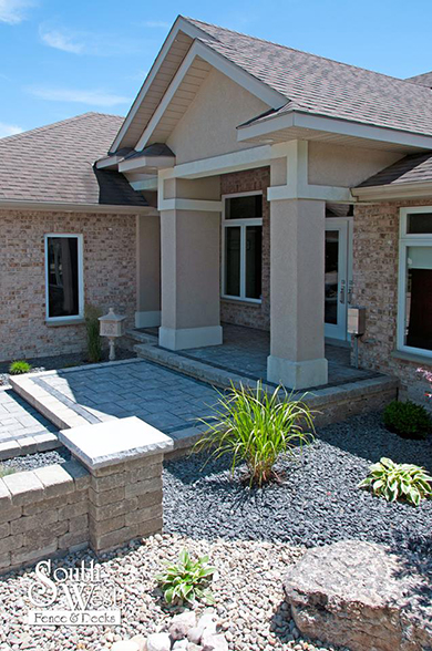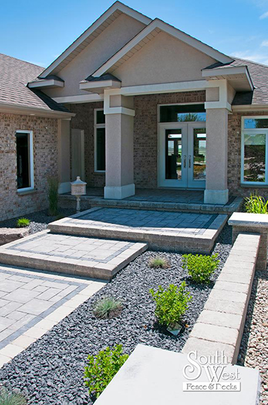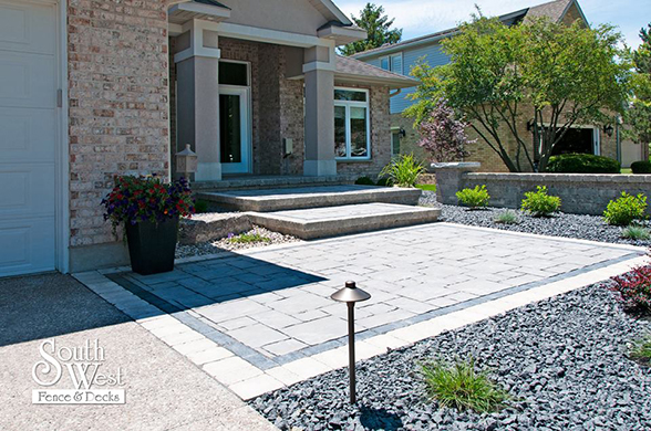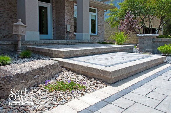 This week’s feature project, designed and installed by South West Fence & Decks, is a majestic, multi-level, UniLock stone porch and walkway. Other project features include a stone accent wall, roadside pillars, large natural landscaping rocks, and professional landscaping with lighting.