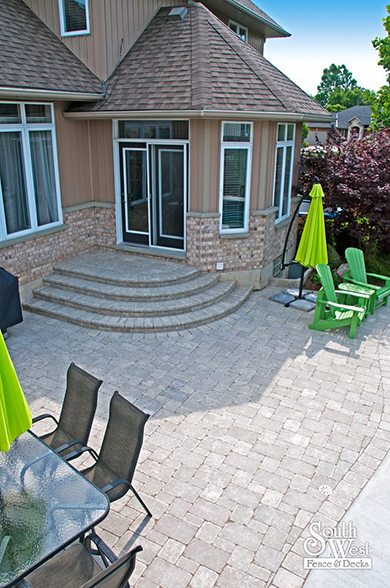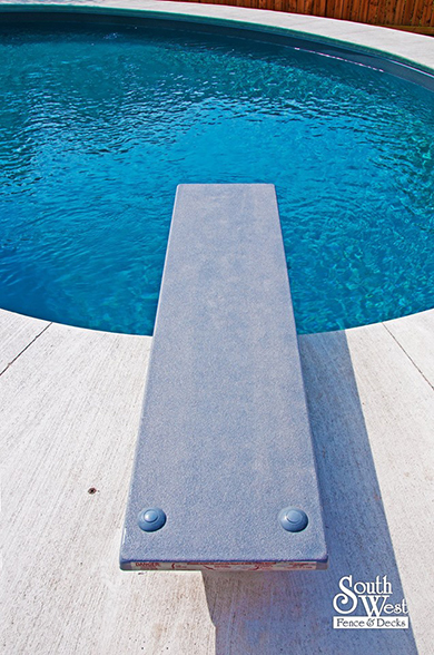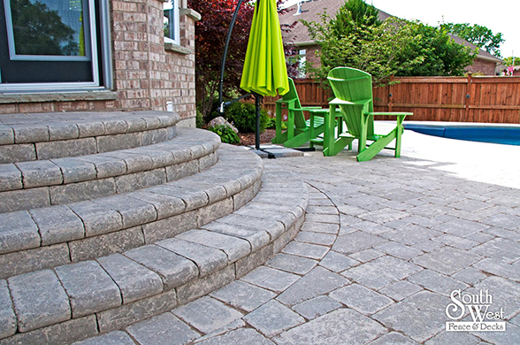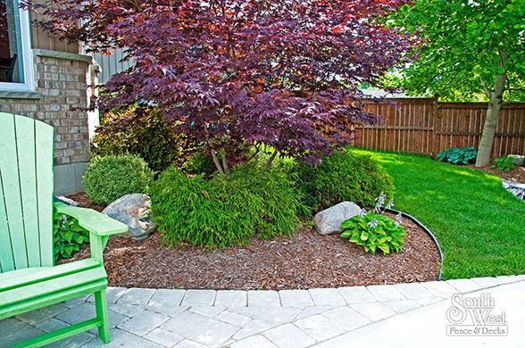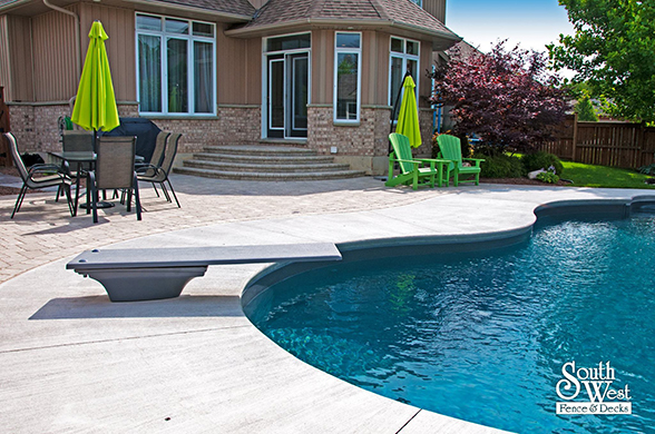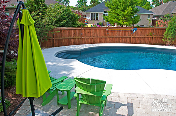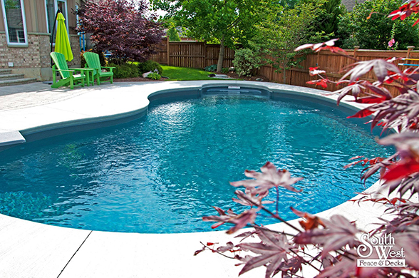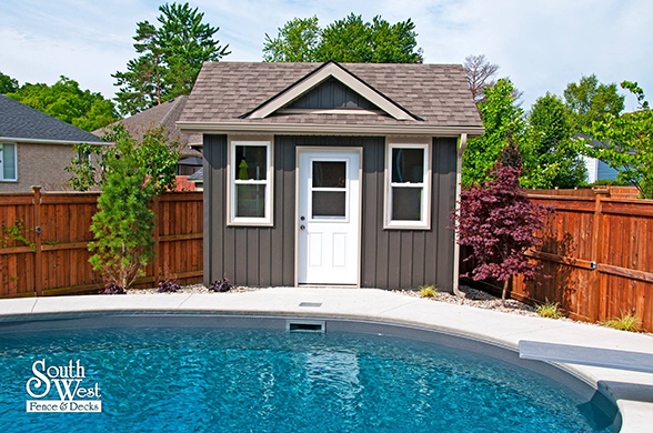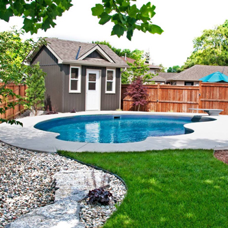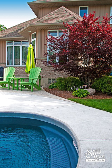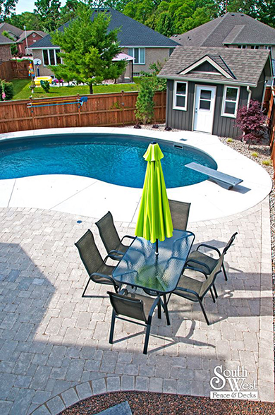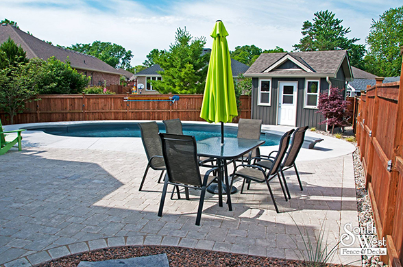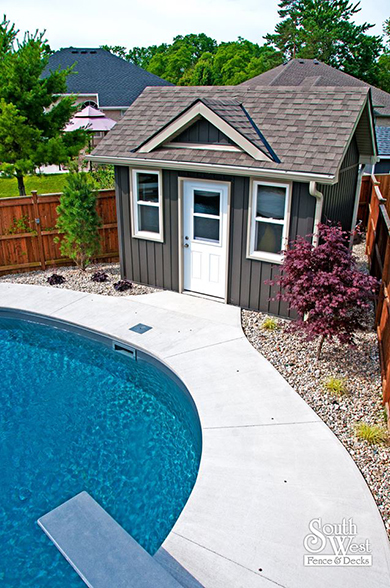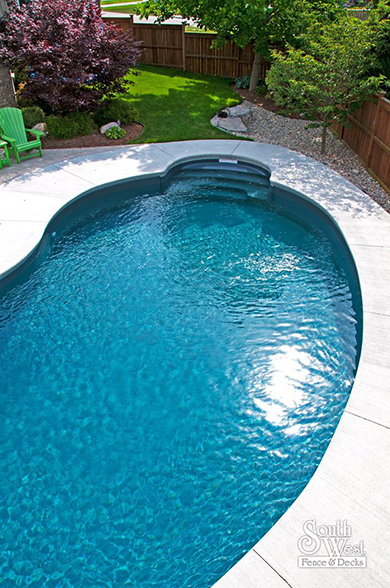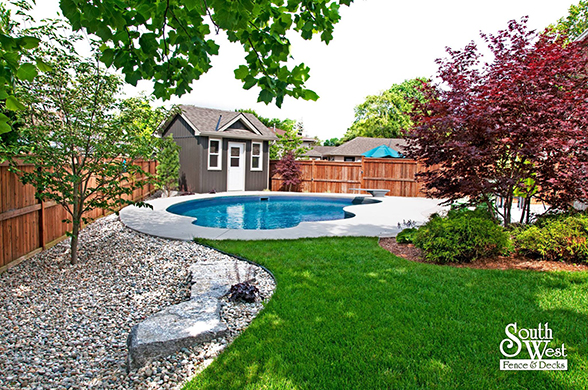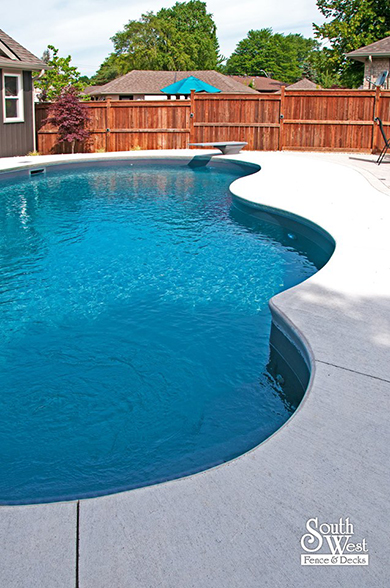 This inviting ’Complete Backyard’ project designed and installed by South West Fence & Decks includes a shapely in-ground pool with a concrete deck, stone patio with contoured stairs, beautiful shed with vertical siding, stone walkway, and landscaping.