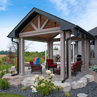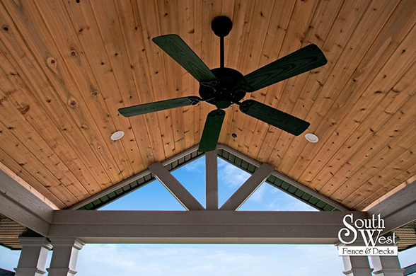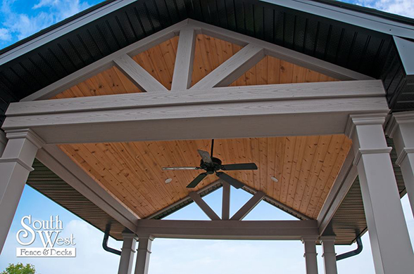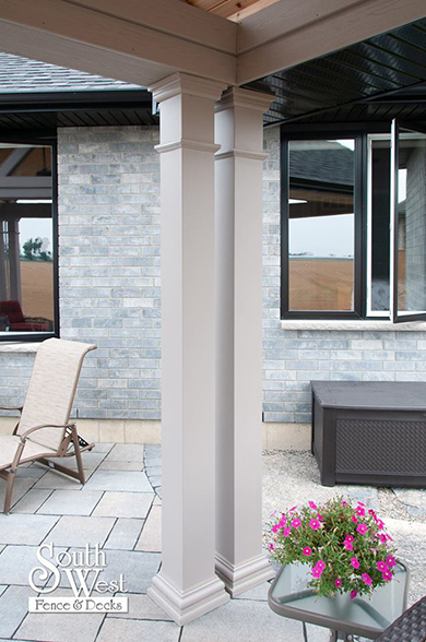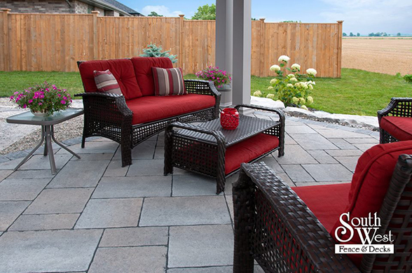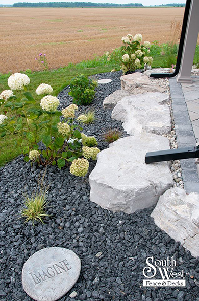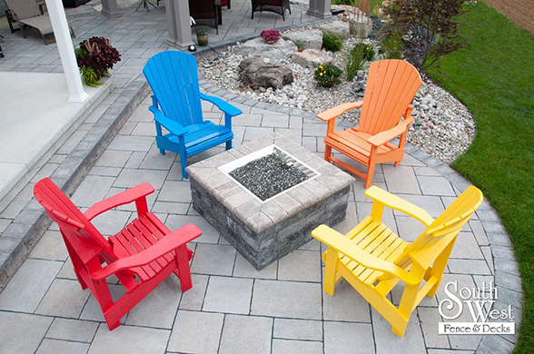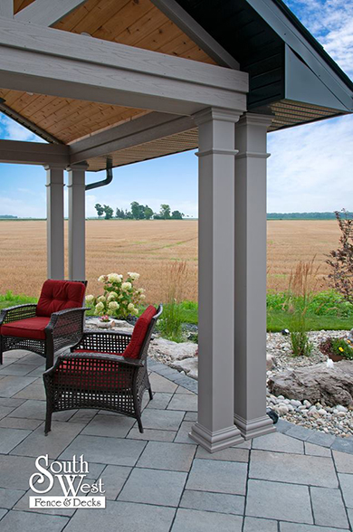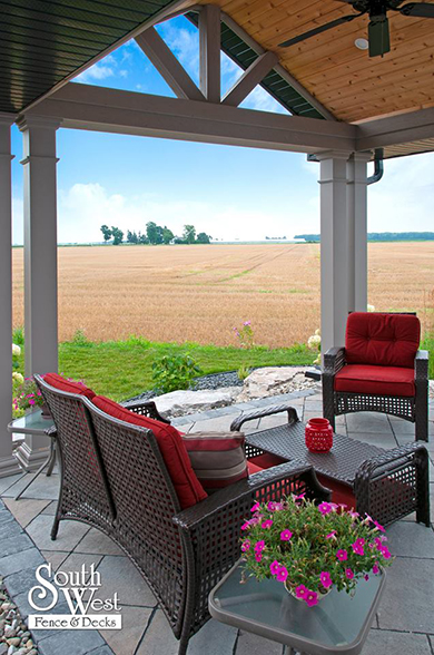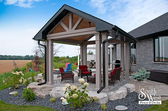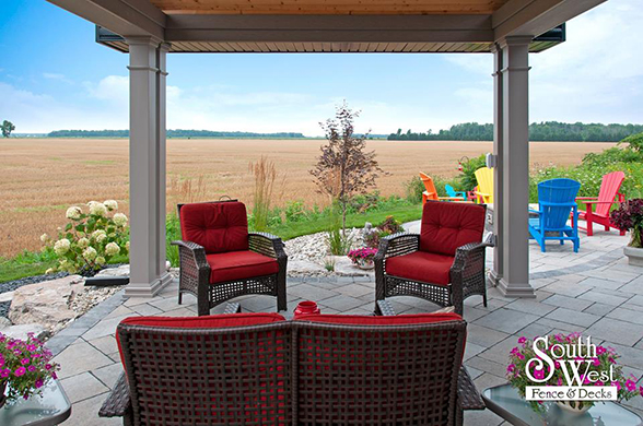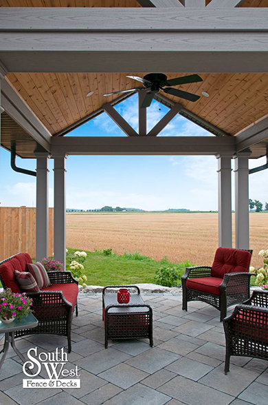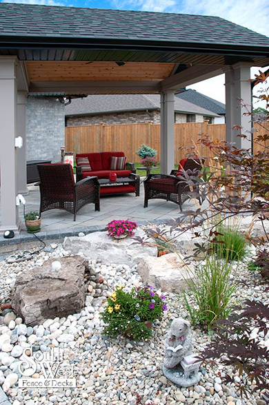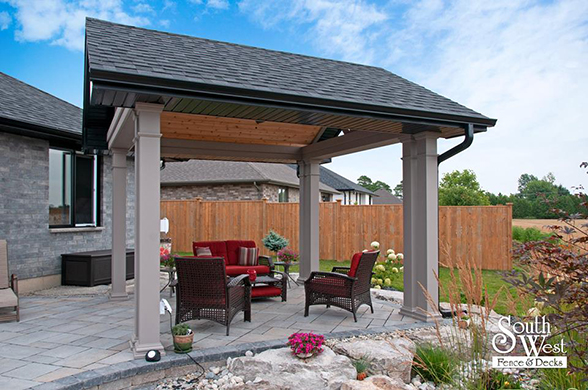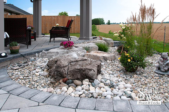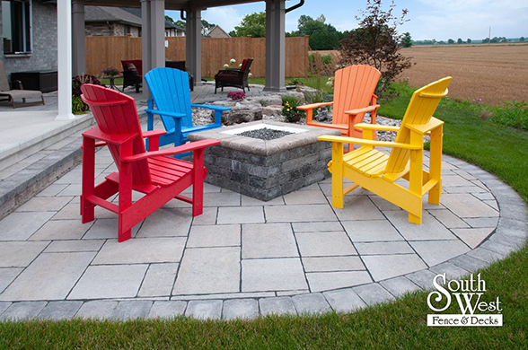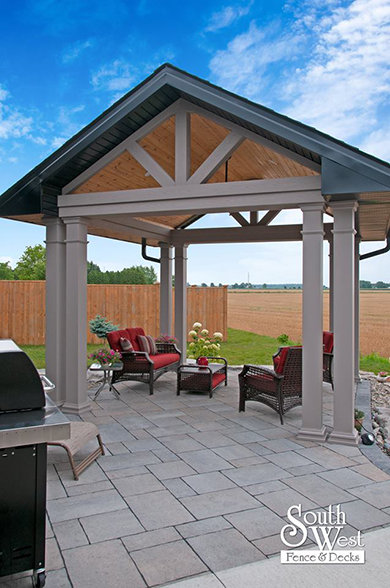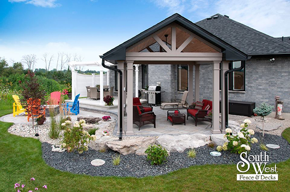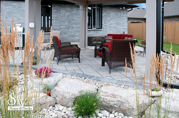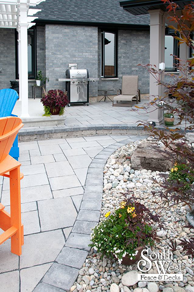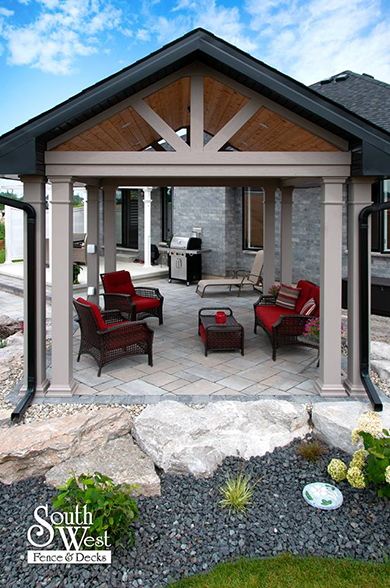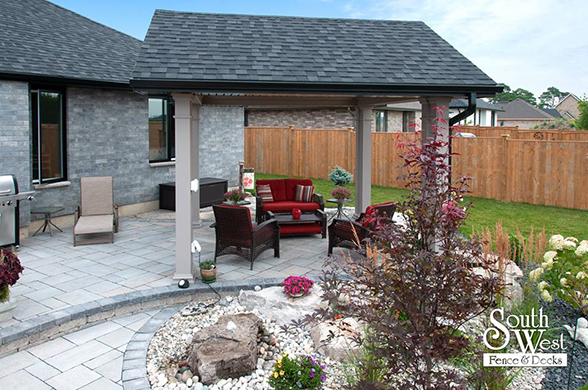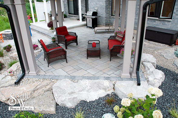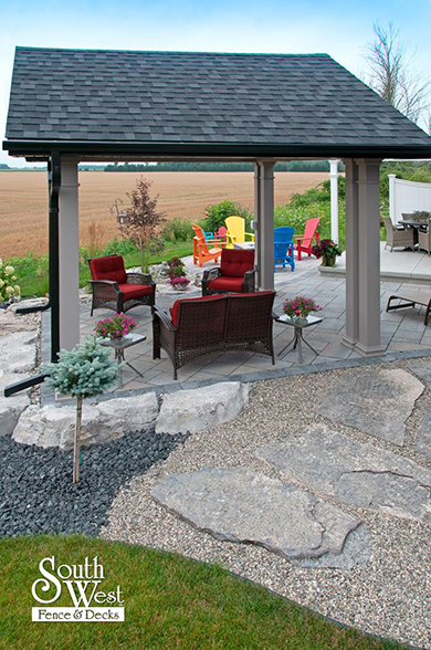 Another multifaceted backyard project designed and installed by South West Fence & Decks. Project features (excluding white pergola), include a beautiful 8-pillar cabana with ceiling fan and lighting, a contoured multi-level UniLock stone patio with armour stone retaining walls, a modern fire feature, a stone walkway and gorgeous landscaping.