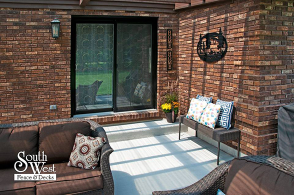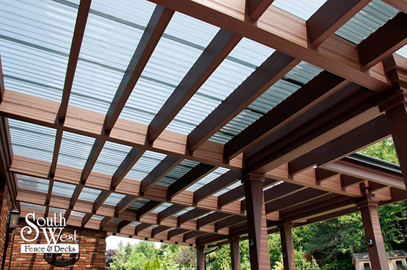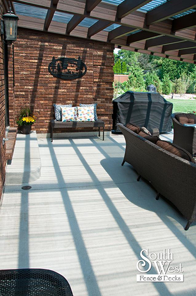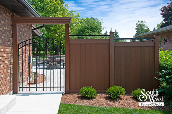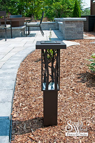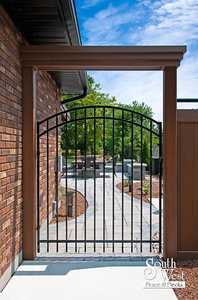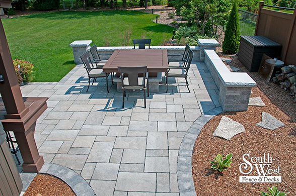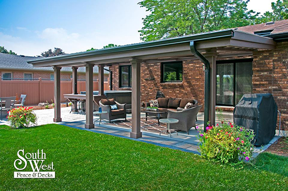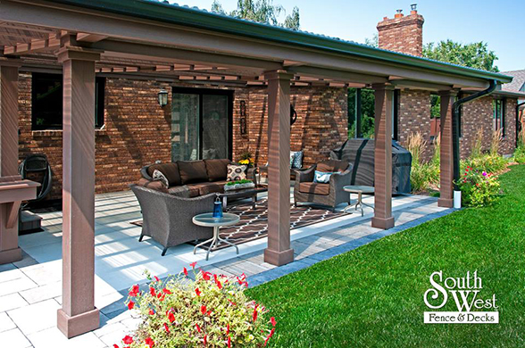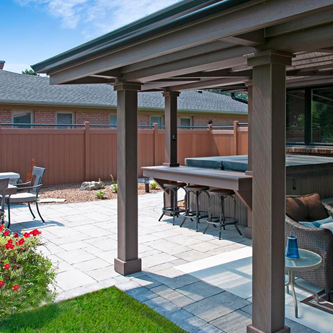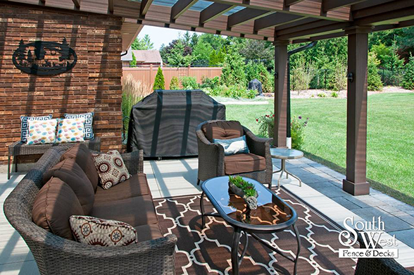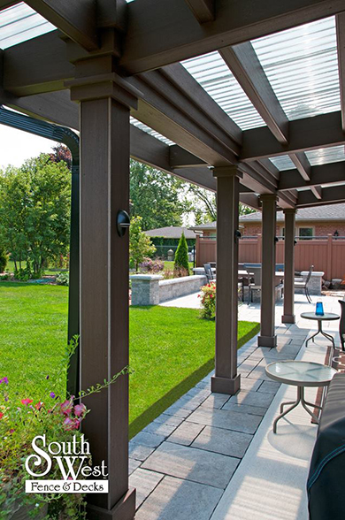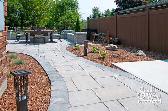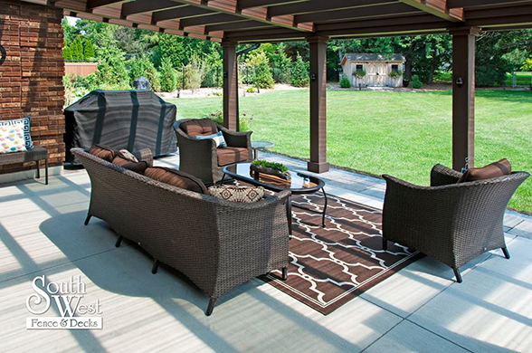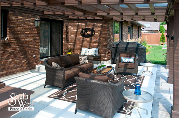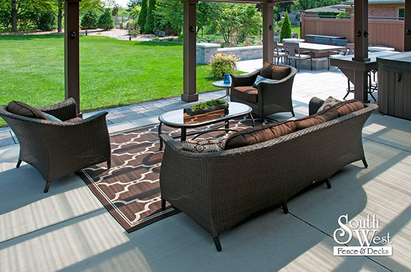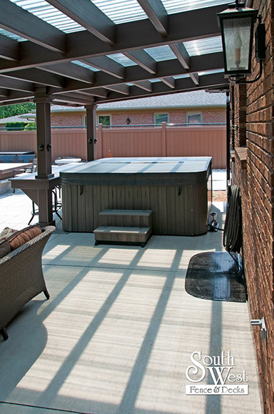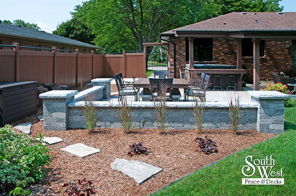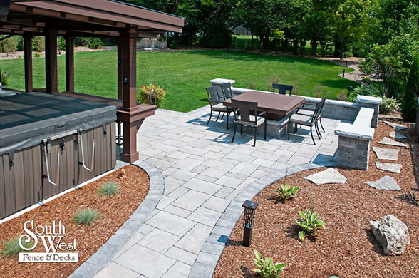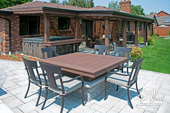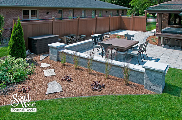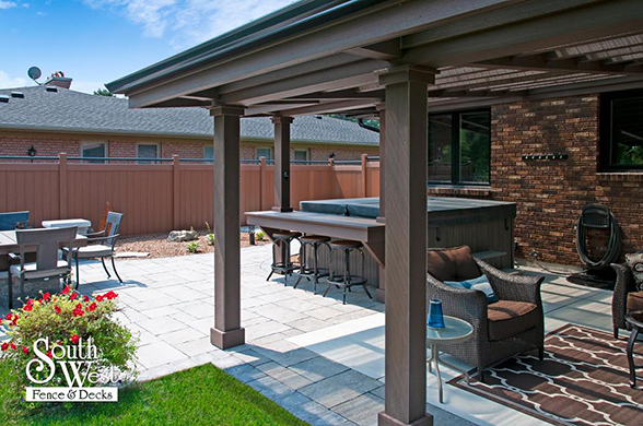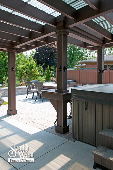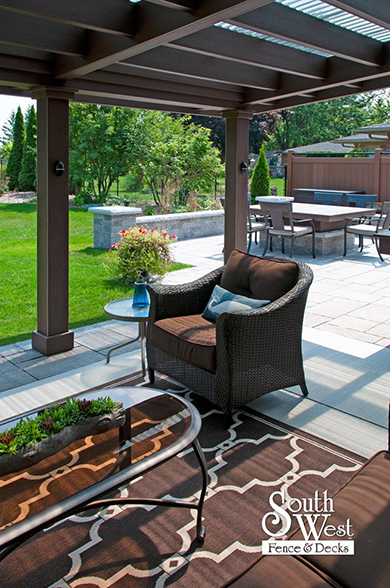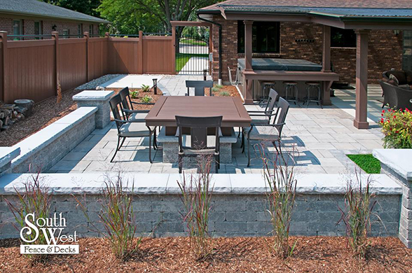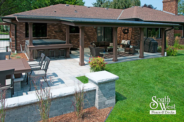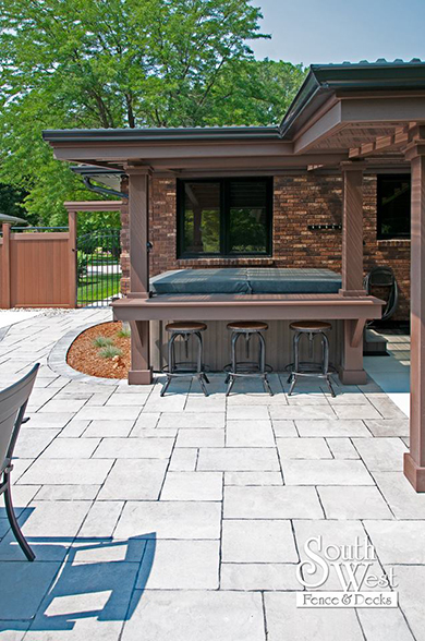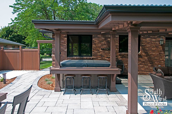 This week’s feature project is a stunning backyard project designed and installed by South West Fence & Decks. Project features include a UniLock stone patio with an overhead Azek structure including a hot tub/bar feature with lighting. Other project features include stone accent wall with coping, stone fire feature with a custom Azek table, stone and concrete walkways, custom vinyl fence with pipe topper and ornamental iron gate, landscaping and lighting.