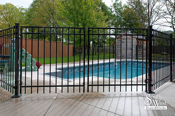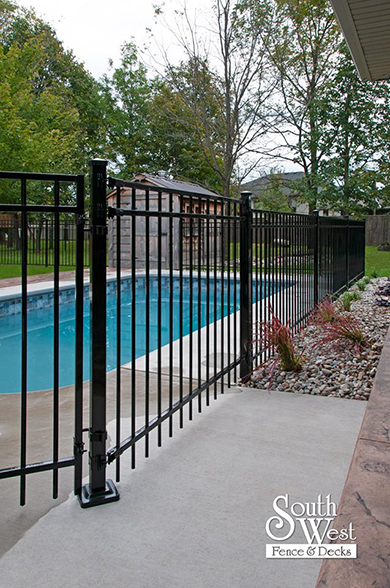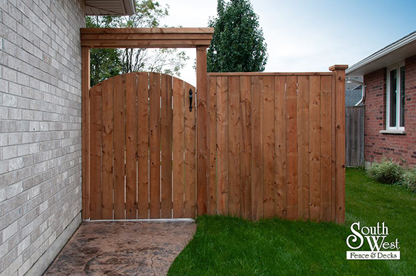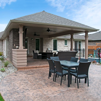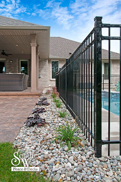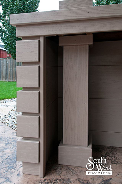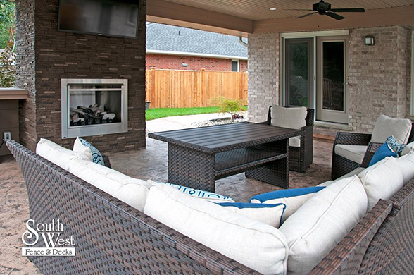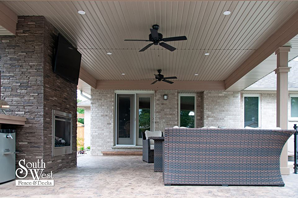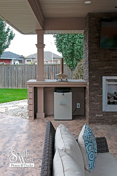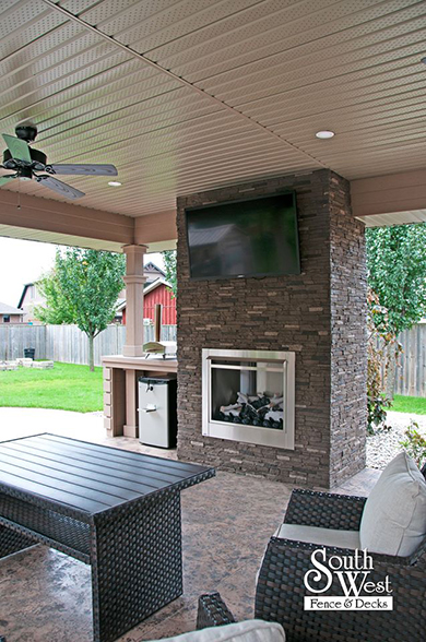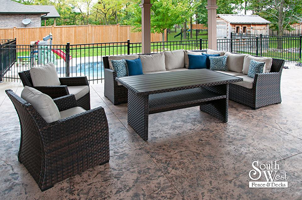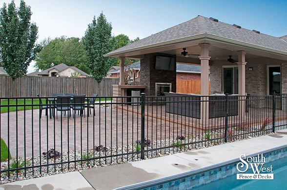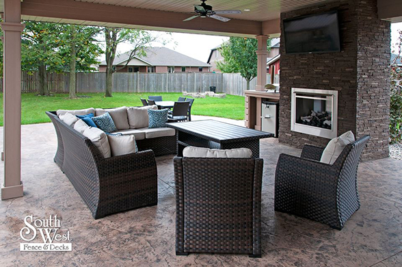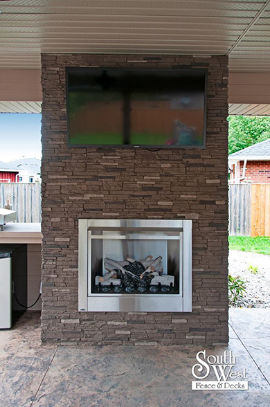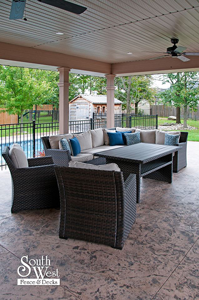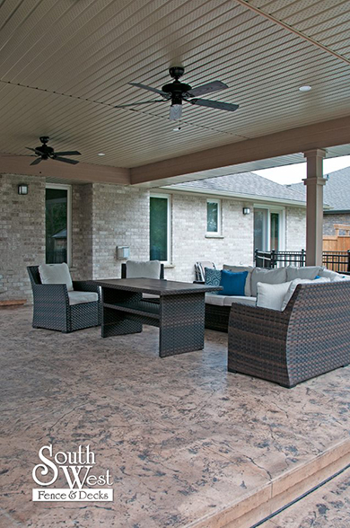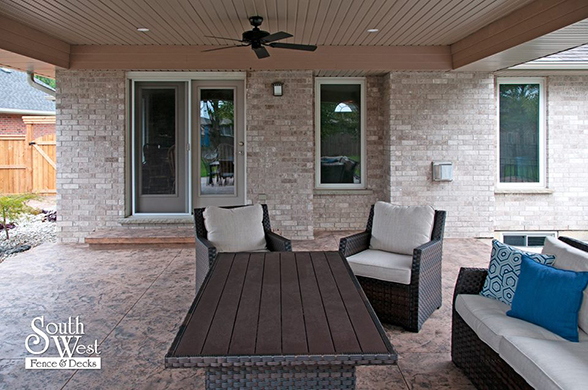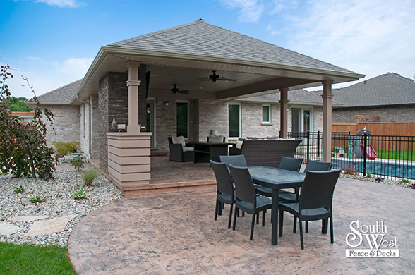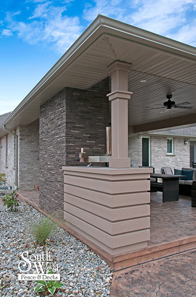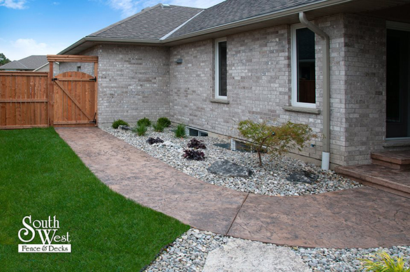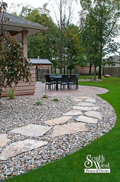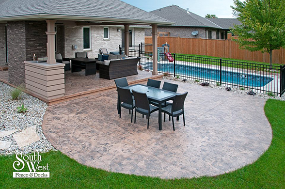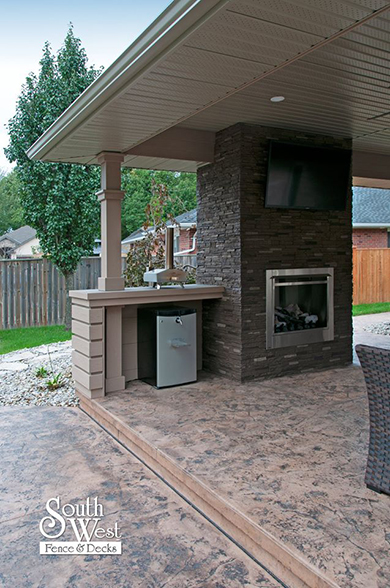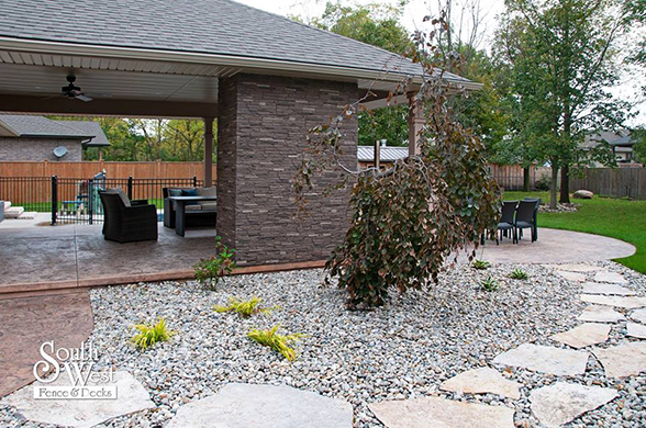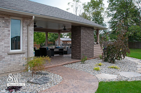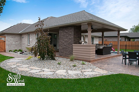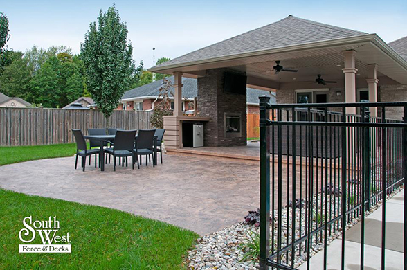 This week’s feature project designed and installed by South West Fence & Decks is a beautiful cottage-style roof structure with a multi-level stamped concrete patio, steps and walkway. Other project features include a natural gas fire feature/veneer, low-maintenance Azek serving counter, ornamental iron and wood fencing with gates, professional landscaping with a flagstone walkway.