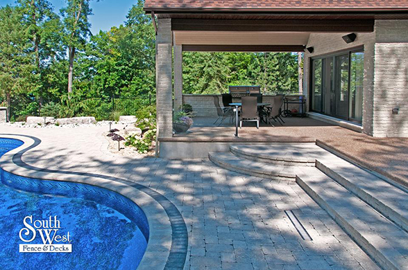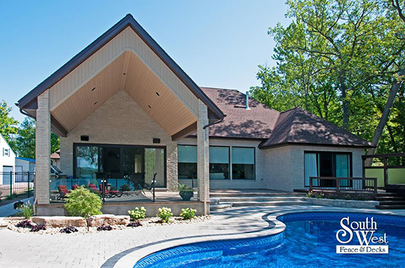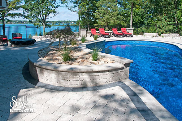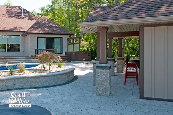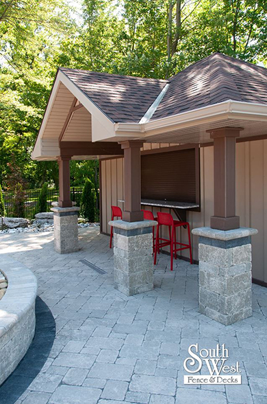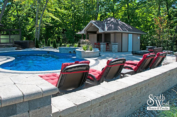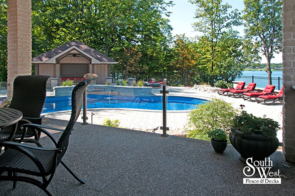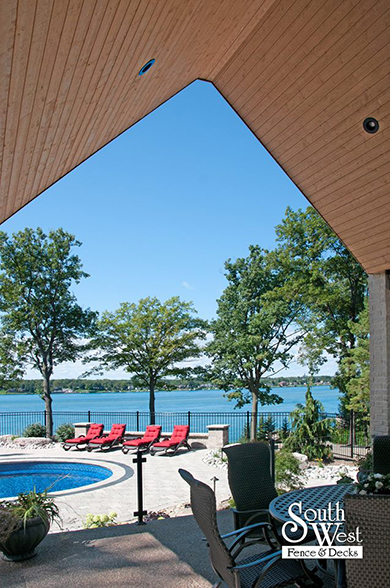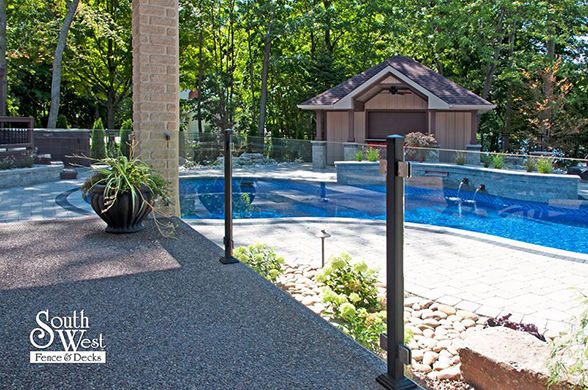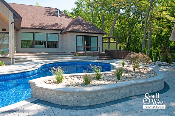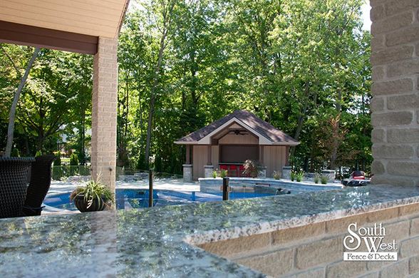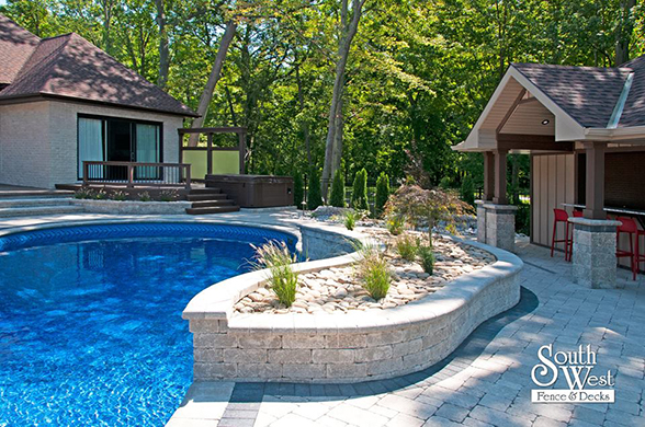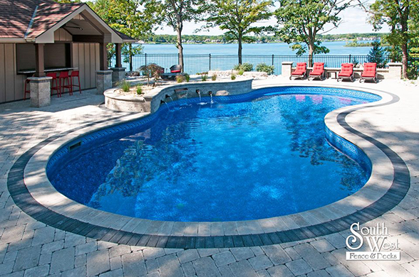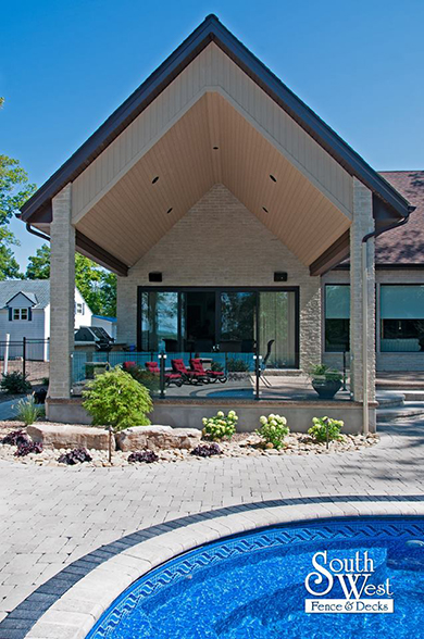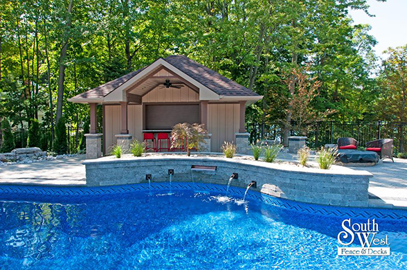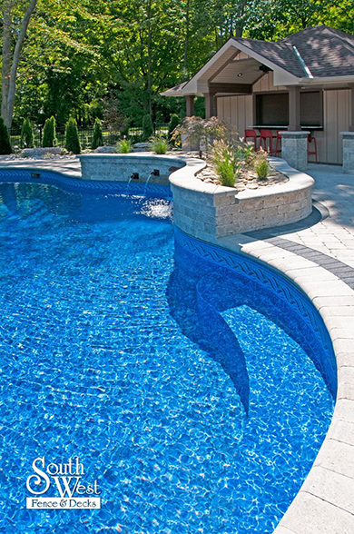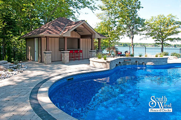 This week’s feature project, designed and installed by South West Fence & Decks, is a majestic, complete backyard including a 40' Mountain Lake pool with a water feature and a lift island garden bed landscaping with retaining wall, a low-maintenance deck with a frosted glass privacy screen and a triple-profile overhead beam, supplied and installed hot tub, a custom structure/shed with shower and granite bar countertop. Other features include Unilock stone pool decking, walkways, steps and retaining walls, natural gas fire feature, rail-less glass, granite countertops, ornamental iron fence, low voltage lighting, flagstone walkway, and landscaping.