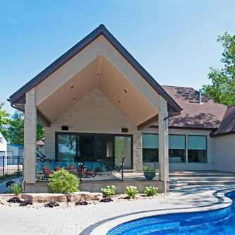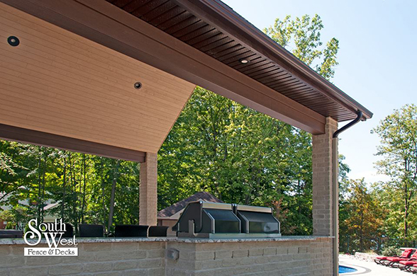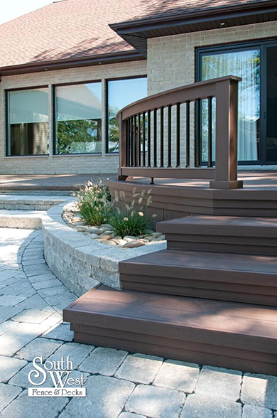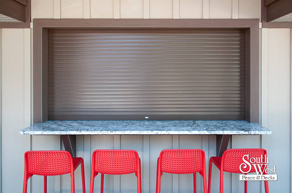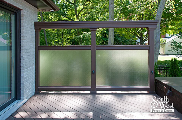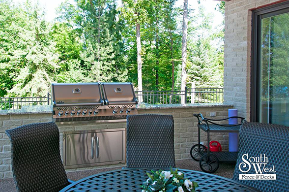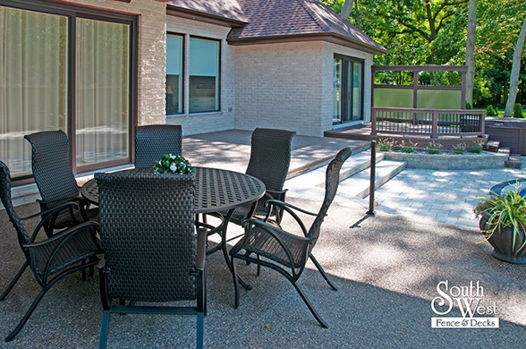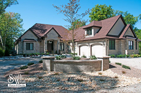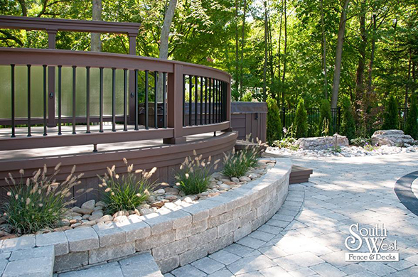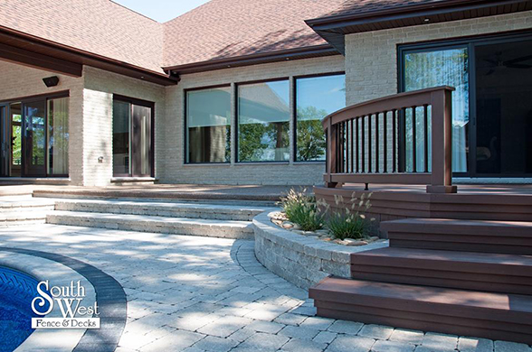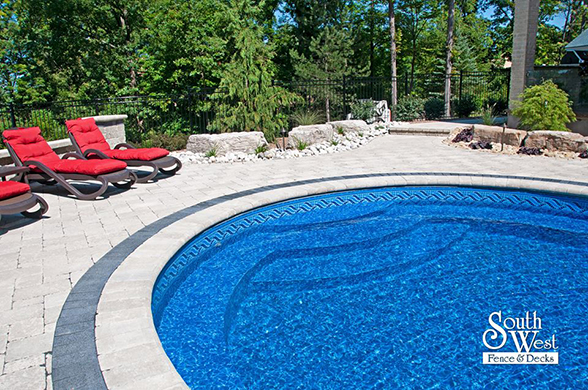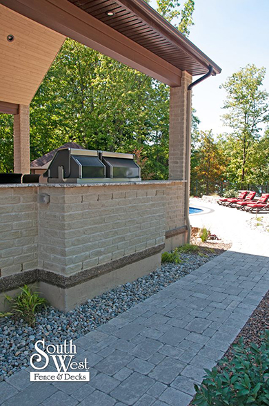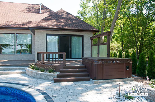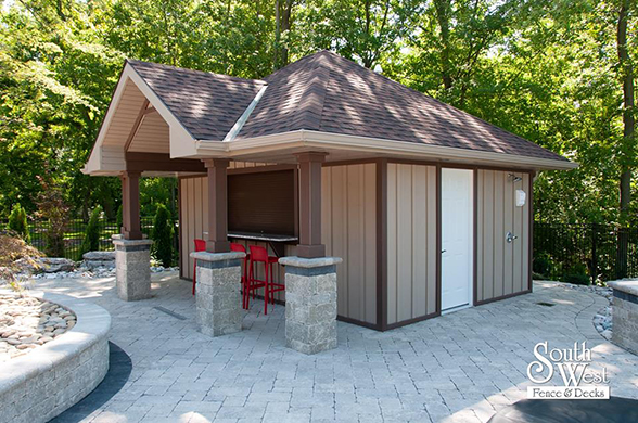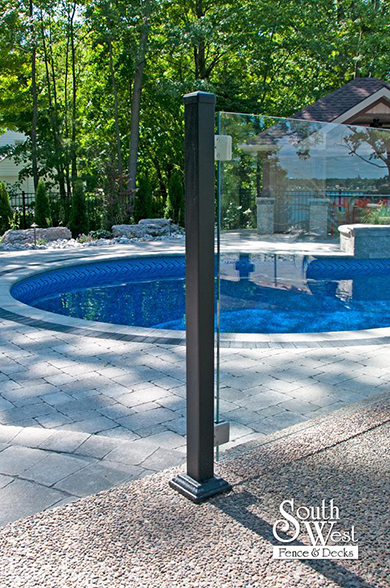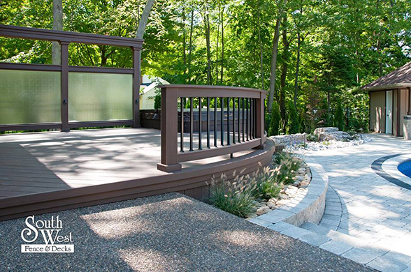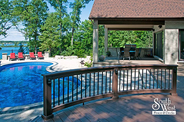 This week’s feature project, designed and installed by South West Fence & Decks, is a majestic, complete backyard including a 40' Mountain Lake pool with a water feature and a lift island garden bed landscaping with retaining wall, a low-maintenance deck with a frosted glass privacy screen and a triple-profile overhead beam, supplied and installed hot tub, a custom structure/shed with shower and granite bar countertop. Other features include Unilock stone pool decking, walkways, steps and retaining walls, natural gas fire feature, rail-less glass, granite countertops, ornamental iron fence, low voltage lighting, flagstone walkway, and landscaping.