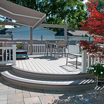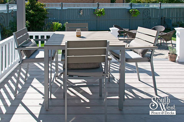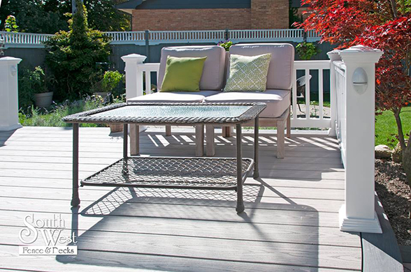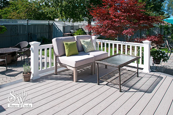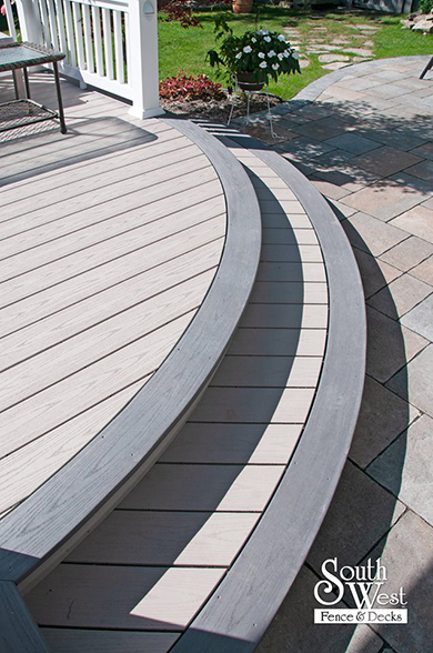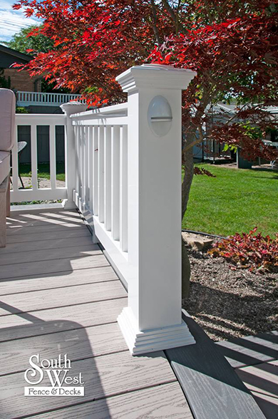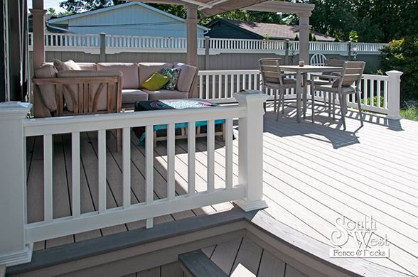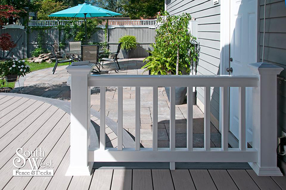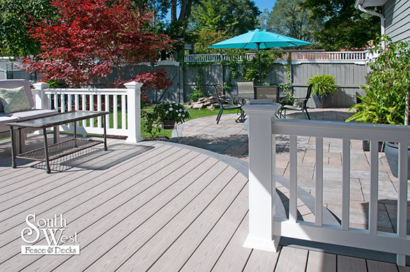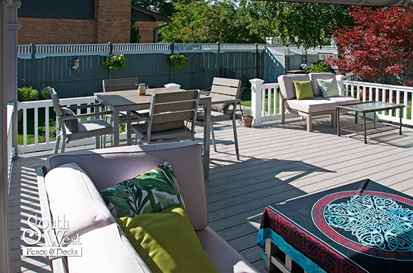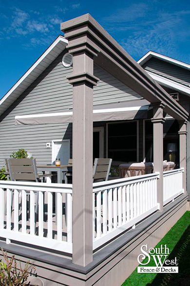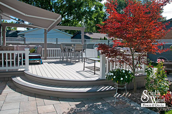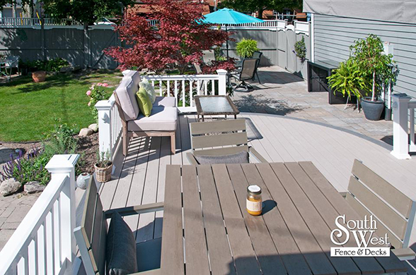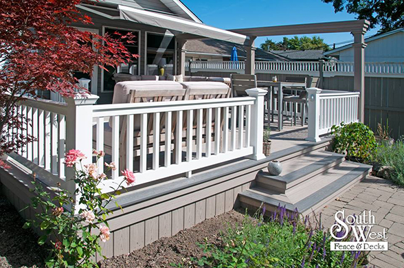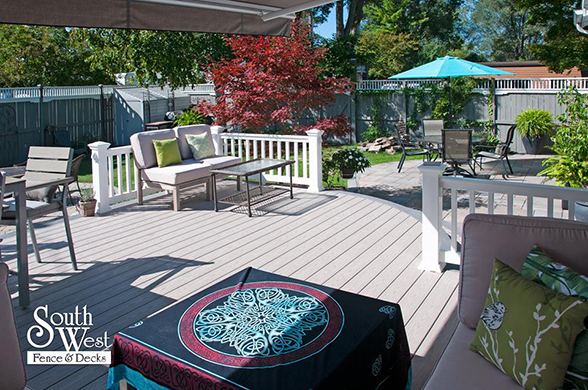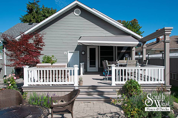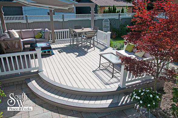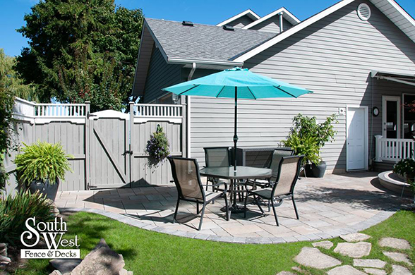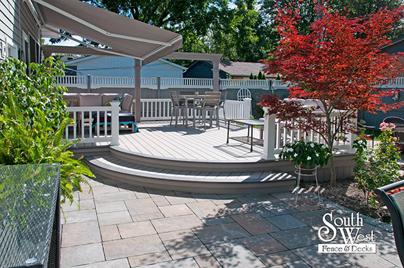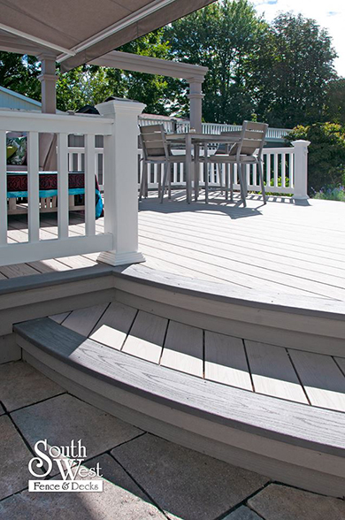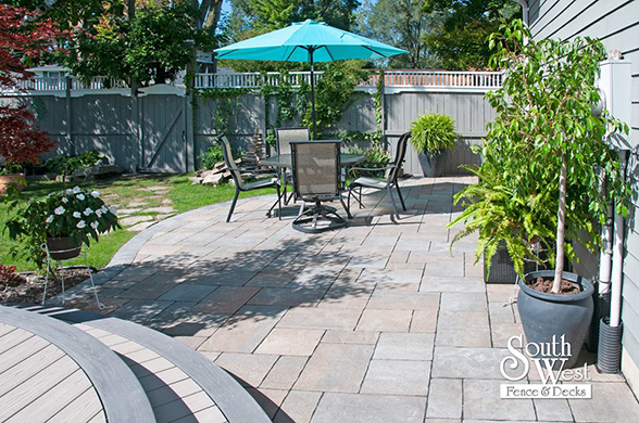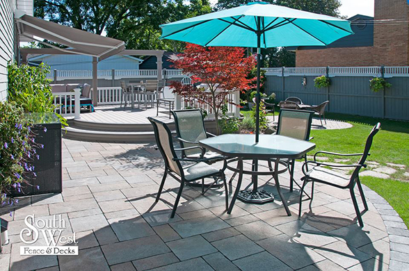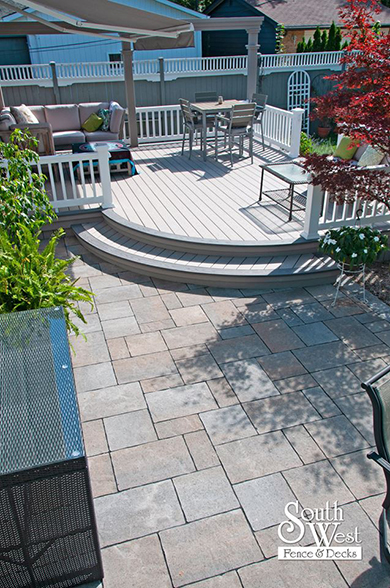 This week’s feature backyard project designed and installed by South West Fence & Decks includes a beautiful Unilock stone patio, and a two-tone, low-maintenance Azek deck accented with white vinyl railings, a triple profile overhead beam, contoured steps, and post lighting.