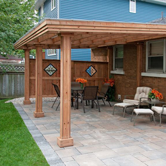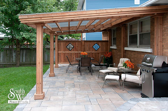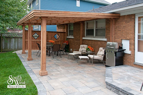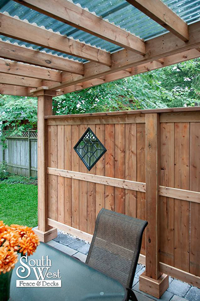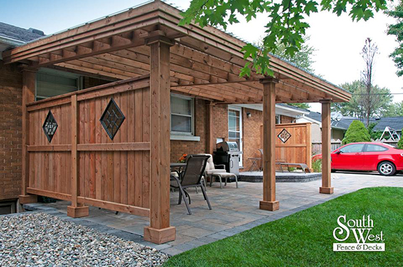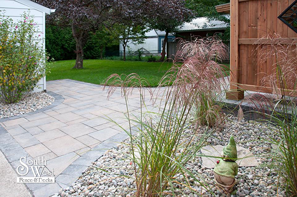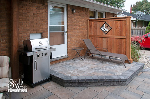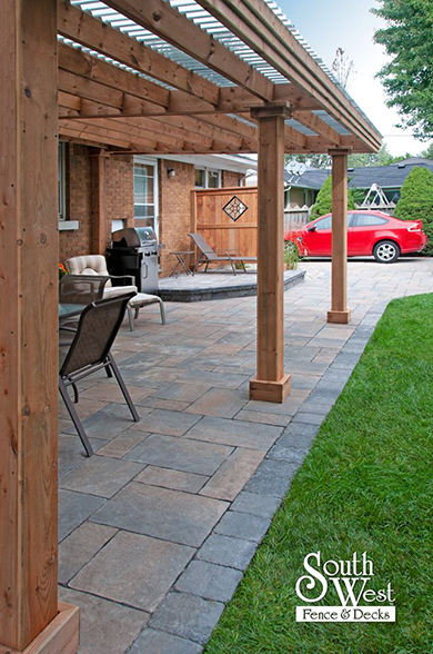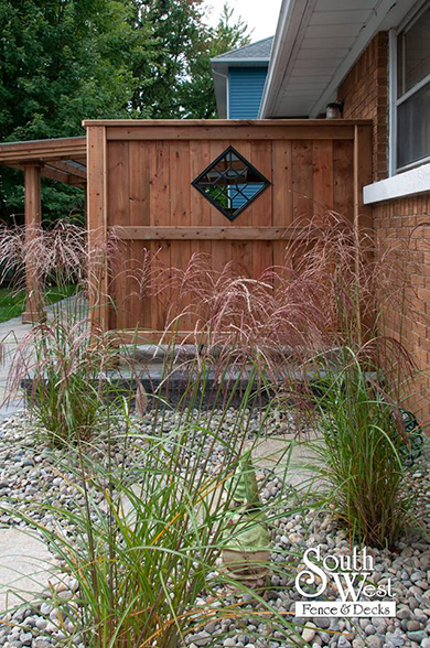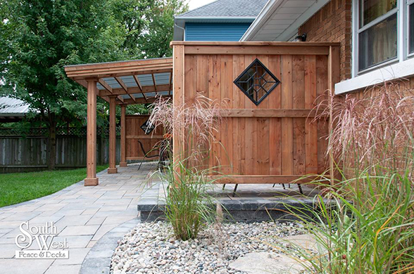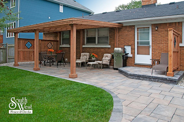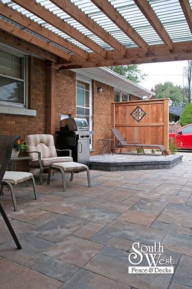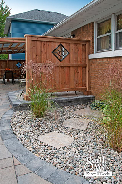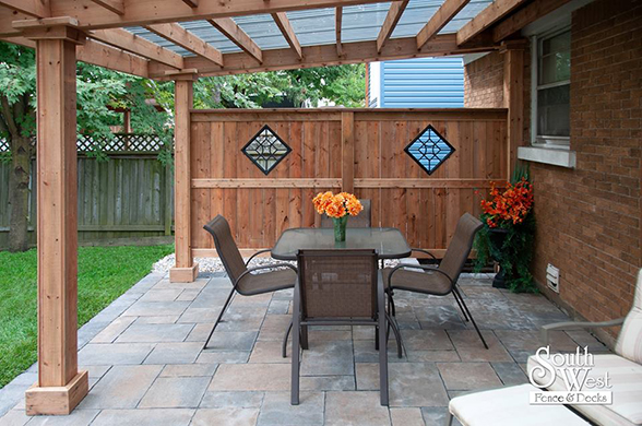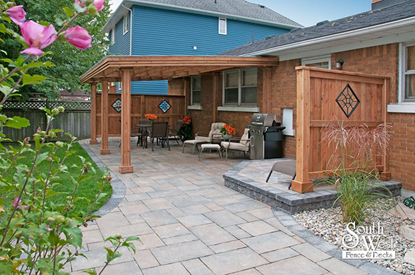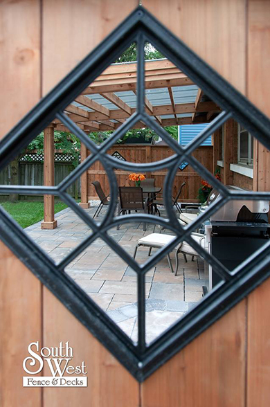 This week’s feature project, designed and installed by South West Fence & Decks, is a charming multi-level, UniLock stone patio and walkway, a pressure-treated Sun Tuff shade pergola structure, and multiple privacy screens with ornamental iron window inserts. Other project features include a flagstone walkway and landscaping.