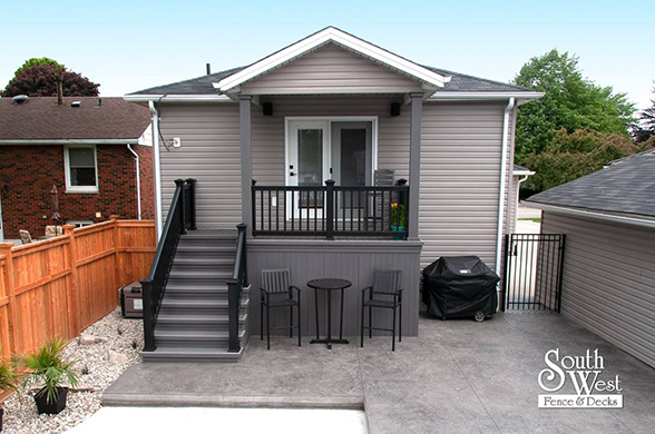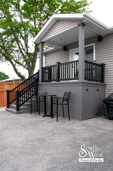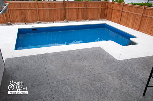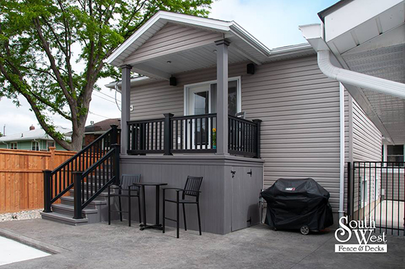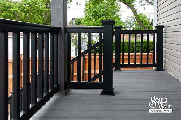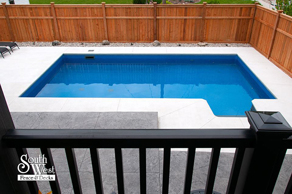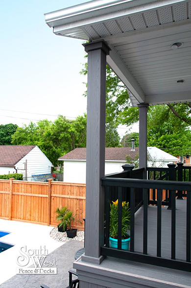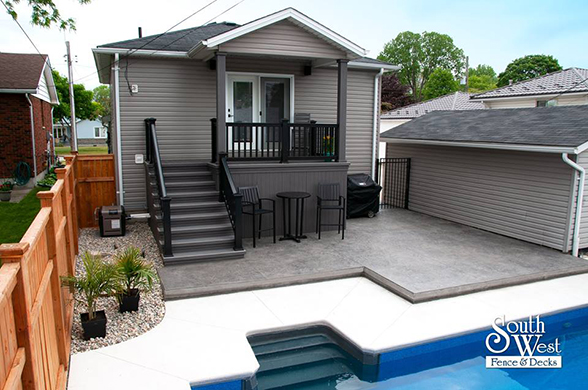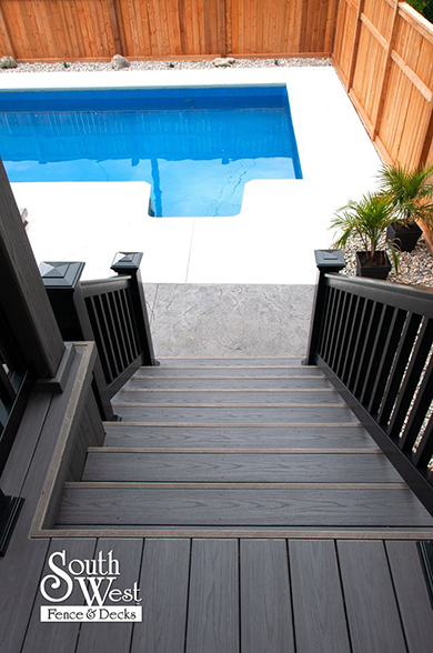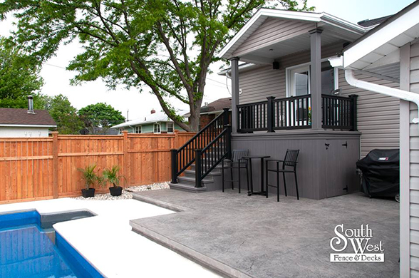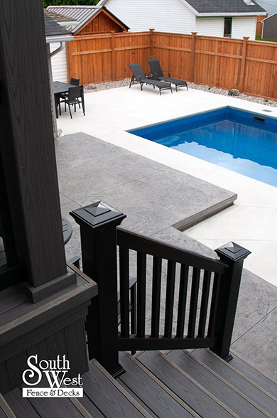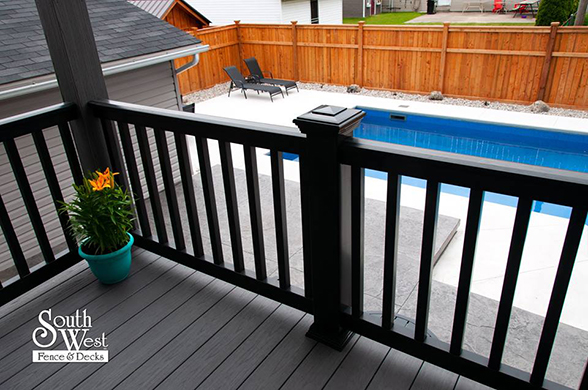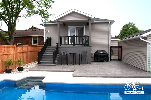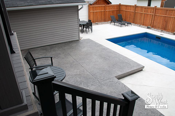 This week’s feature project designed and installed by South West Fence & Decks is a beautiful low-maintenance balcony deck with a roof structure and black vinyl railings. Other project features include a 14 x 26 sports pool with a concrete pool deck, a stamped concrete patio, landscaping, and pressure-treated wood fencing with an ornamental rod iron gate.