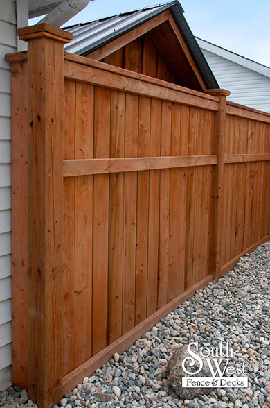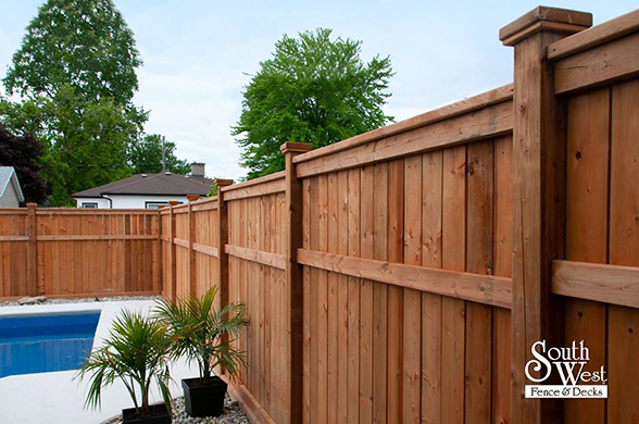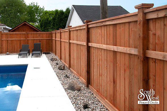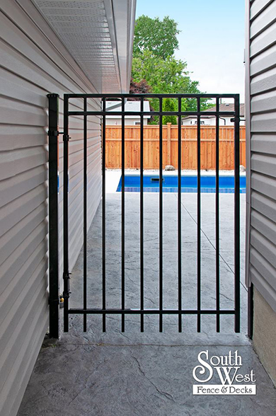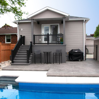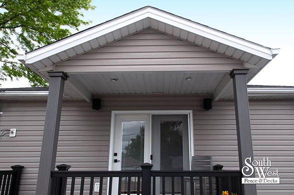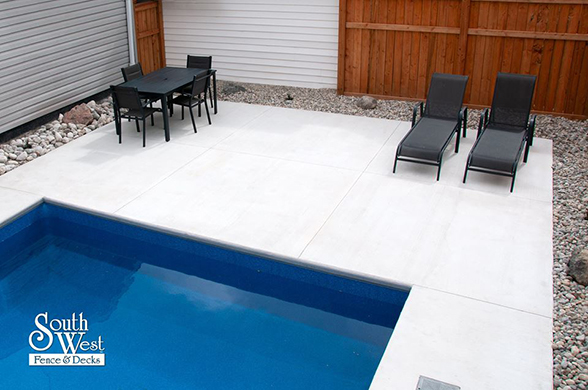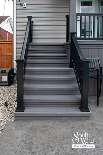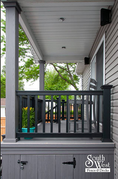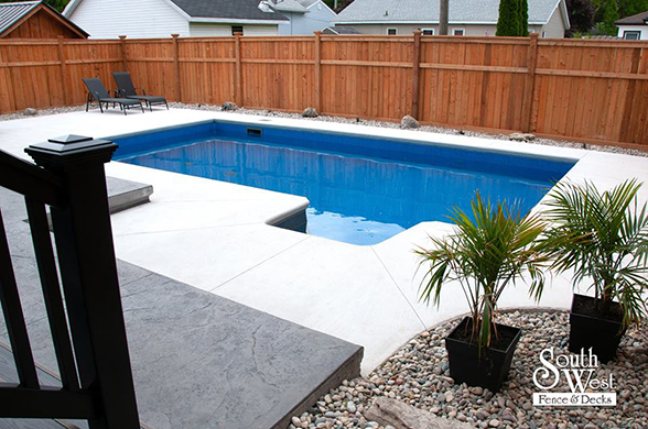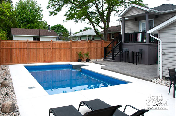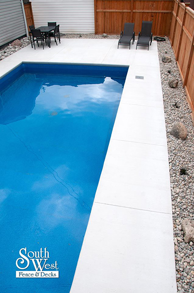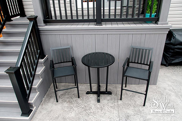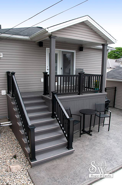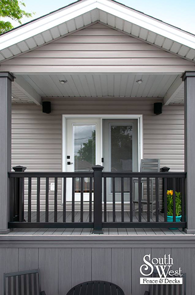 This week’s feature project designed and installed by South West Fence & Decks is a beautiful low-maintenance balcony deck with a roof structure and black vinyl railings. Other project features include a 14 x 26 sports pool with a concrete pool deck, a stamped concrete patio, landscaping, and pressure-treated wood fencing with an ornamental rod iron gate.