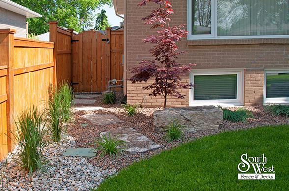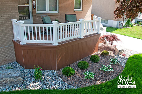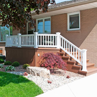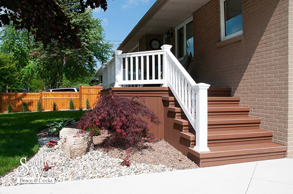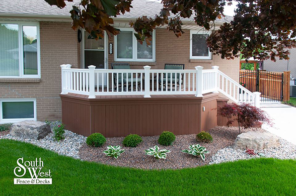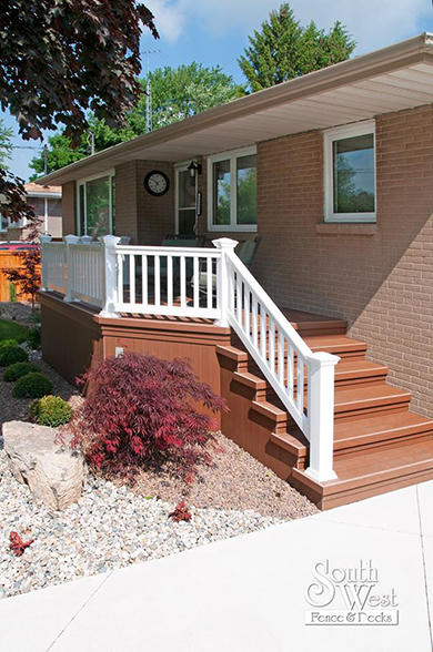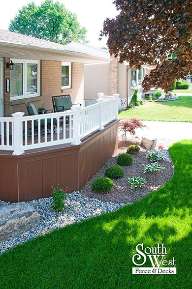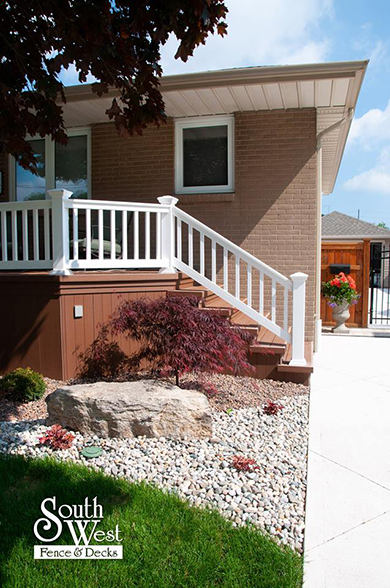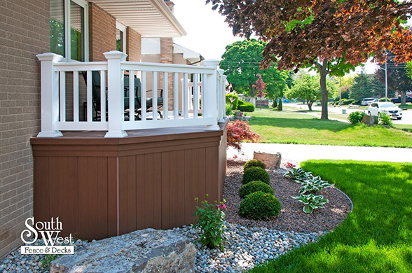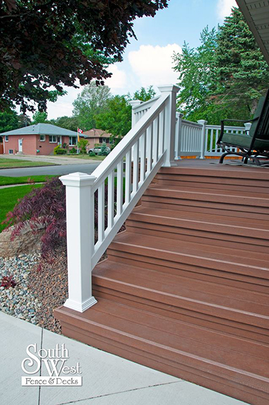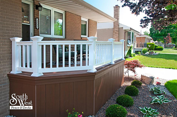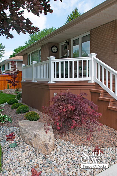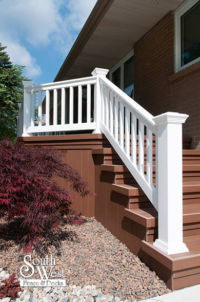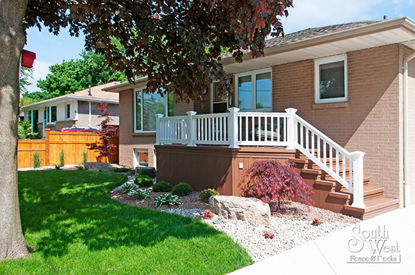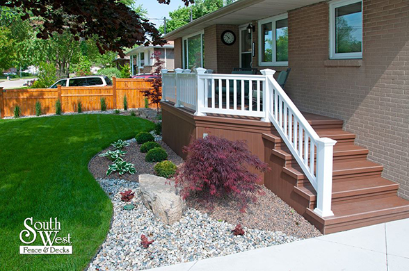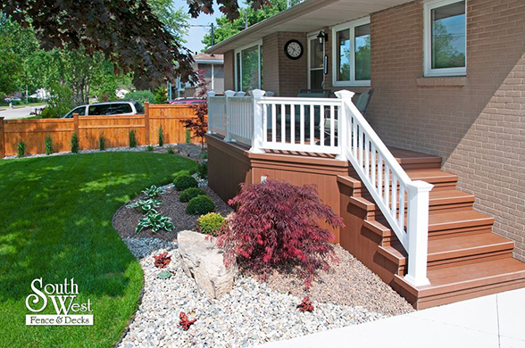 This week’s feature project designed and installed by South West Fence & Decks is a low-maintenance Azek front porch with white vinyl railings. Other project features include a pressure-treated fence and gate, and professional landscaping including a stone walkway.