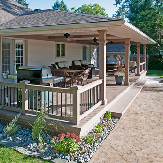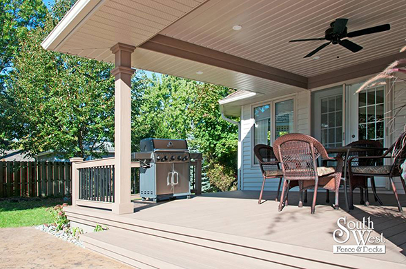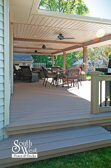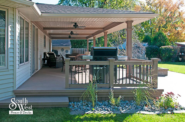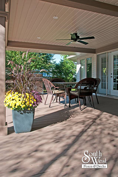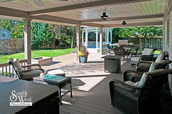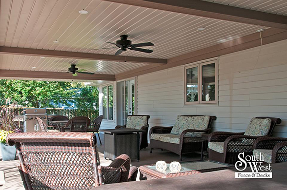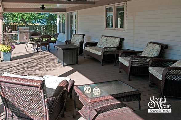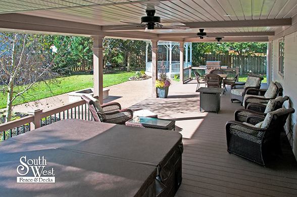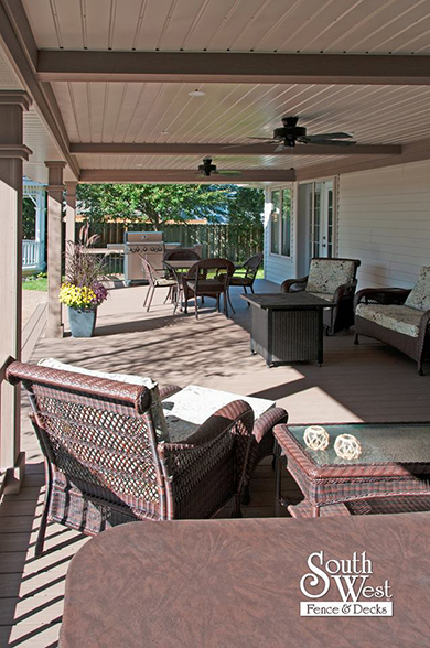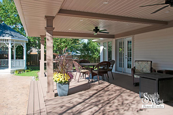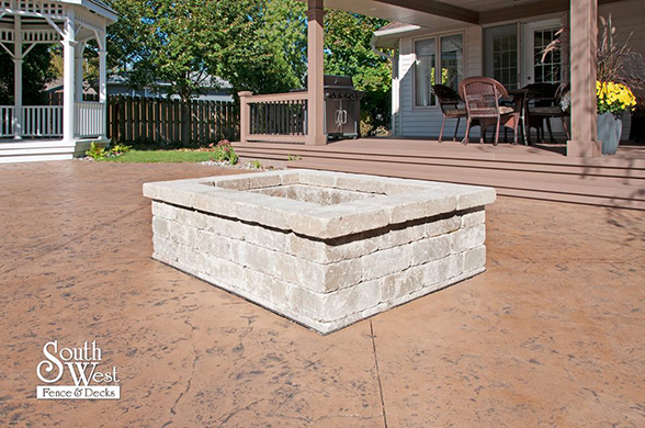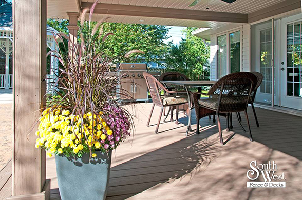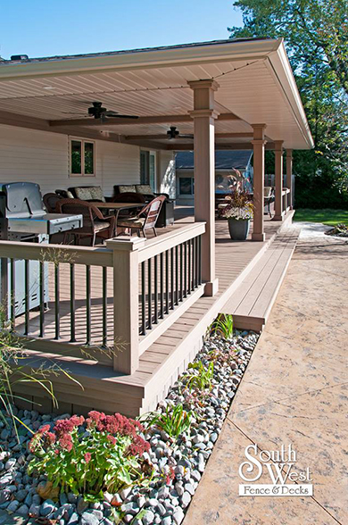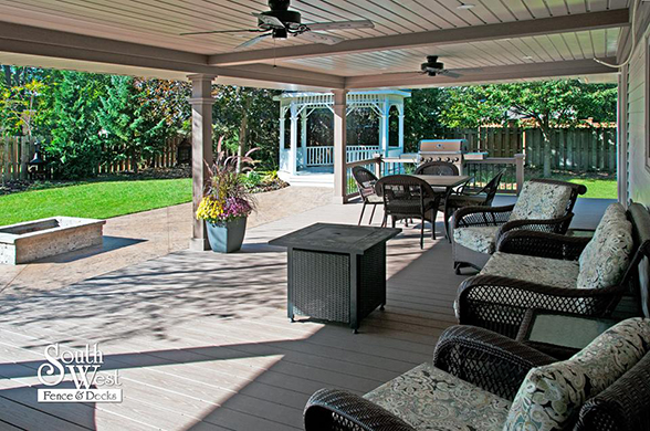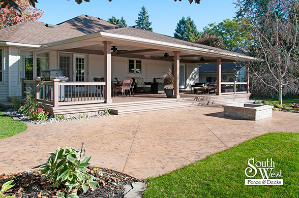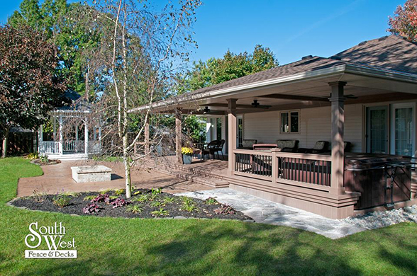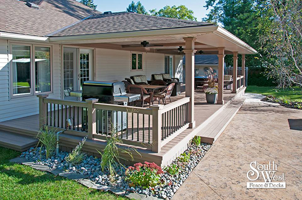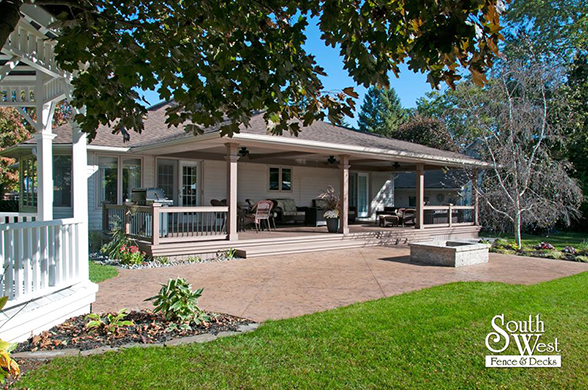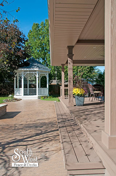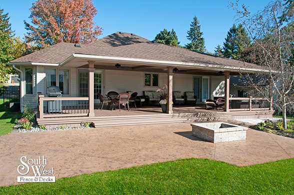 This week’s feature project designed and installed by South West Fence & Decks is a majestic, low-maintenance Azek deck with roof structure, and black ornamental rod iron balusters. Other project features include a patio door and hot tub supply and installation, stamped concrete patio and a custom stone fire pit feature.