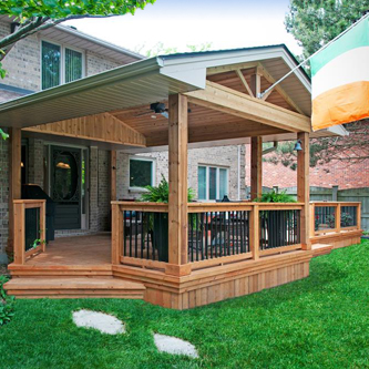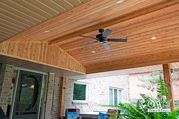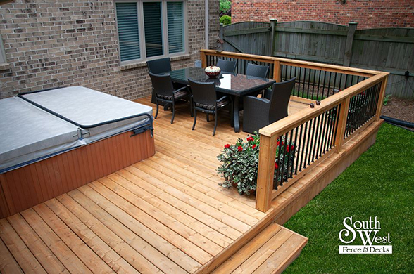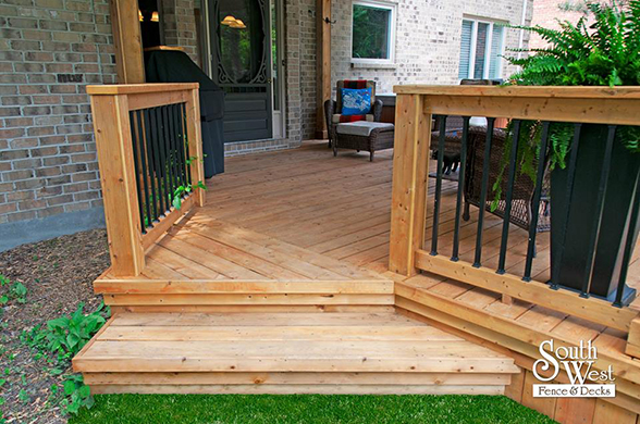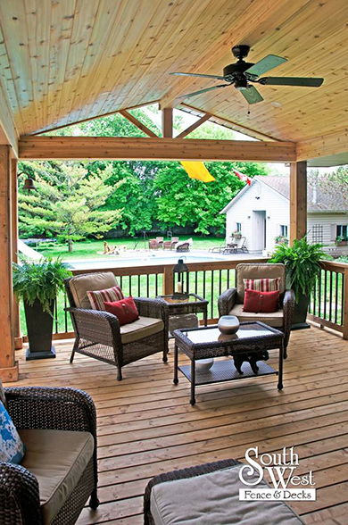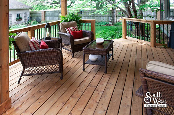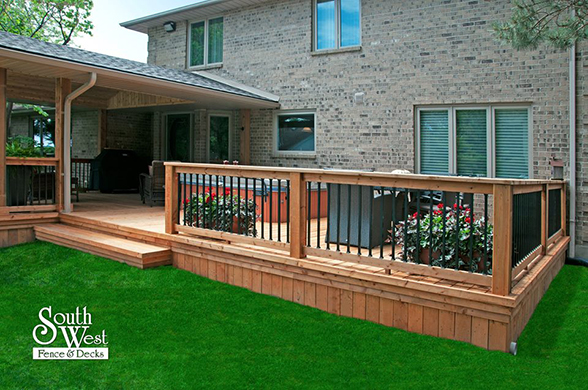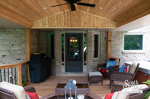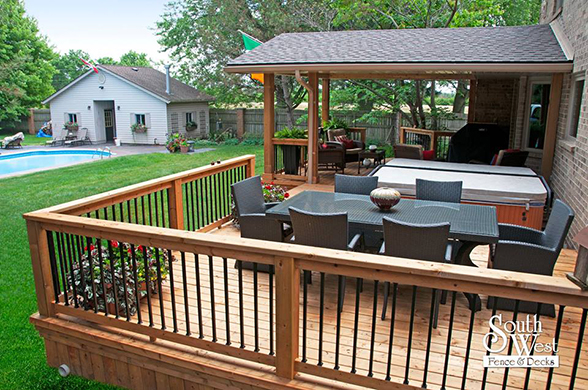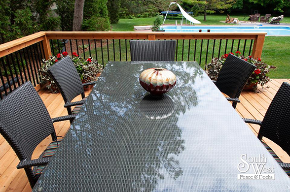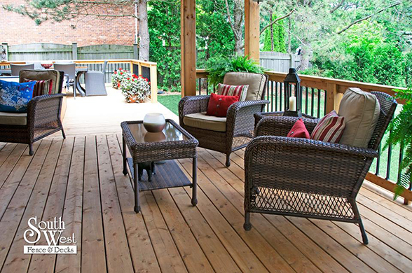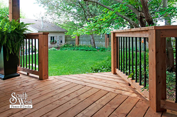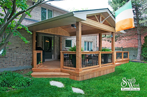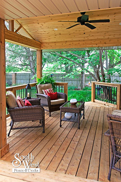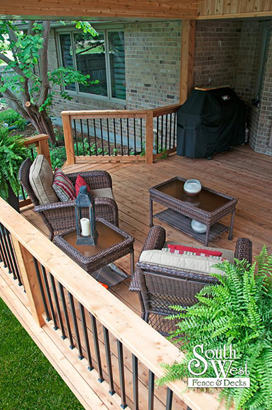 This week’s feature project designed and installed by South West Fence & Decks is a pressure-treated wood deck with a custom roof structure and ornamental rod iron balusters.