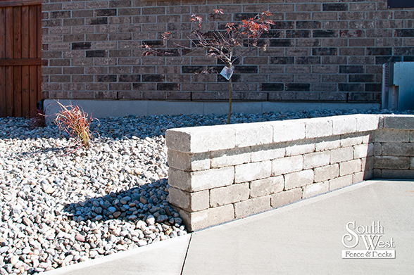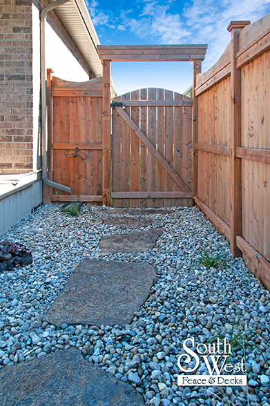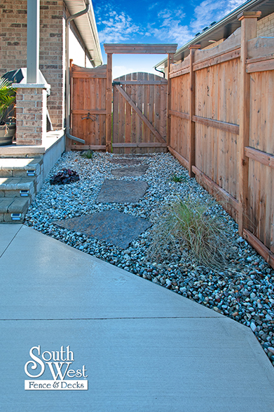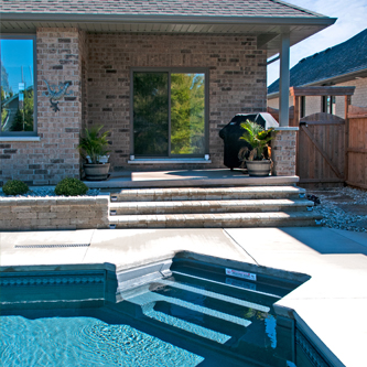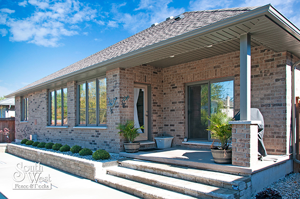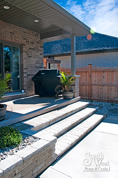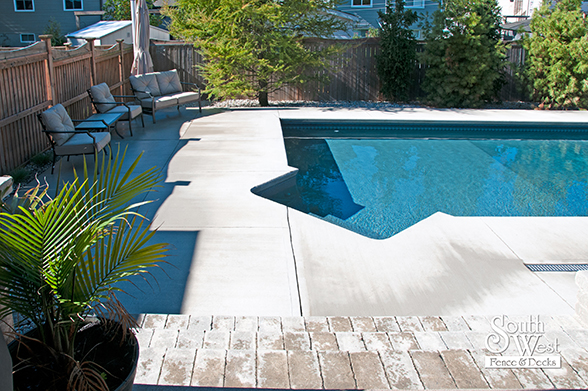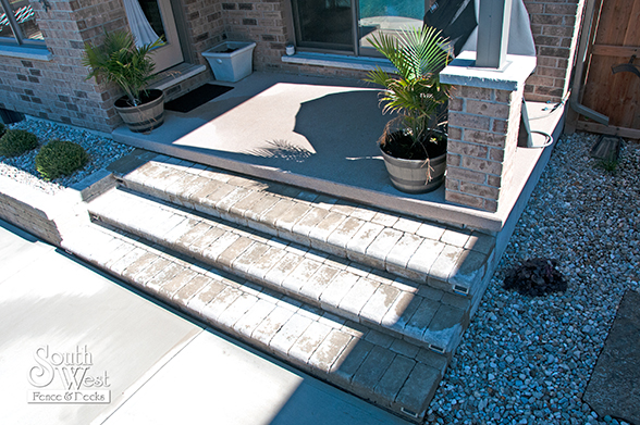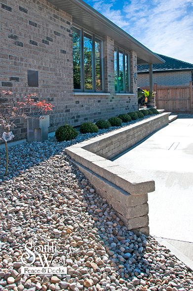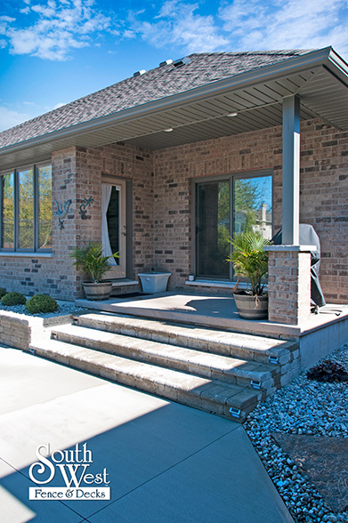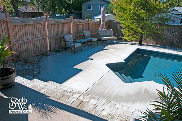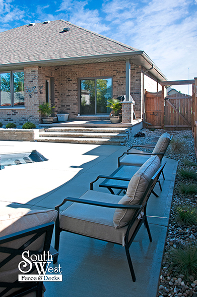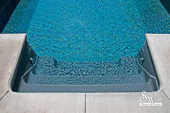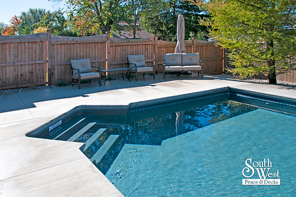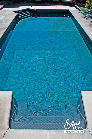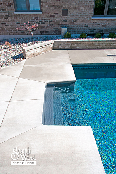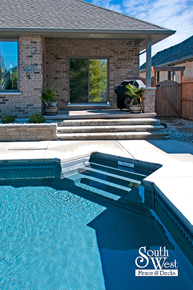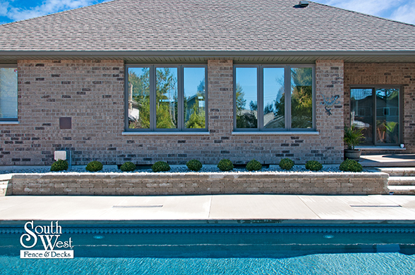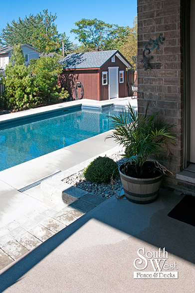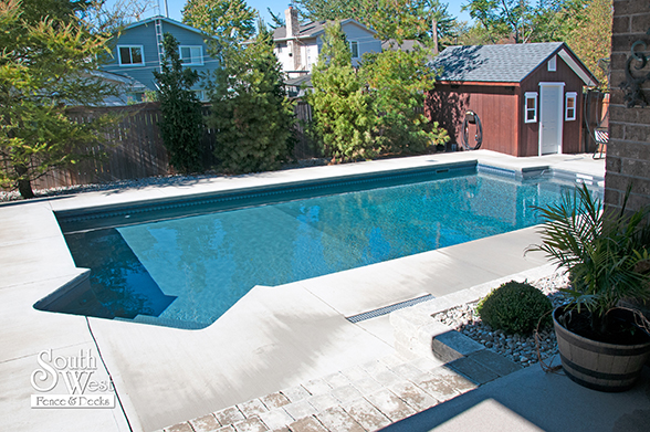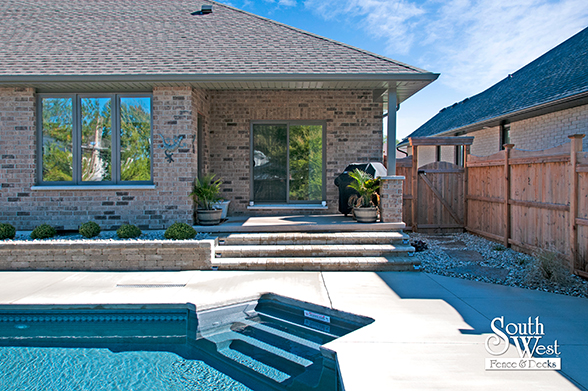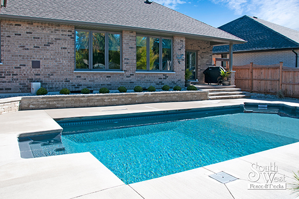 This week’s feature project designed and installed by South West Fence & Decks is a majestic, 16 x 32 rectangular pool with concrete pool deck-coping, Unilock stone steps, pillar, flower bed/retaining wall, and landscaping with flagstone walkway.