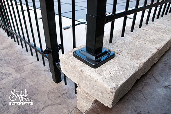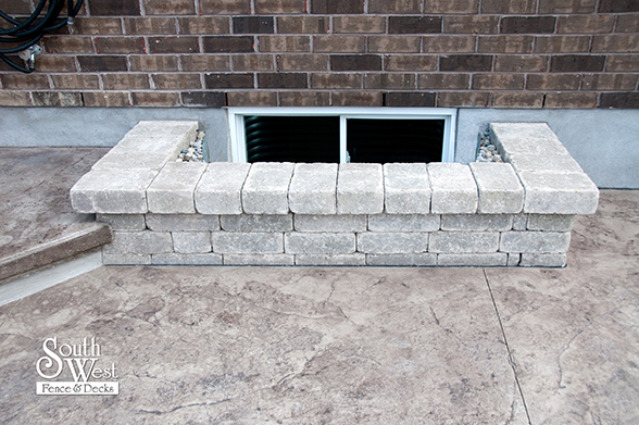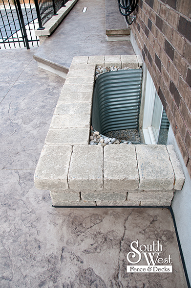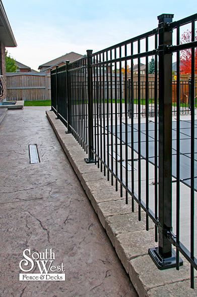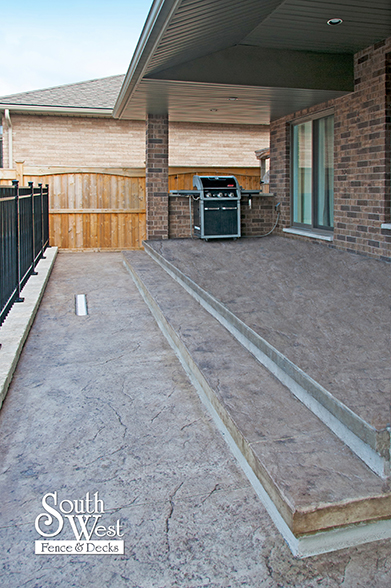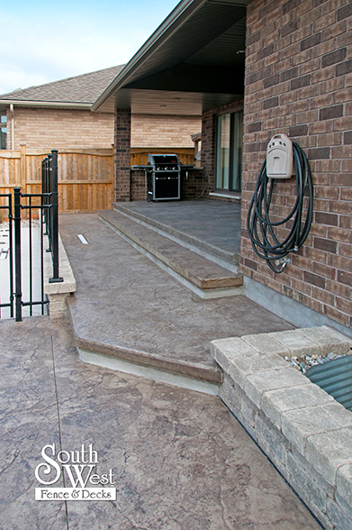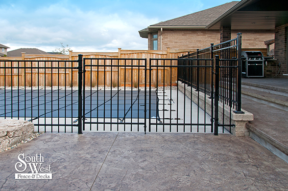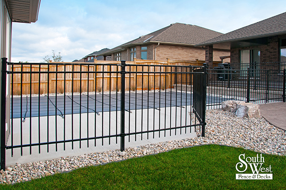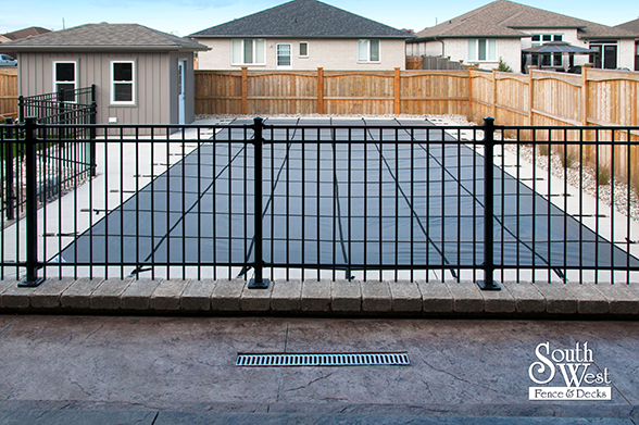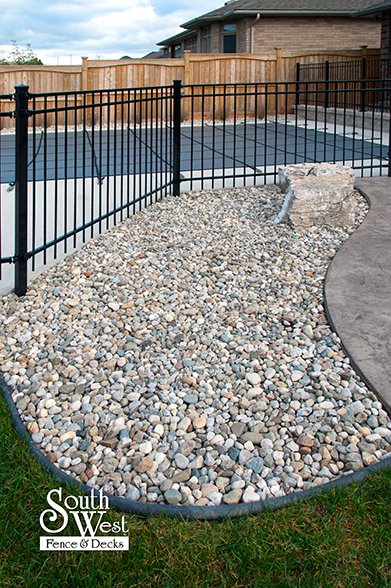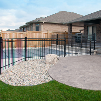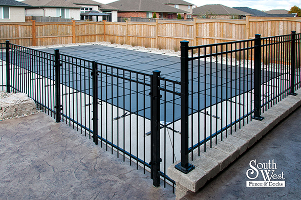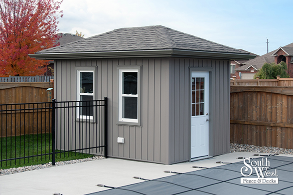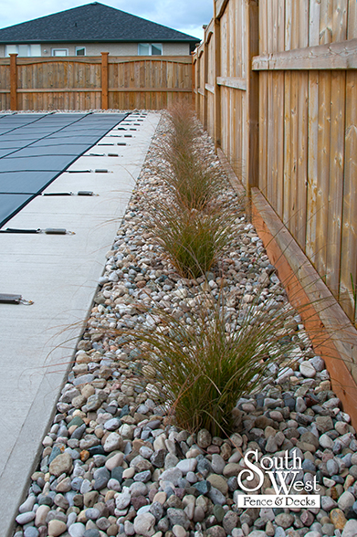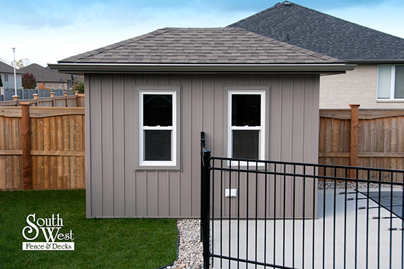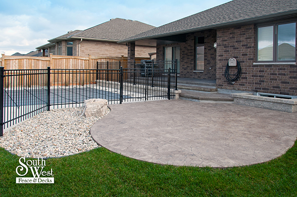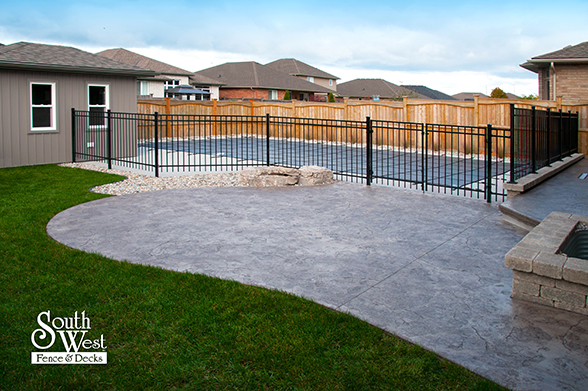 This week’s feature ‘Complete Backyard’ project designed and installed by South West Fence & Decks includes a 15 x 30 rectangular pool with broom-finished concrete deck and coping, stamped concrete patio, walkway and steps, stone retaining wall/window well, board and batten shed, ornamental rod iron fence with double gate, and landscaping.