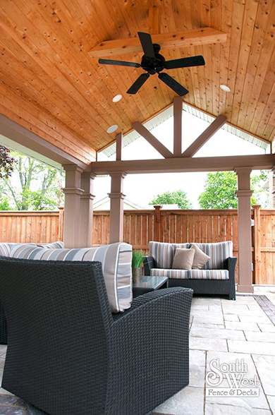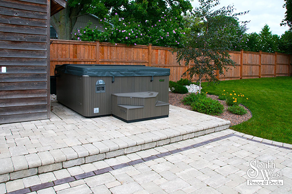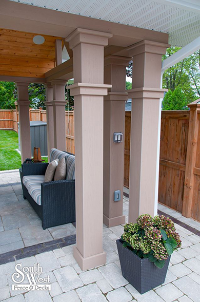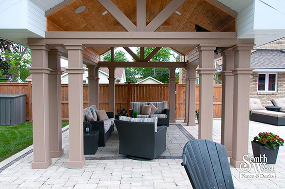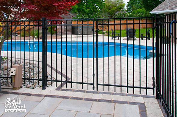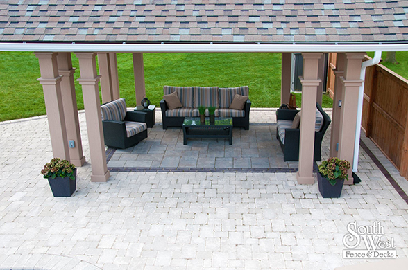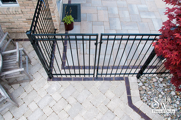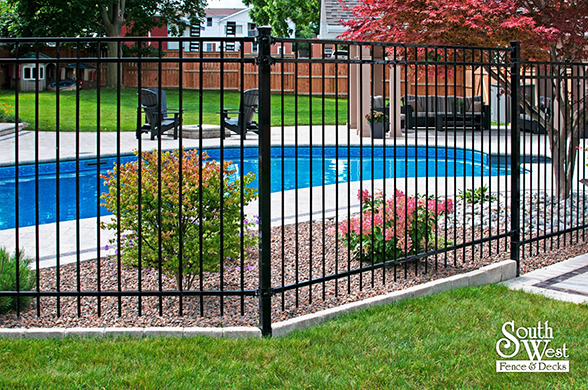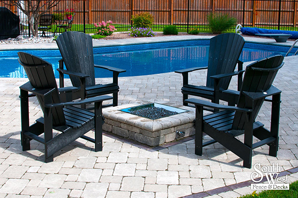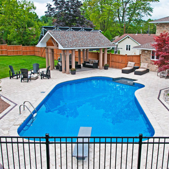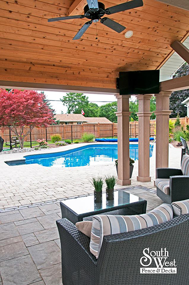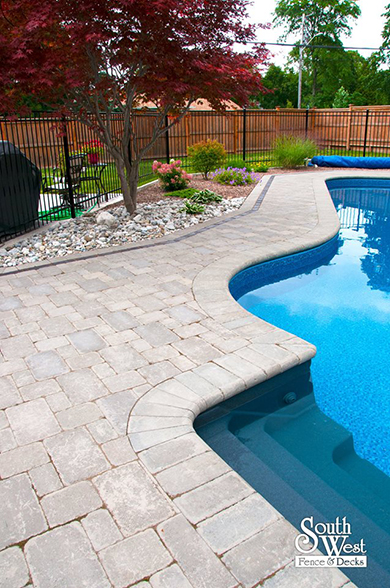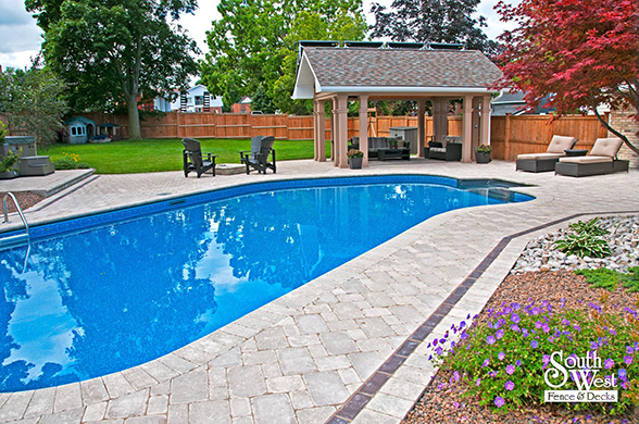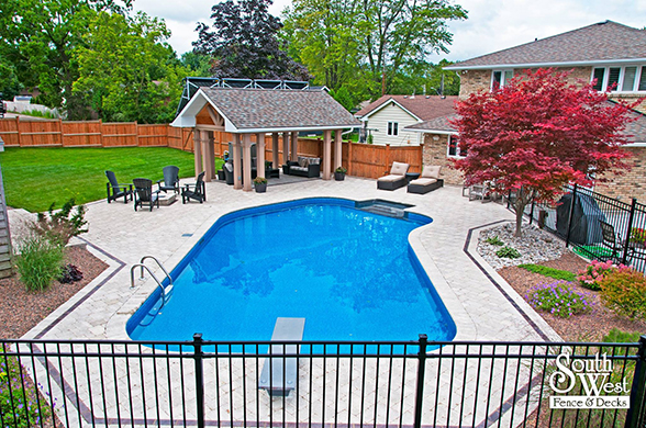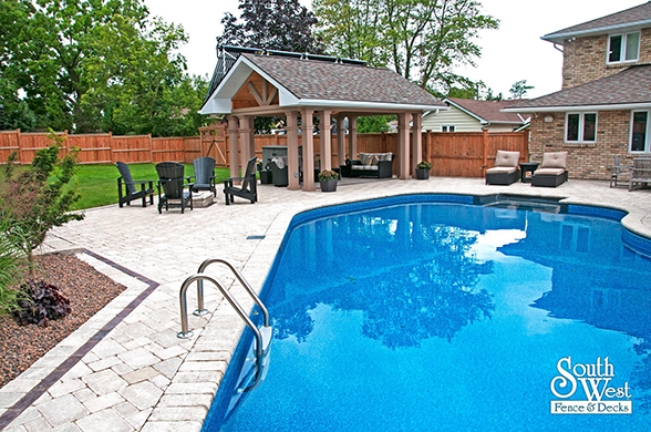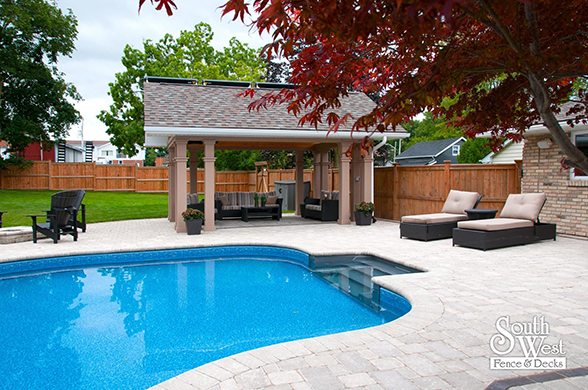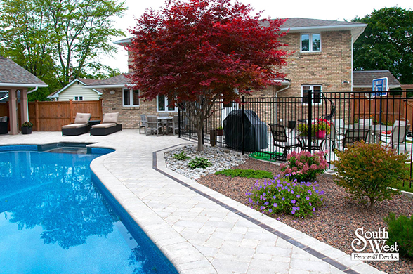 This luxurious ’Complete Backyard’ project by South West Fence & Decks includes a stunning in-ground pool with stone pool decking, stone patio with a modern fire pit feature, a grand-designed cabana including a two-tone stone patio with lighting, elegant ornamental black rod iron fencing with gate, and professional landscaping with lighting.
