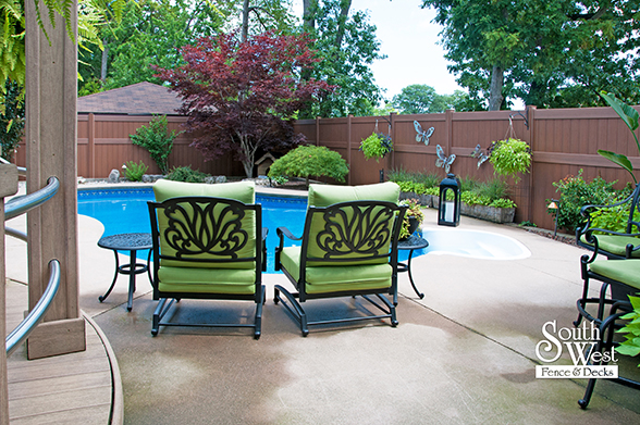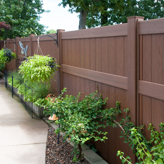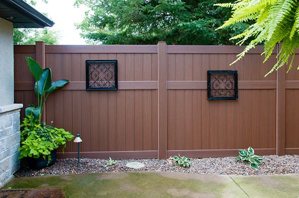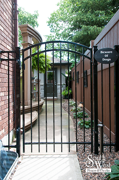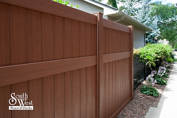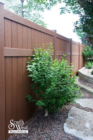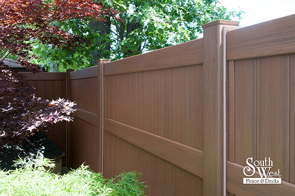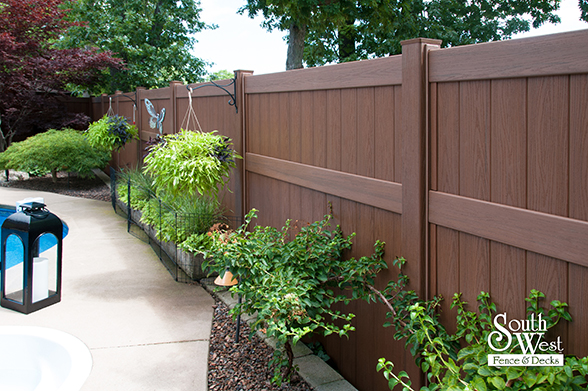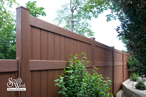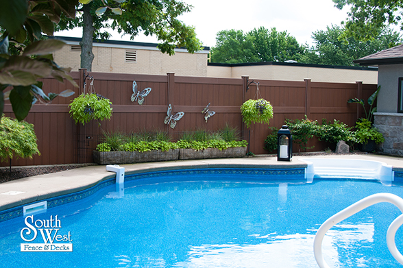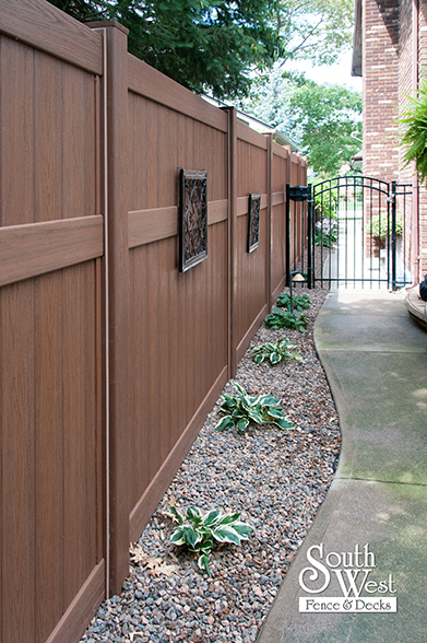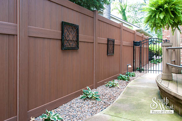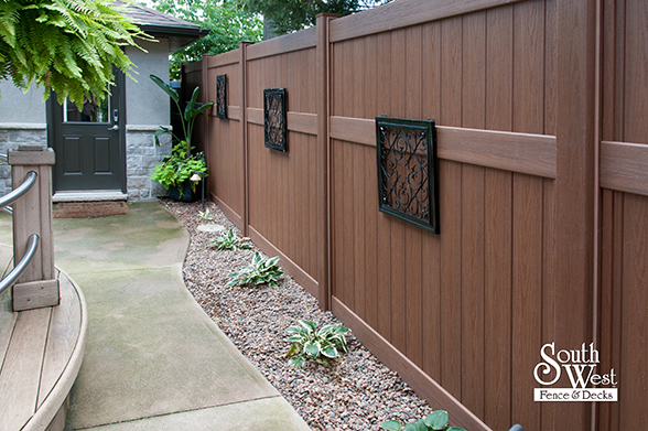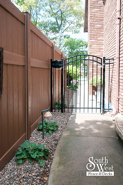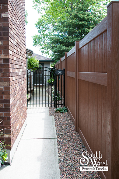 This week’s feature project, designed and installed by South West Fence & Decks, is an attractive, textured, brown vinyl fence with wood grain. Other project features include ornamental rod iron gates.