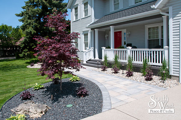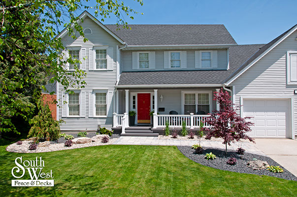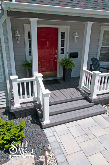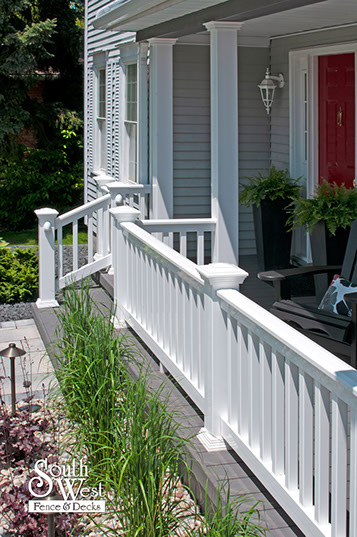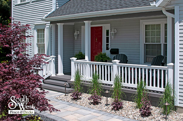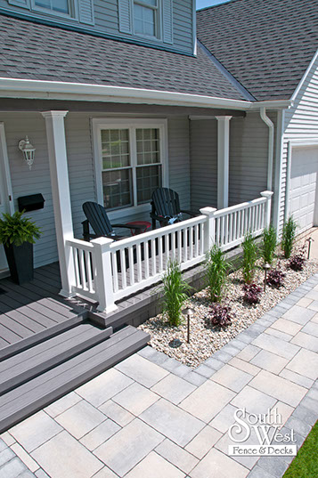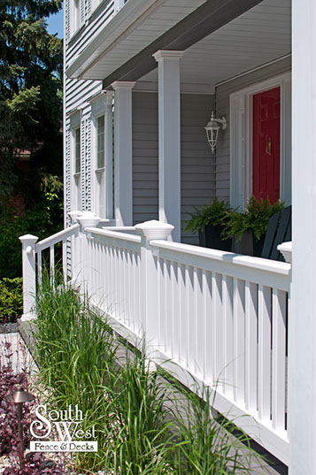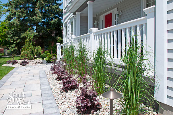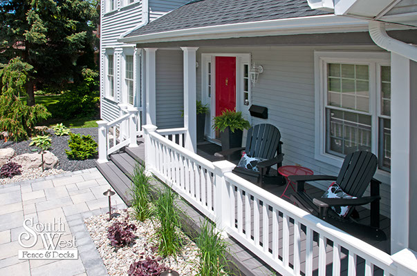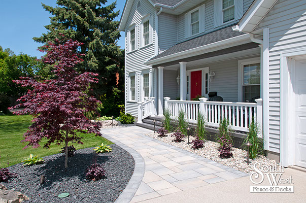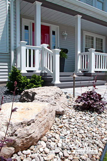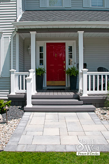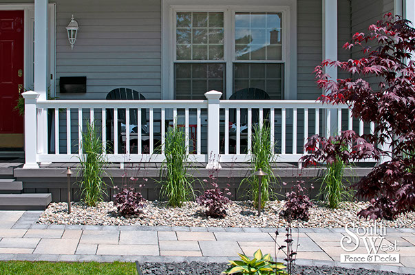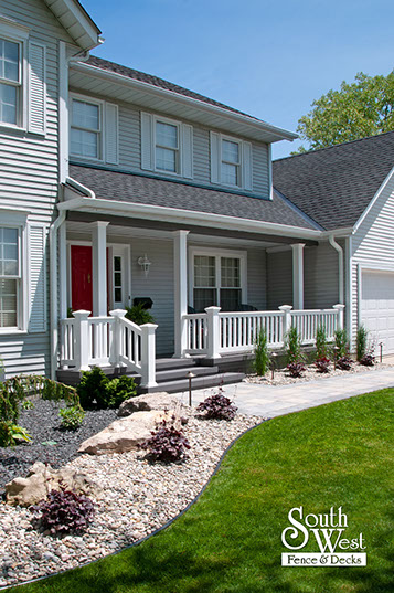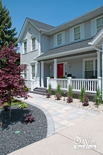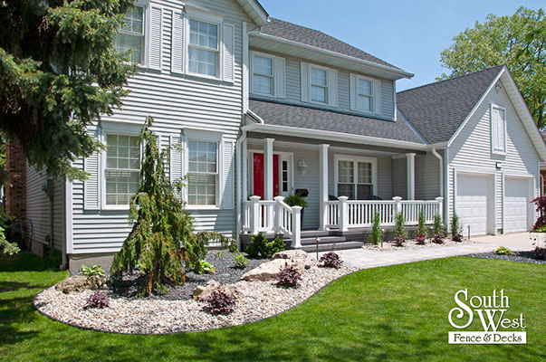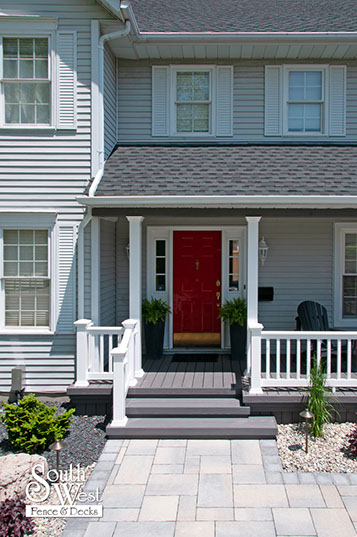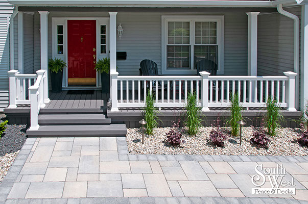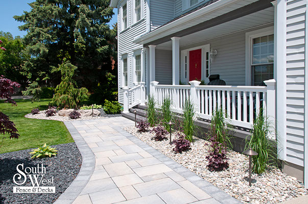 This week’s feature project designed and installed by South West Fence & Decks is beautiful, low-maintenance, Azek front porch with white vinyl railings and posts. Other project features include a Unilock stone walkway, low-voltage lighting, and landscaping.