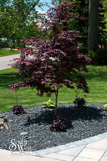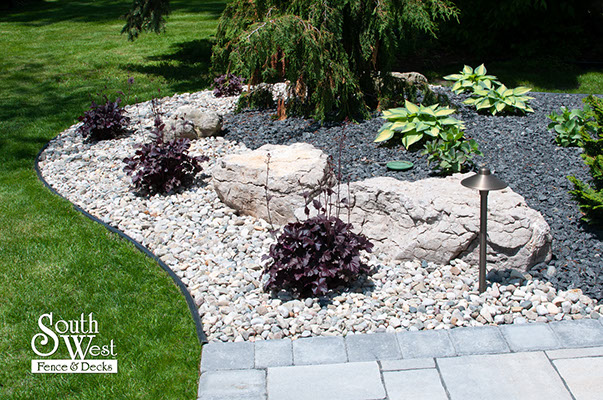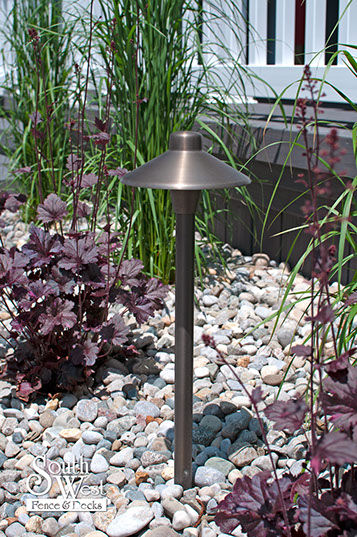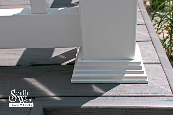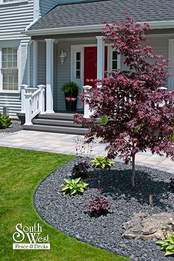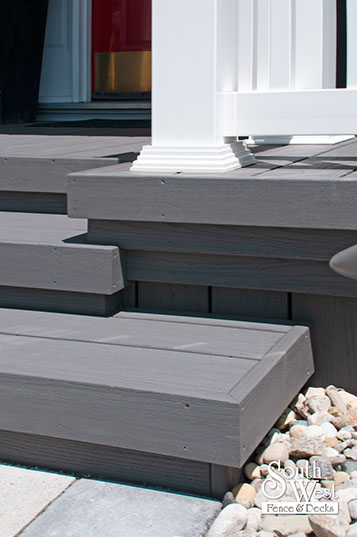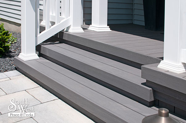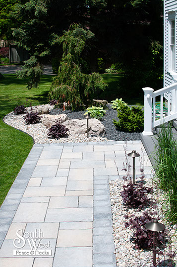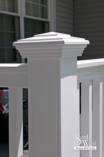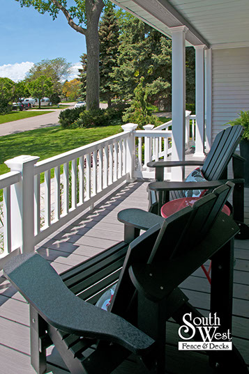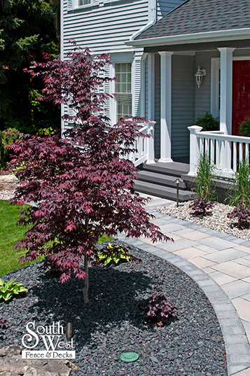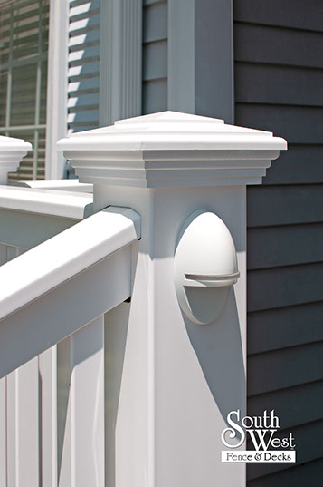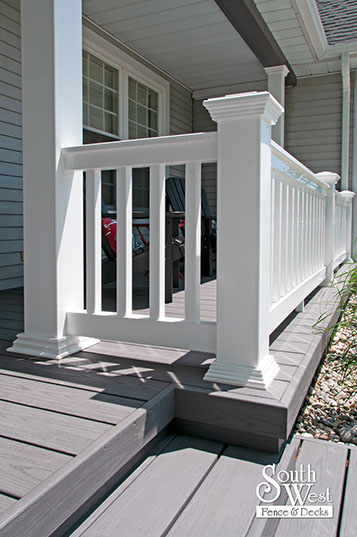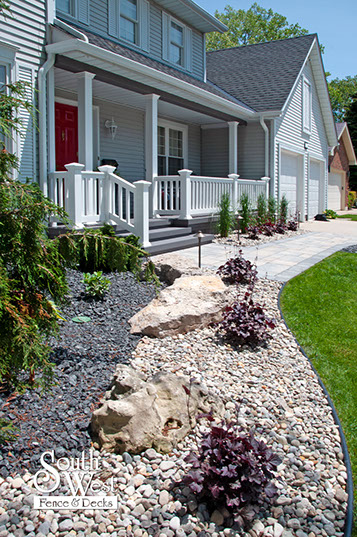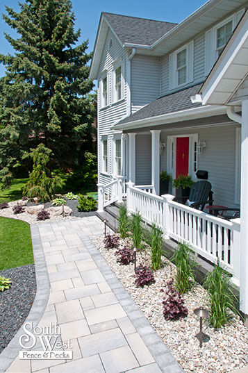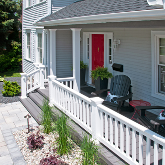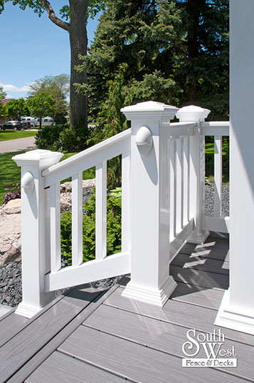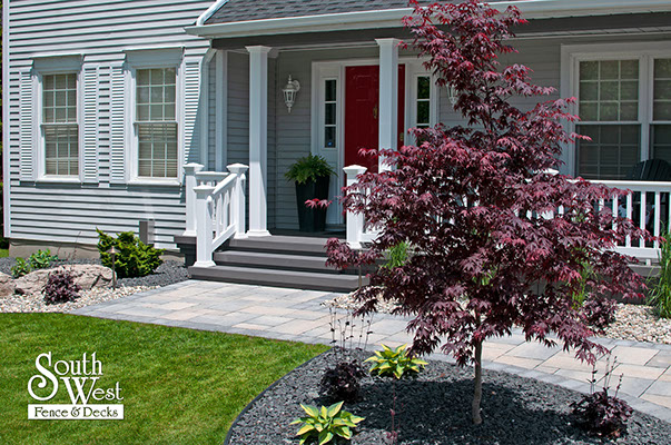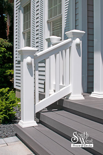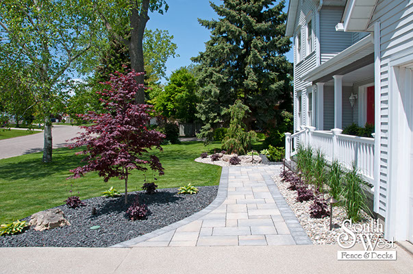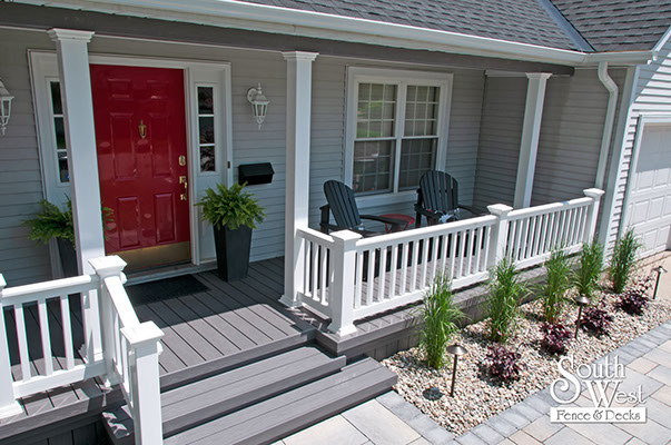 This week’s feature project designed and installed by South West Fence & Decks is beautiful, low-maintenance, Azek front porch with white vinyl railings and posts. Other project features include a Unilock stone walkway, low-voltage lighting, and landscaping.
