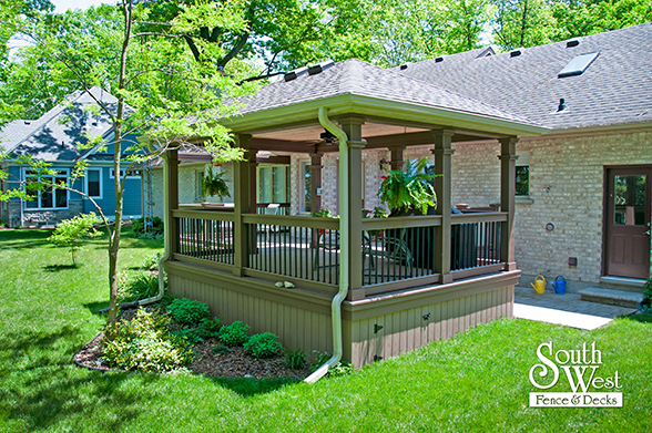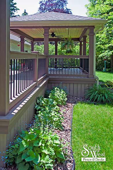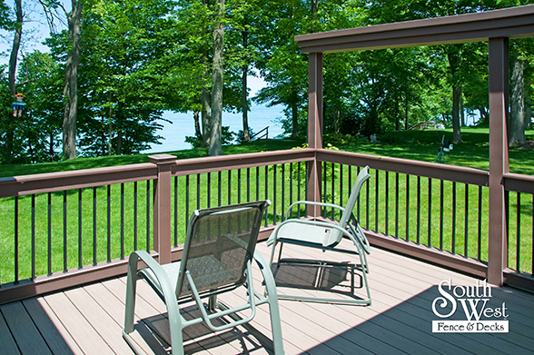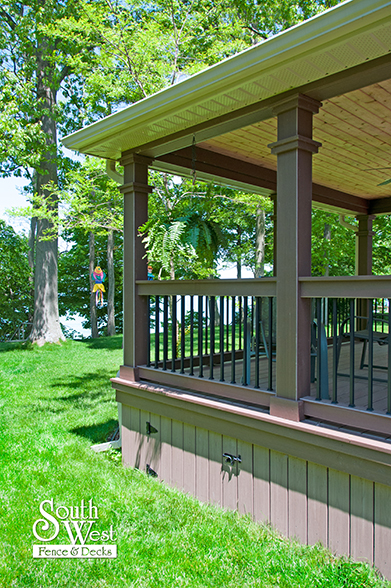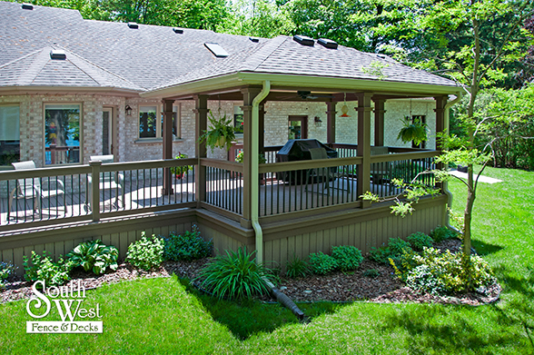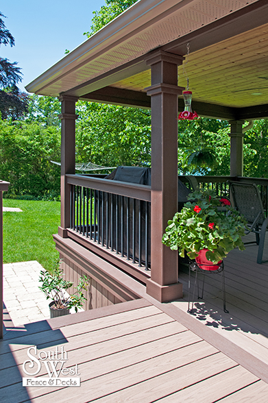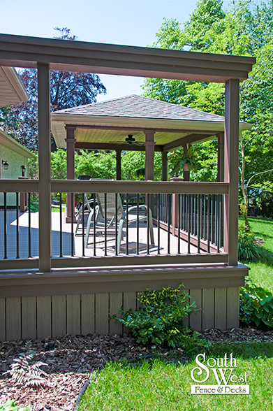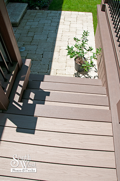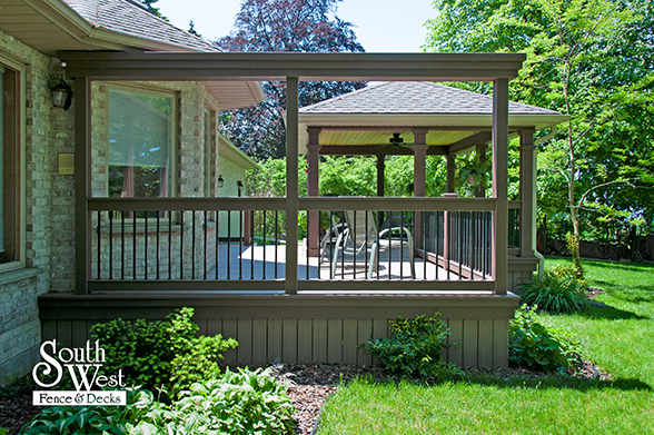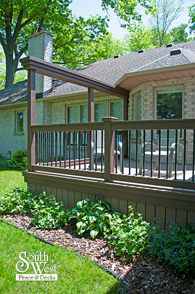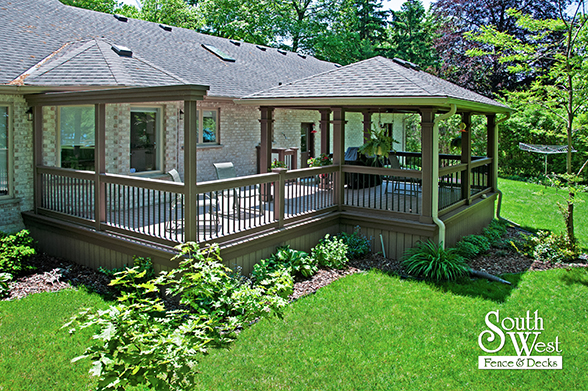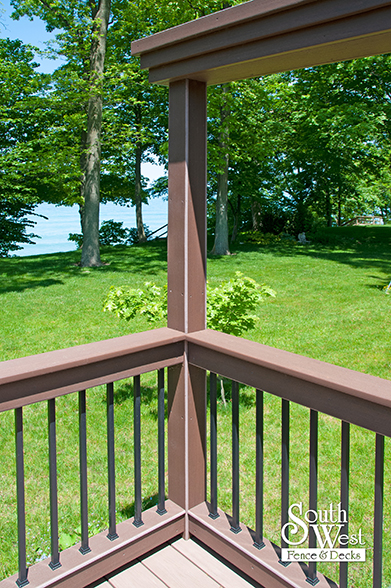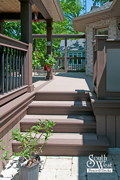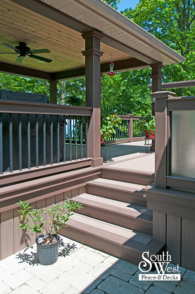 This week’s feature project designed and installed by South West Fence & Decks is a low-maintenance, two-tone Azek deck with overhead roof structure, ornamental rod iron balusters, frosted glass privacy screen, and a triple profile overhead beam. Other project feature includes a Unilock stone patio with steps.