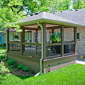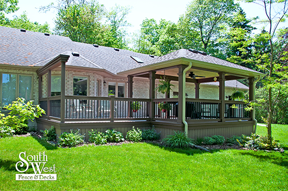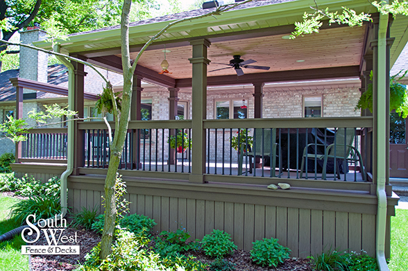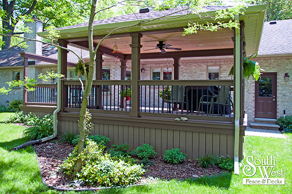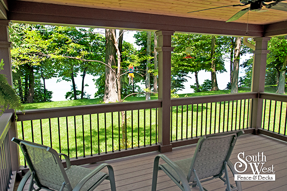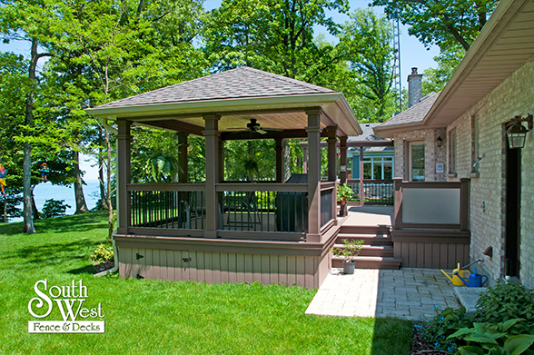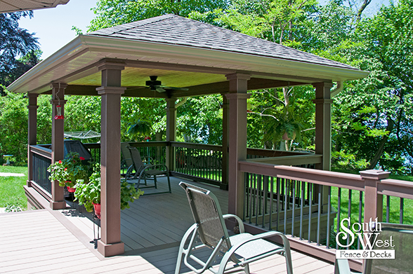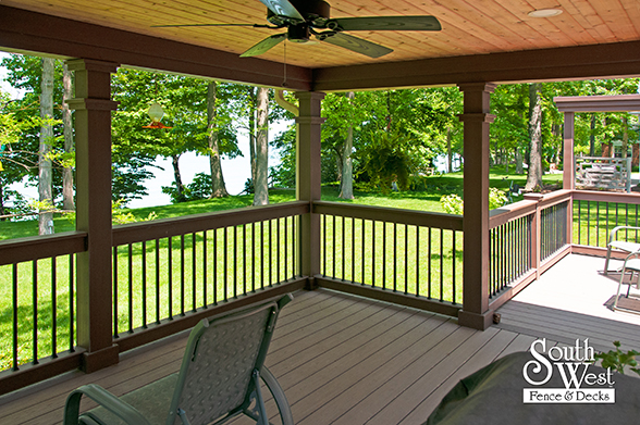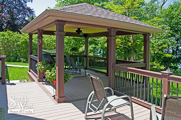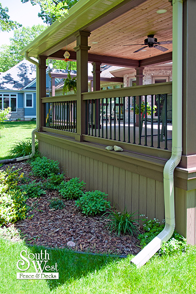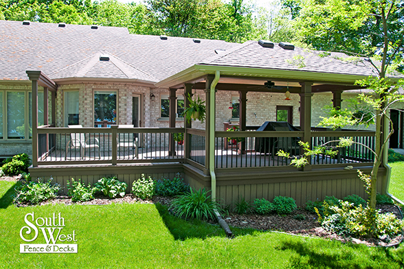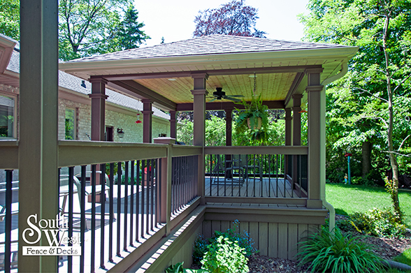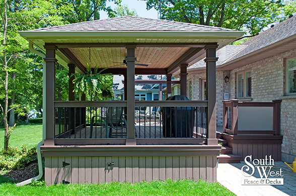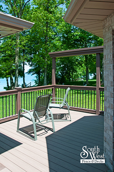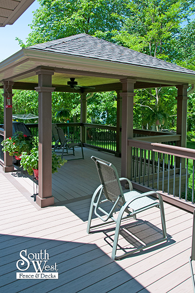 This week’s feature project designed and installed by South West Fence & Decks is a low-maintenance, two-tone Azek deck with overhead roof structure, ornamental rod iron balusters, frosted glass privacy screen, and a triple profile overhead beam. Other project feature includes a Unilock stone patio with steps.