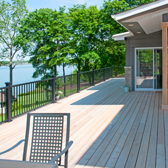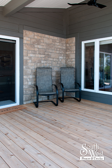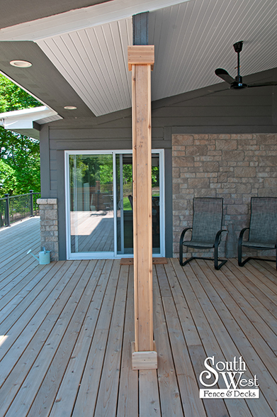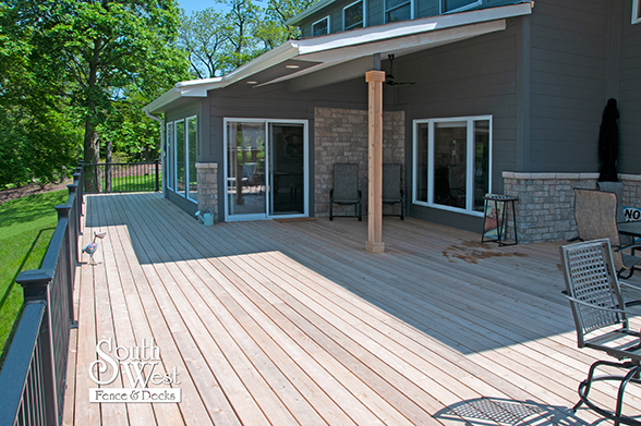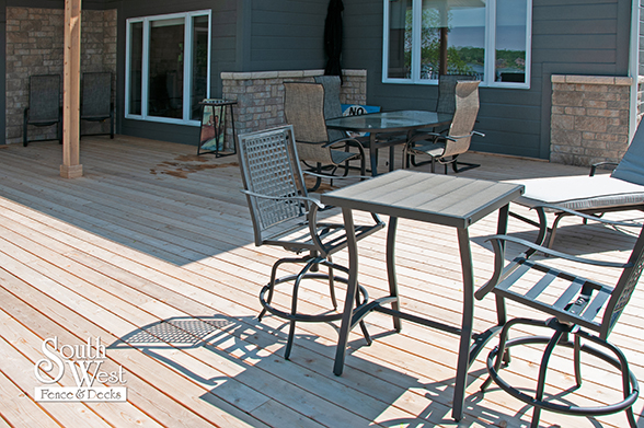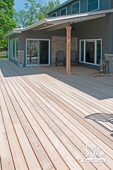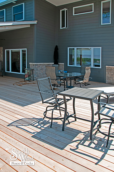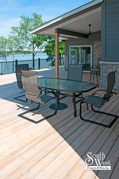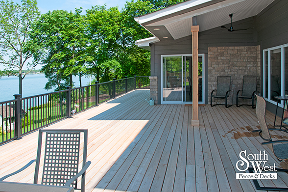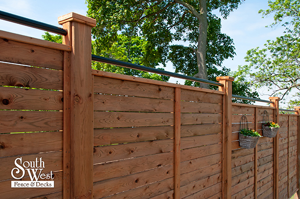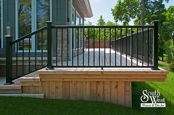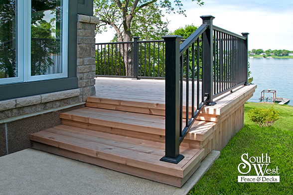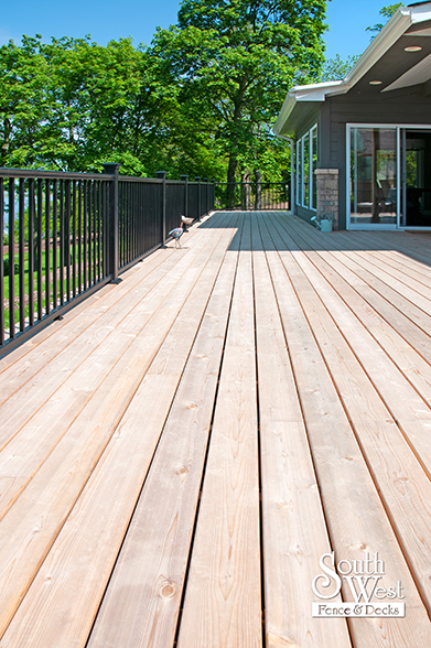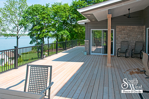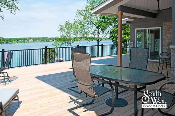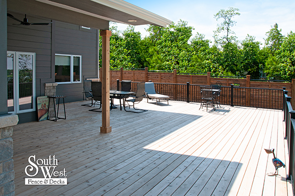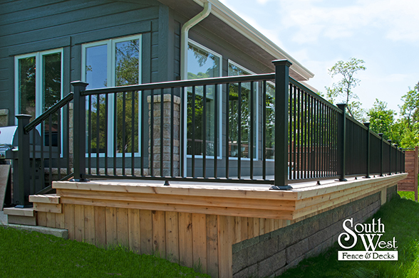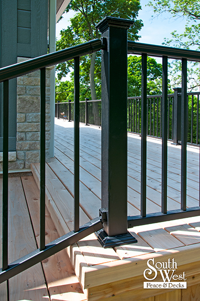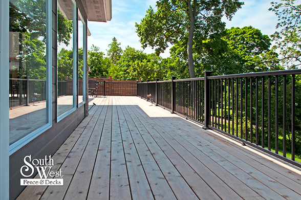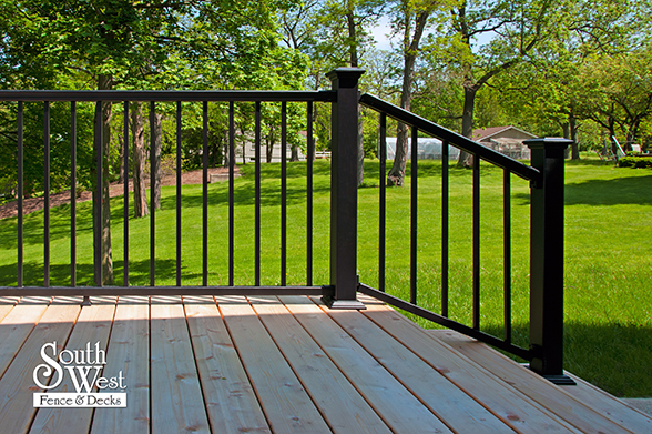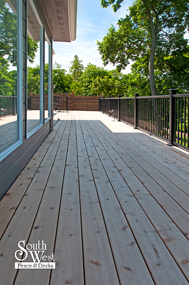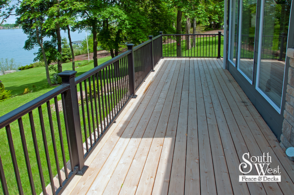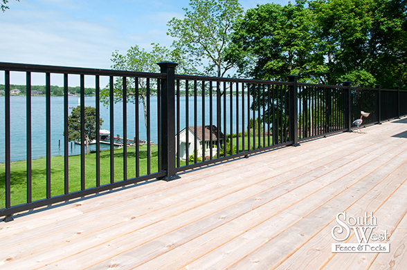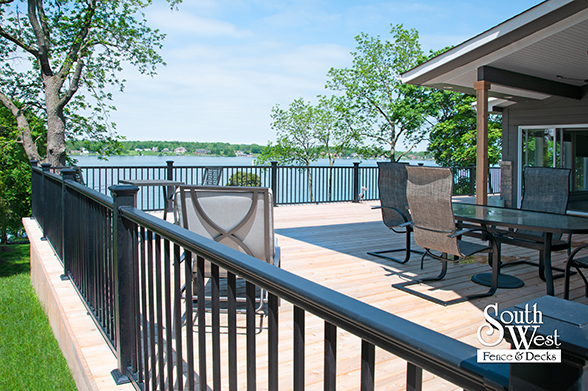 This week’s feature project designed and installed by South West Fence & Decks is a spacious, pressure-treated wood deck with black aluminum railing with pickets. An additional project feature includes a custom pressure-treated wood fence with black pipe topper accent.