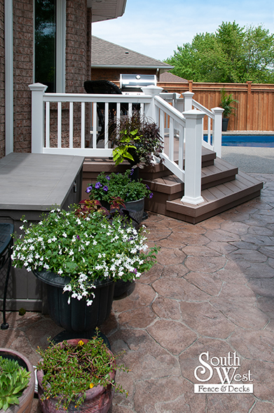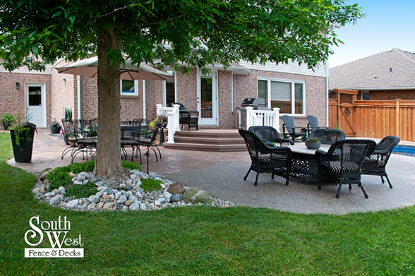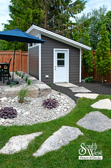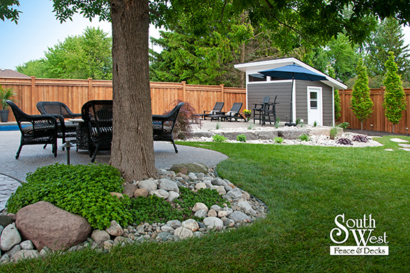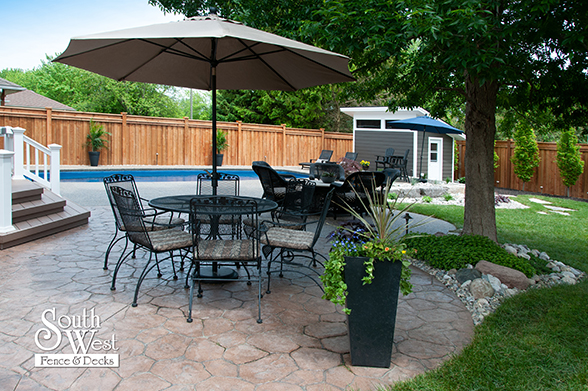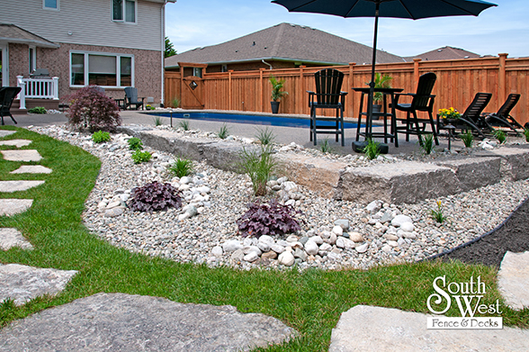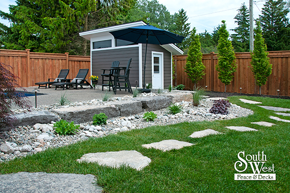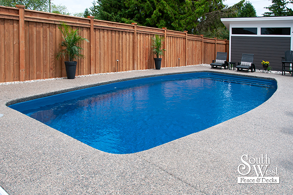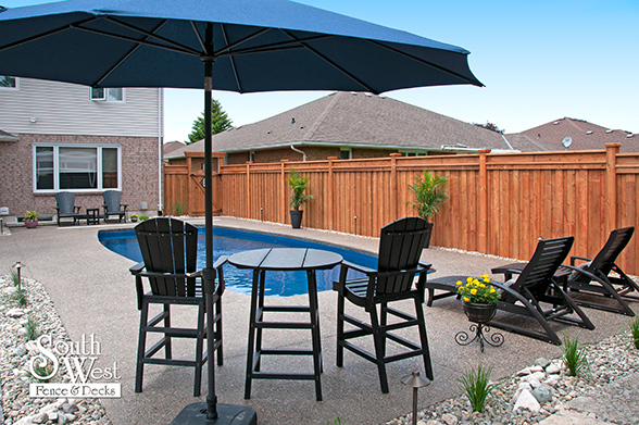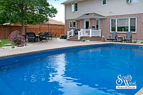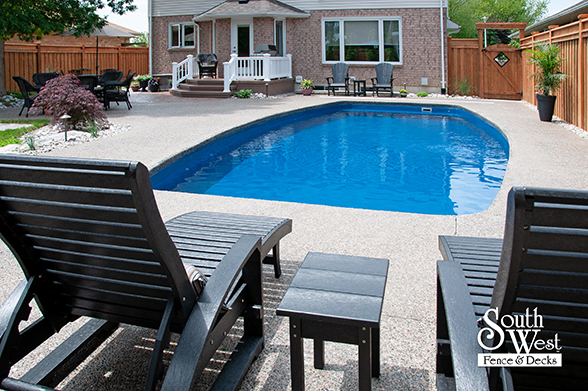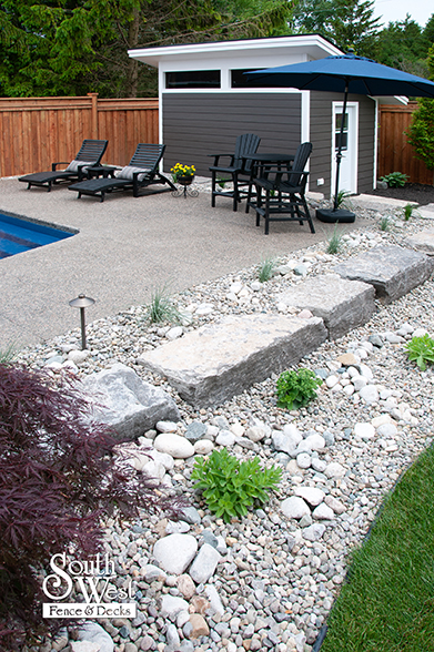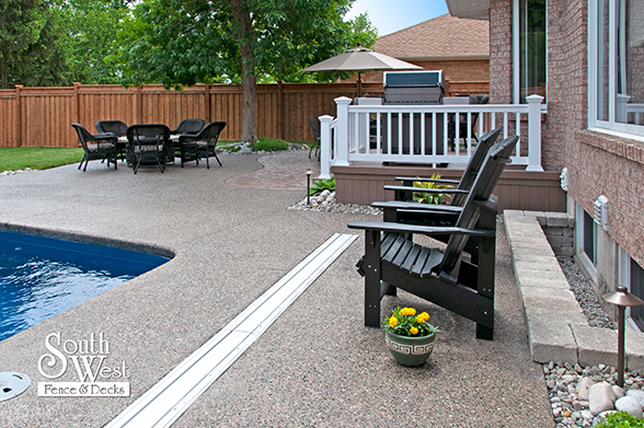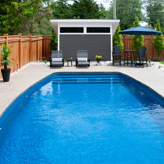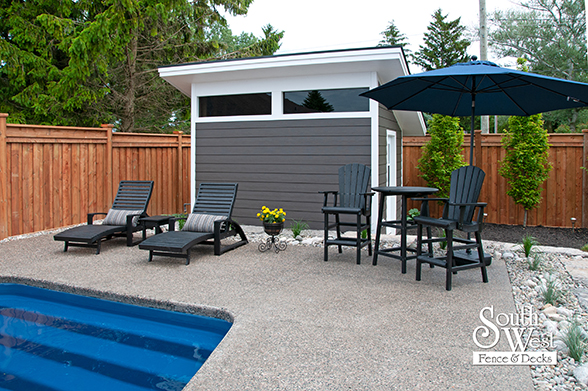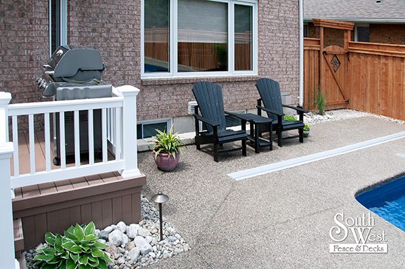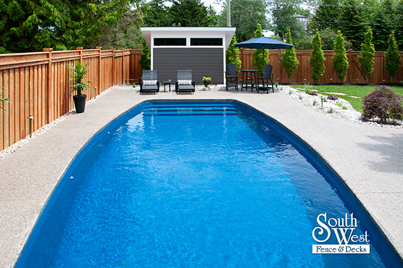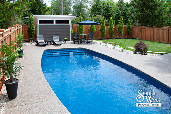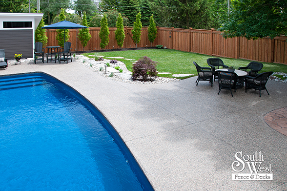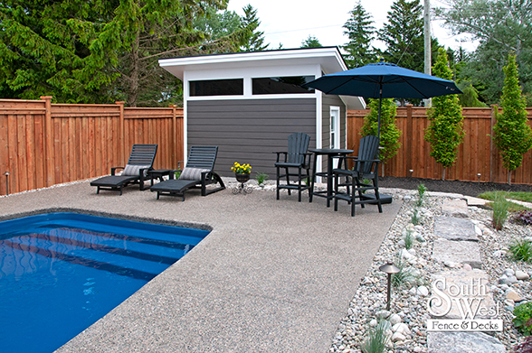 This stunning ‘Complete Backyard’, includes an impressive 16x33 Inception fiberglass pool with raised-aggregate concrete pool decking and coping. Other project features include a low-maintenance, mono-tone Azek deck with white vinyl railings, a modern-style 8x12 pool shed, gorgeous landscaping including armourstone retaining walls and a flagstone walkway, raised-aggregate and stamped concrete patios, low-maintenance lighting, and a pressure-treated wood privacy fence with gate.