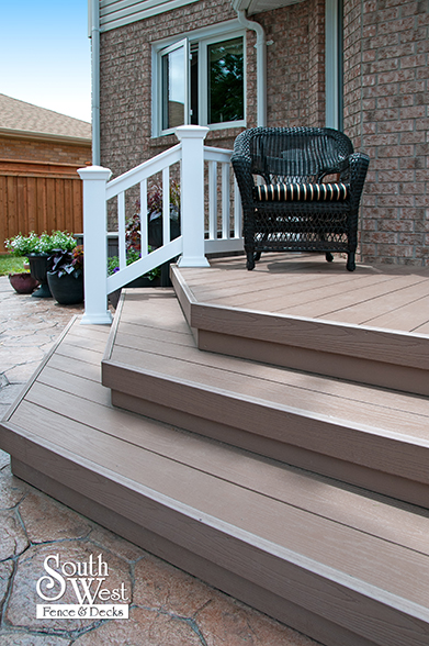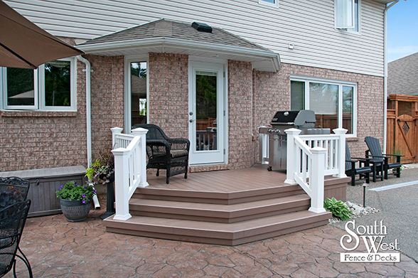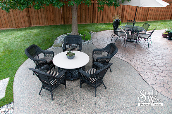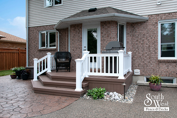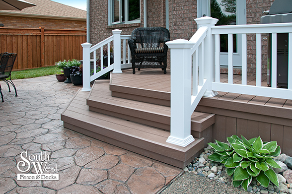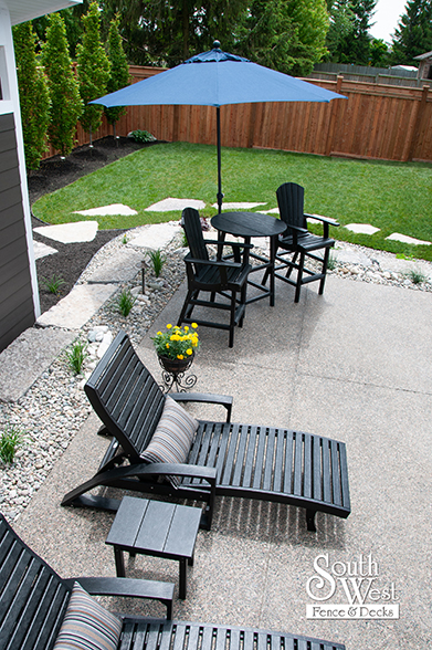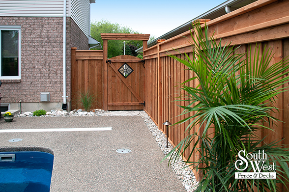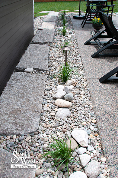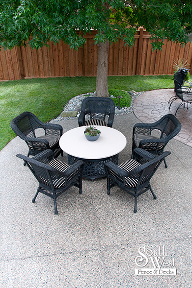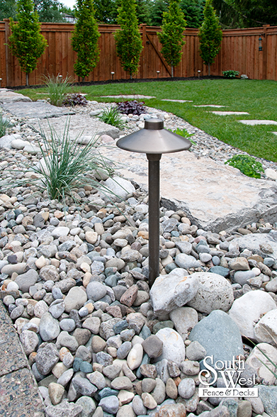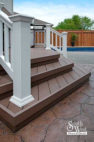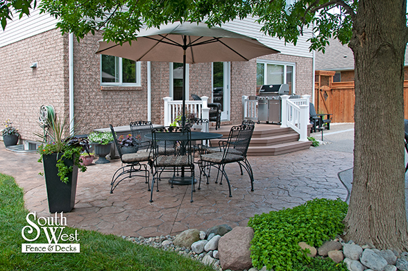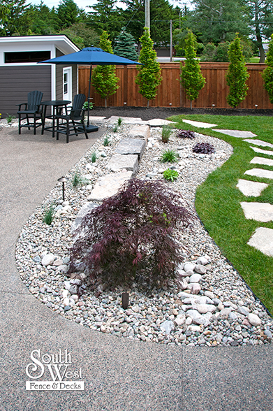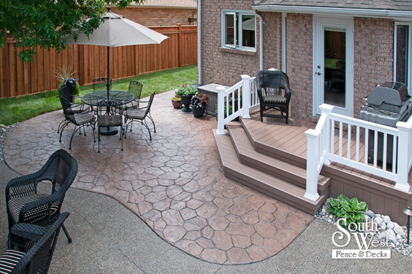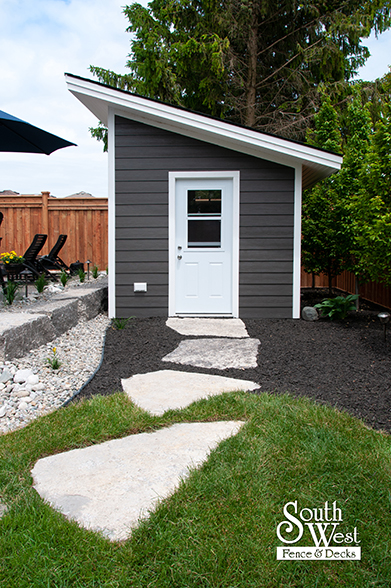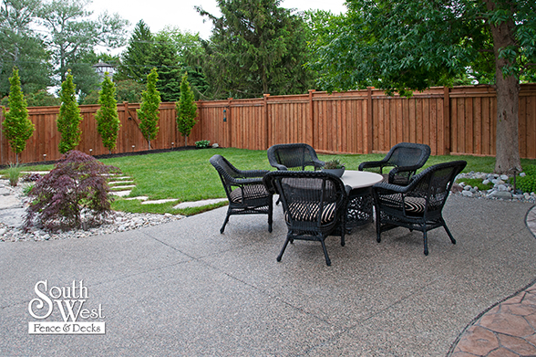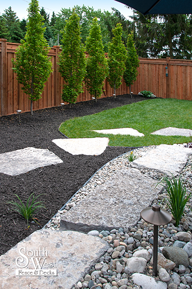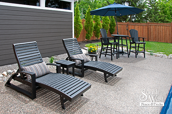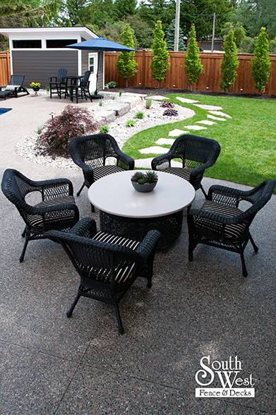 This stunning ‘Complete Backyard’, includes an impressive 16x33 Inception fiberglass pool with raised-aggregate concrete pool decking and coping. Other project features include a low-maintenance, mono-tone Azek deck with white vinyl railings, a modern-style 8x12 pool shed, gorgeous landscaping including armourstone retaining walls and a flagstone walkway, raised-aggregate and stamped concrete patios, low-maintenance lighting, and a pressure-treated wood privacy fence with gate.