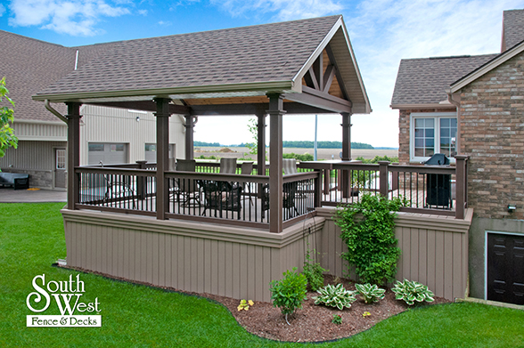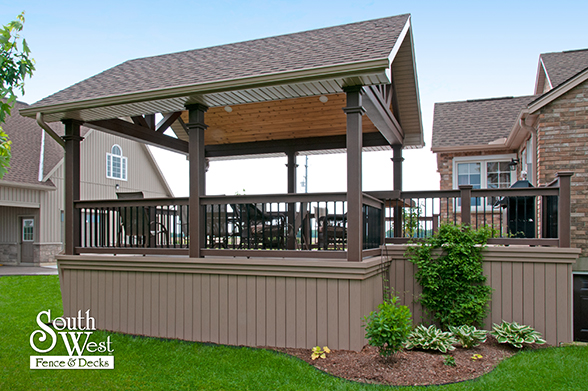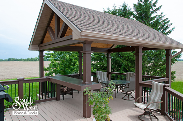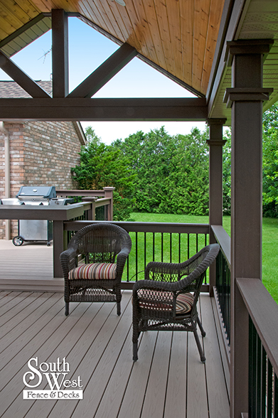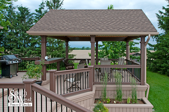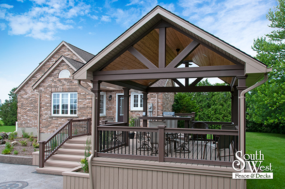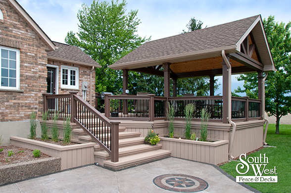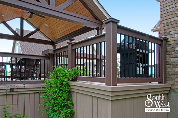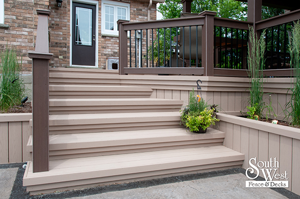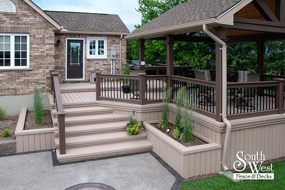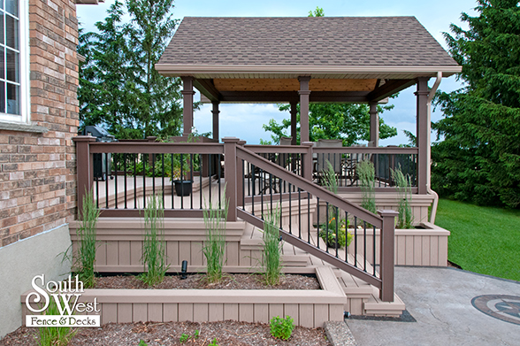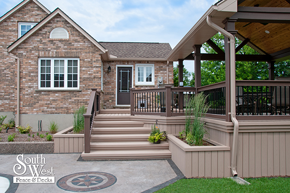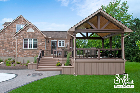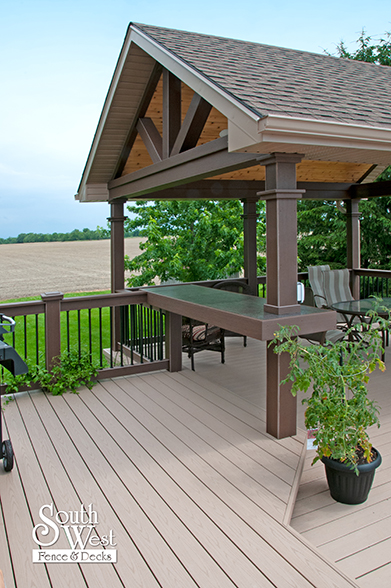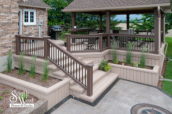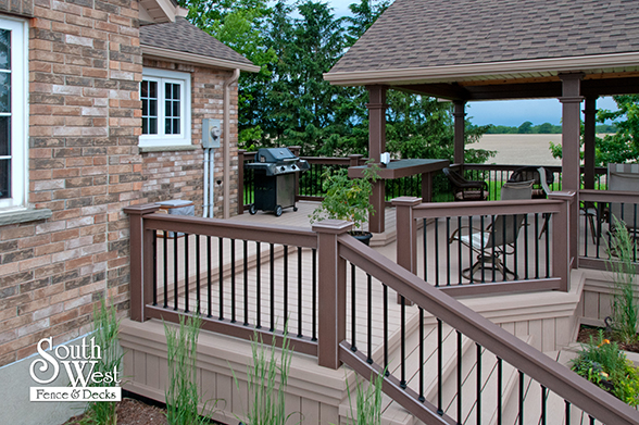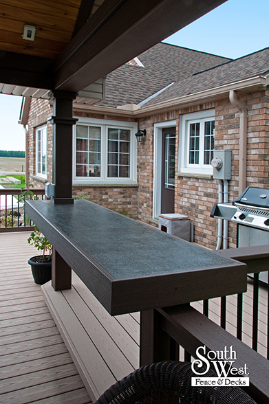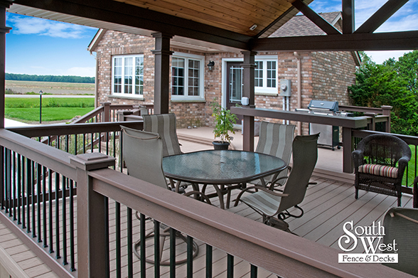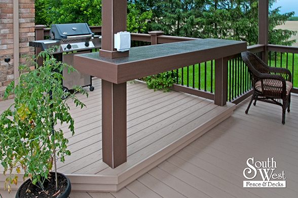 This week’s feature project, designed and installed by South West Fence & Decks, is la stunning, low-maintenance, multi-level, two-tone Azek deck with an overhead cabana roof structure, ornamental iron spindles, planter boxes, and a handy bar/counter.