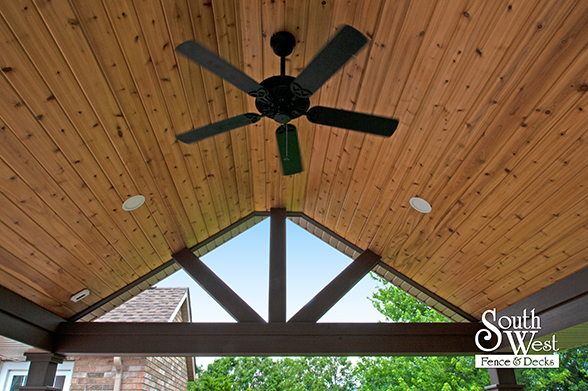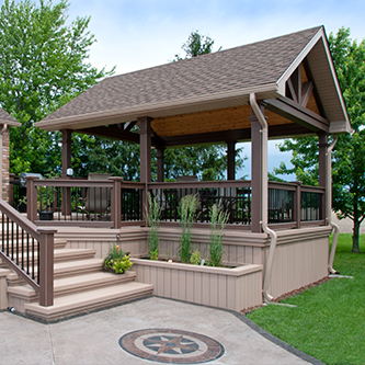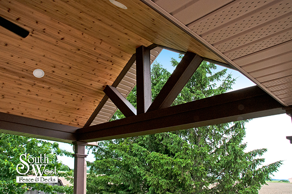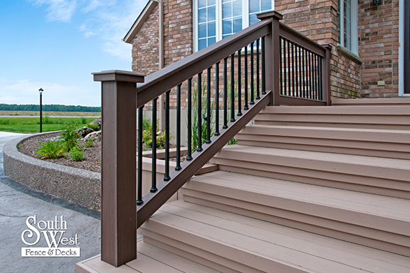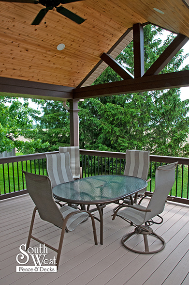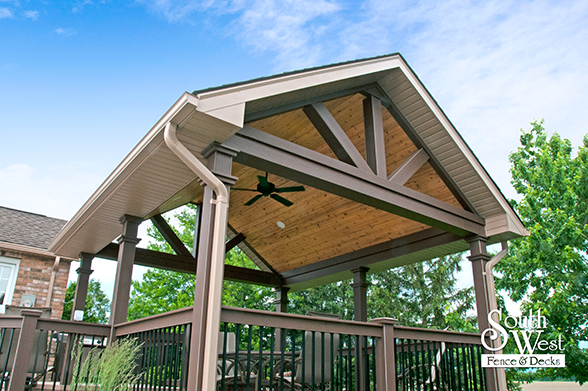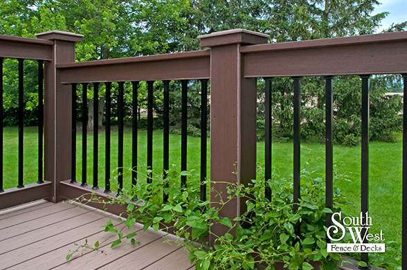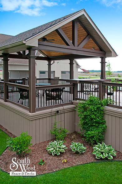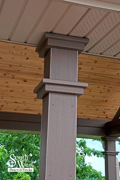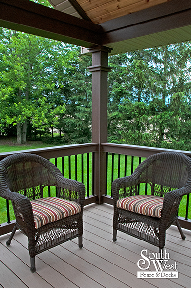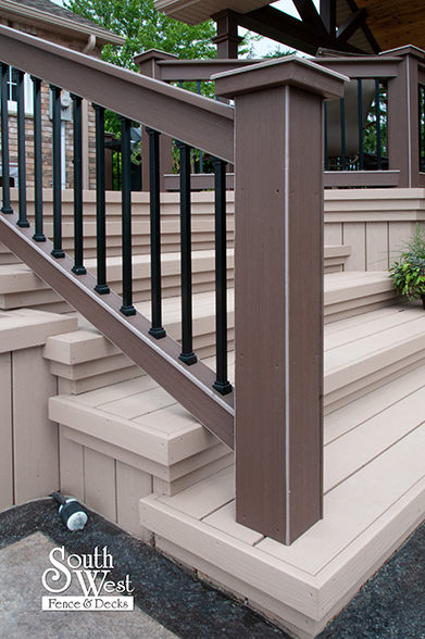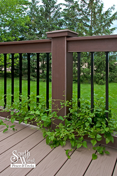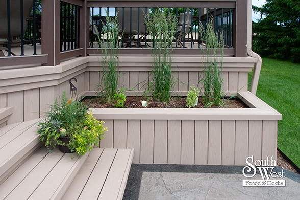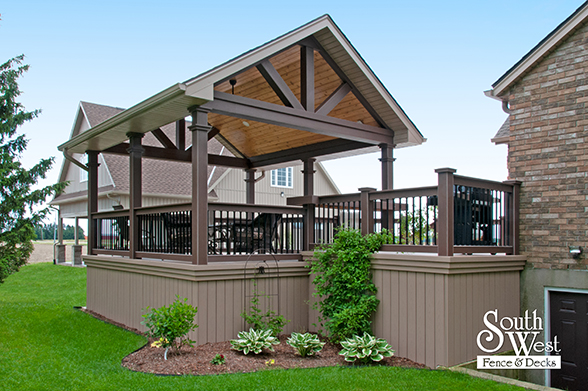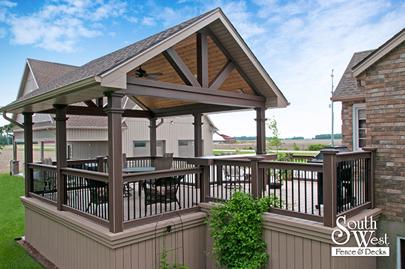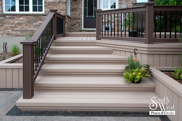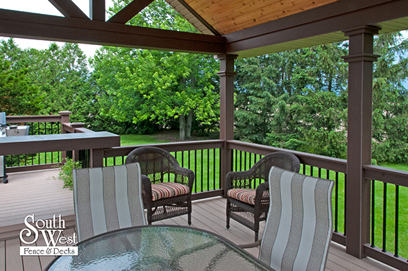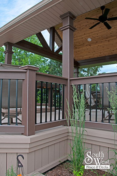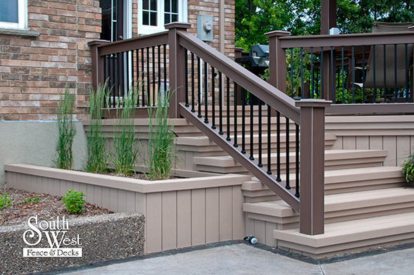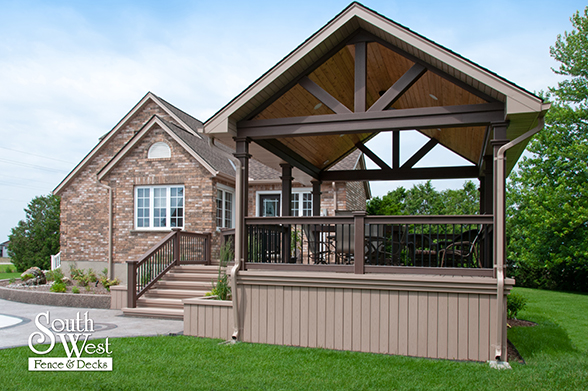 This week’s feature project, designed and installed by South West Fence & Decks, is la stunning, low-maintenance, multi-level, two-tone Azek deck with an overhead cabana roof structure, ornamental iron spindles, planter boxes, and a handy bar/counter.