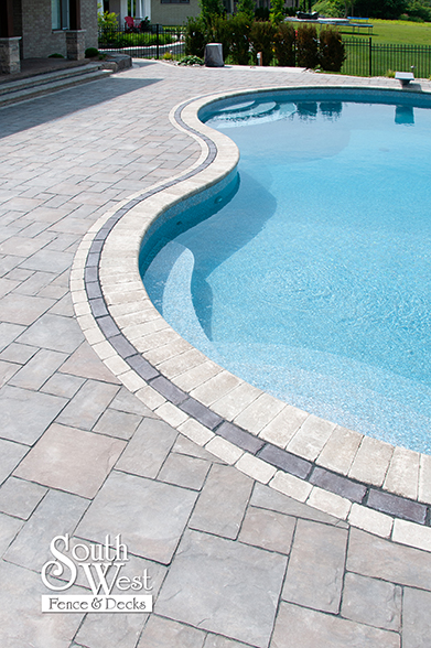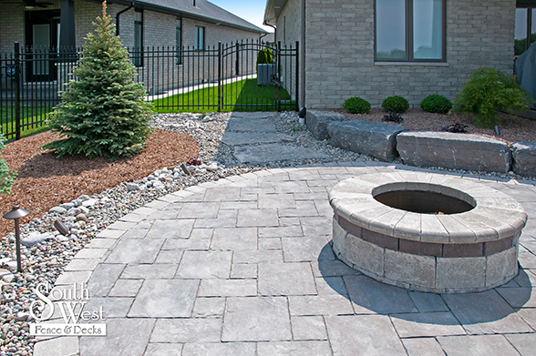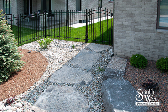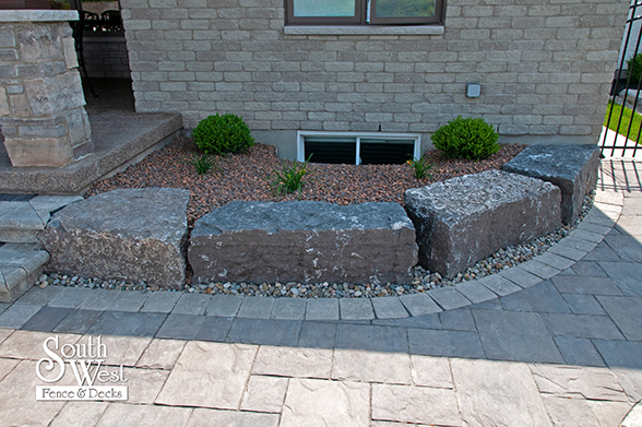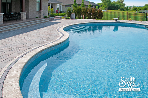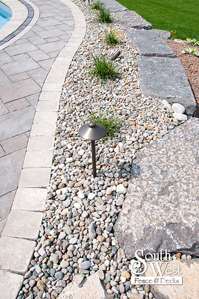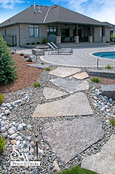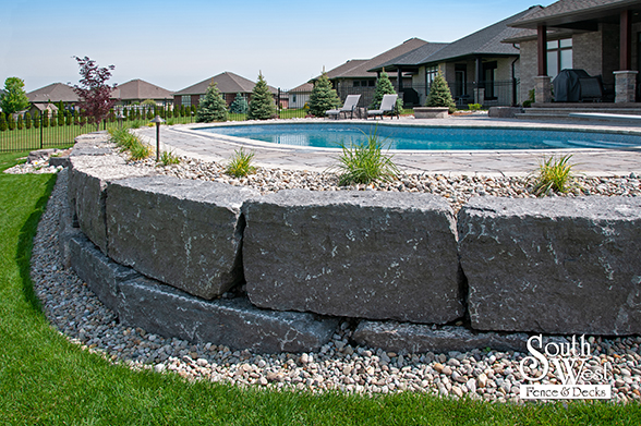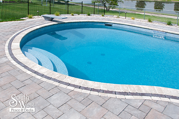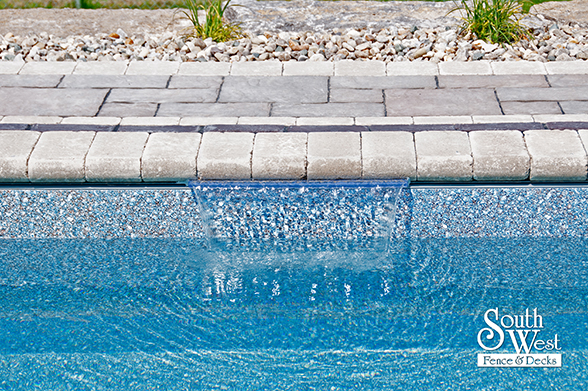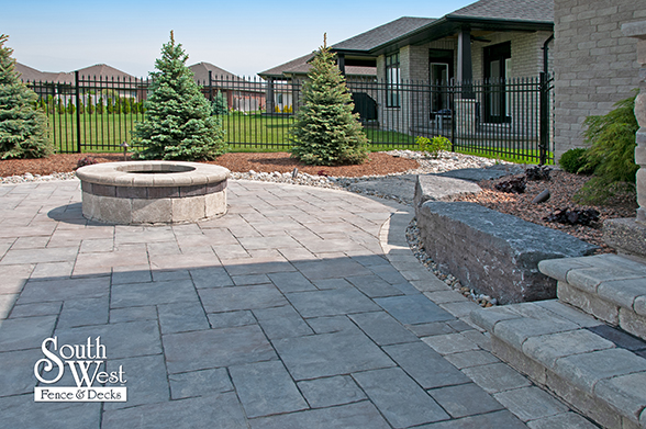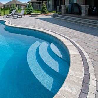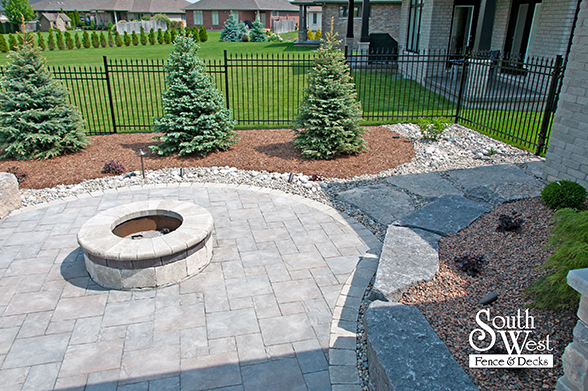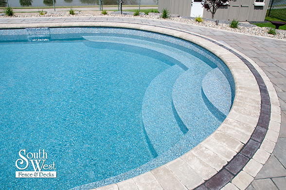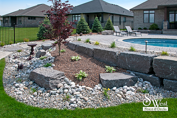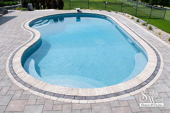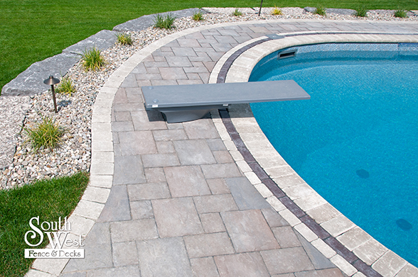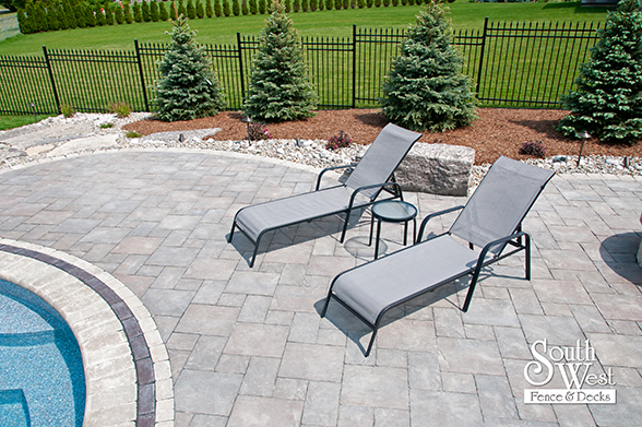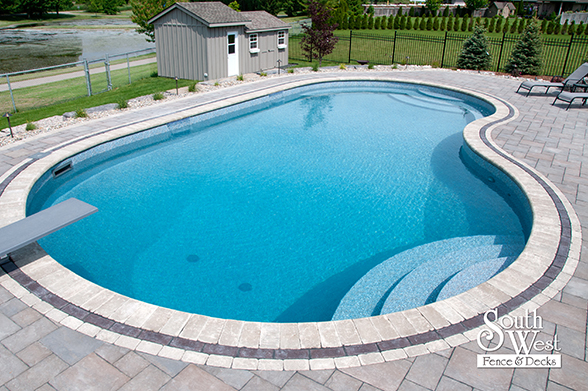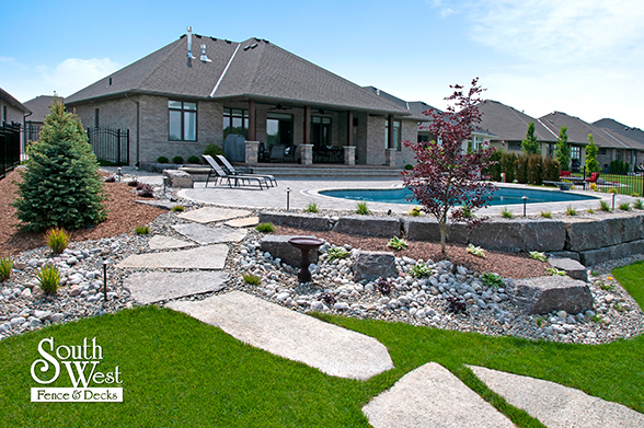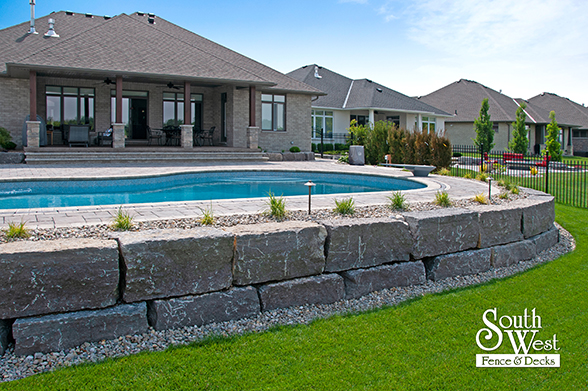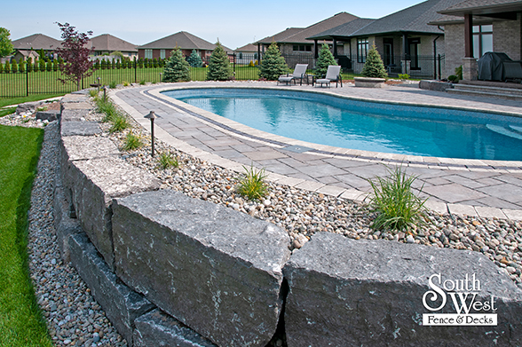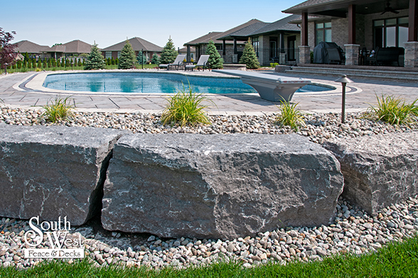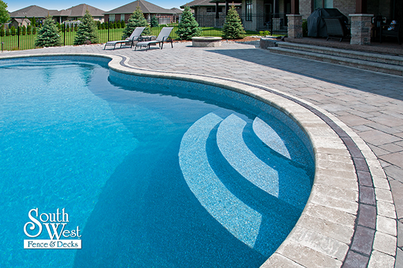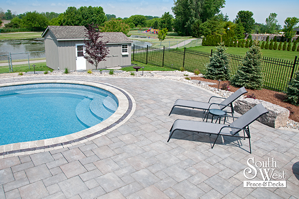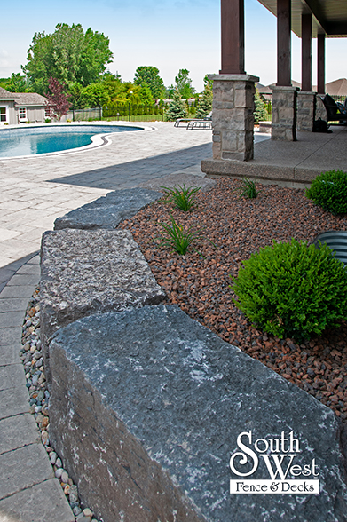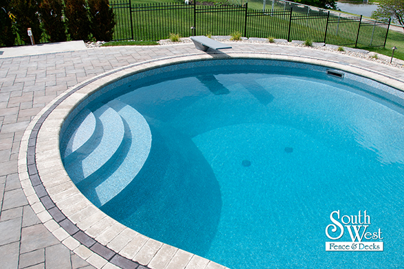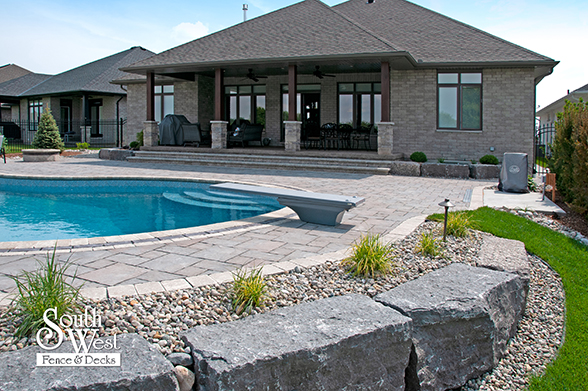 This spacious ‘Complete Backyard’ includes a stunning 22’ x 38’ Celebrity pool with diving board, additional steps, bench and a water feature. Other project features include an armourstone retaining wall, Unilock stone patio/steps, pool coping, and walkways, shed addition, concrete foundation for pizza oven, flagstone pathways, landscaping, low-voltage lighting, and ornamental iron fencing.