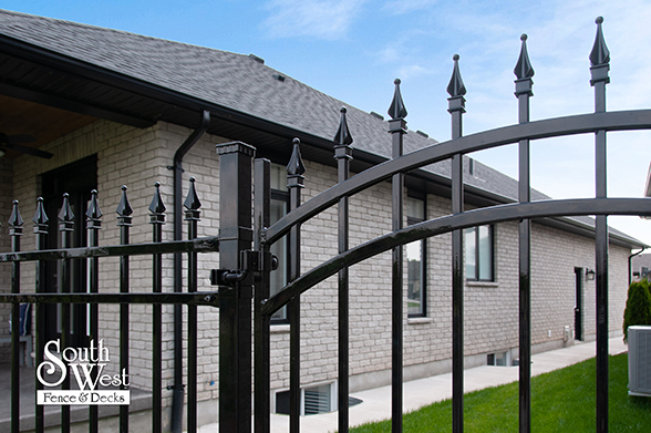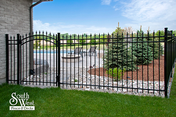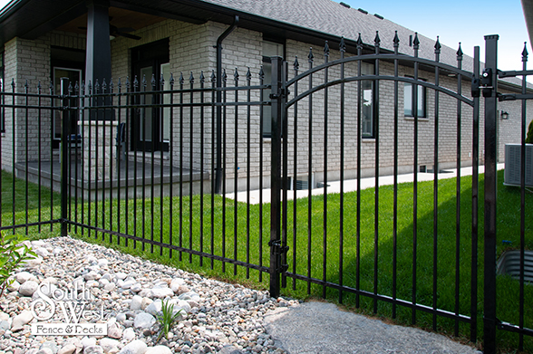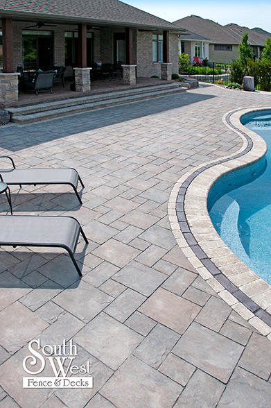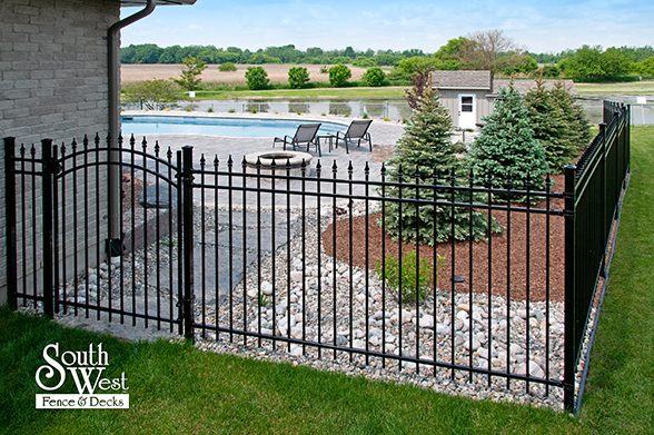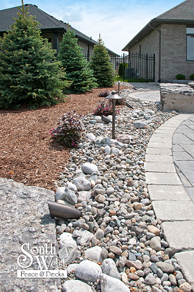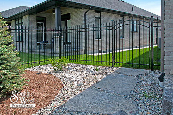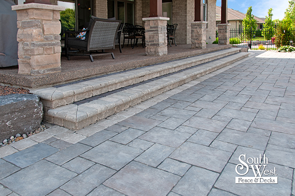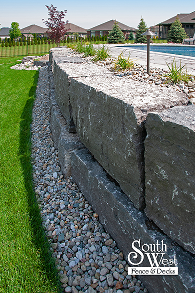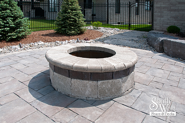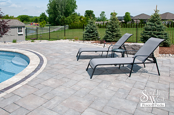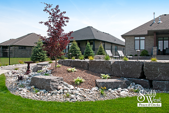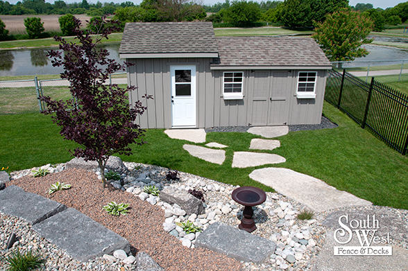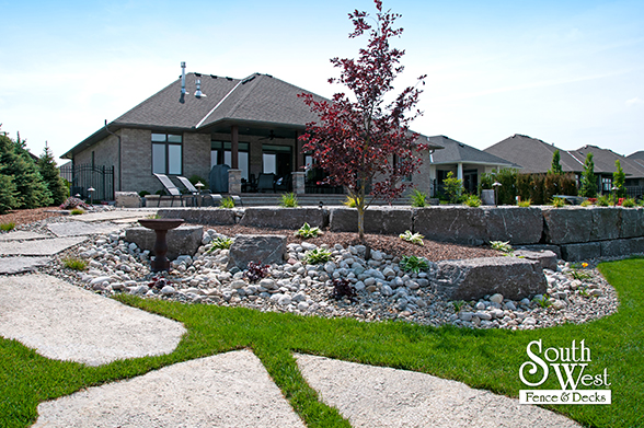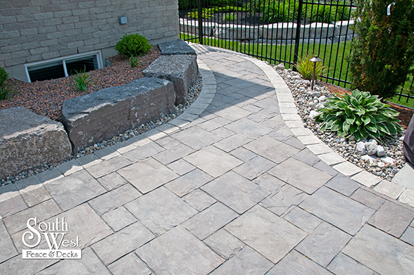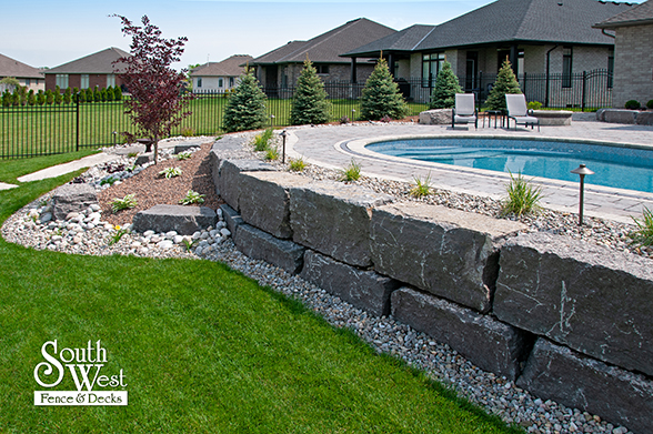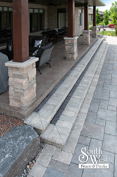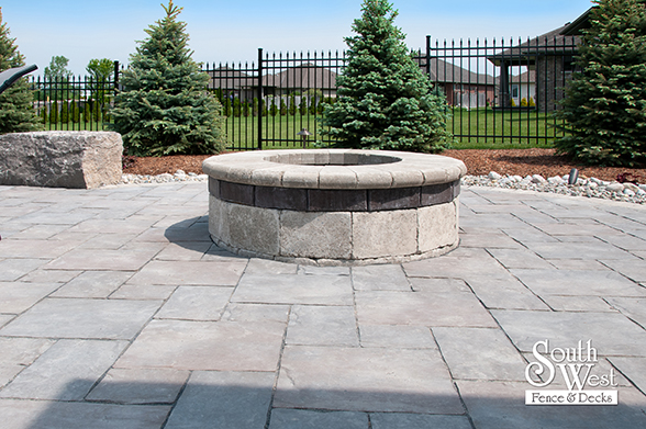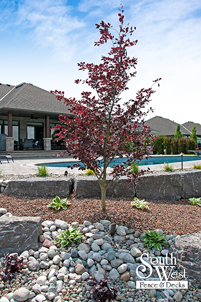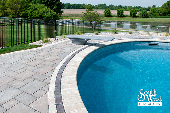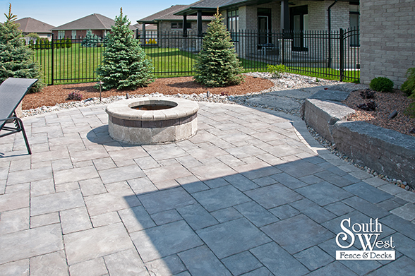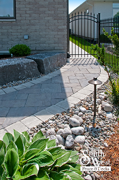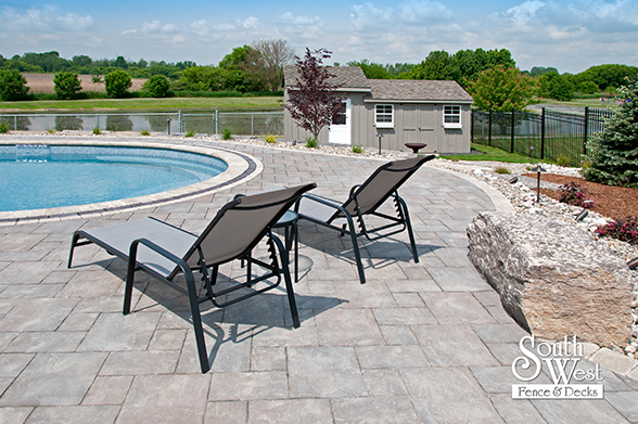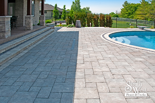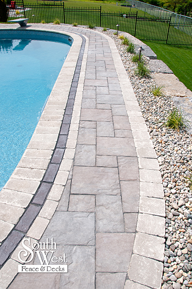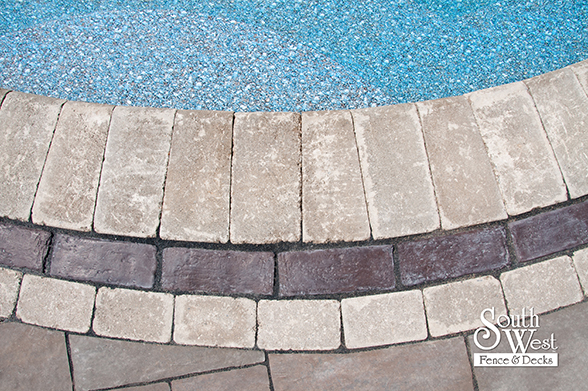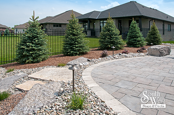 This spacious ‘Complete Backyard’ includes a stunning 22’ x 38’ Celebrity pool with diving board, additional steps, bench and a water feature. Other project features include an armourstone retaining wall, Unilock stone patio/steps, pool coping, and walkways, shed addition, concrete foundation for pizza oven, flagstone pathways, landscaping, low-voltage lighting, and ornamental iron fencing.