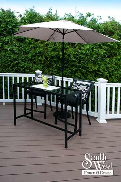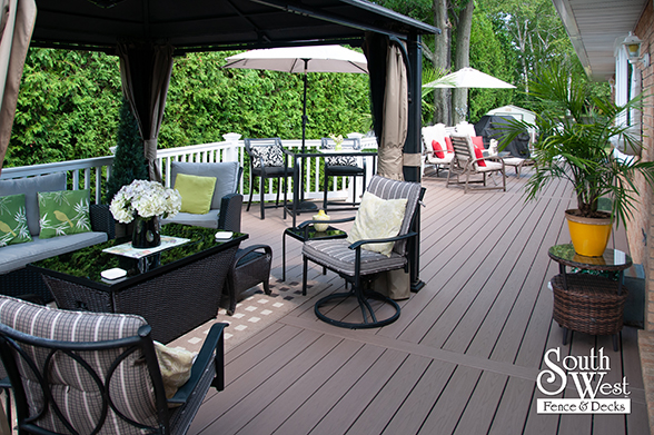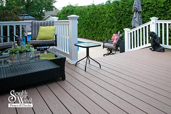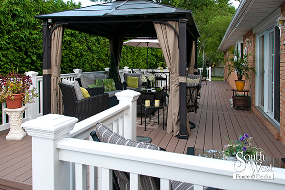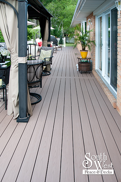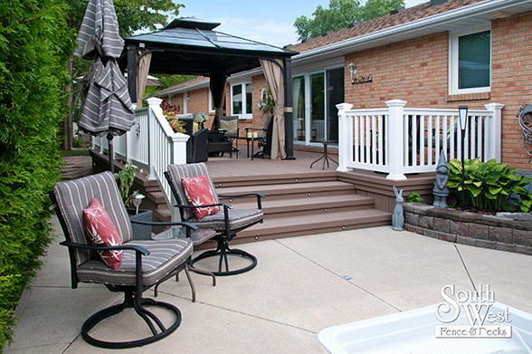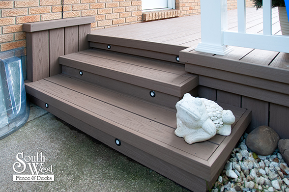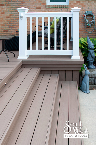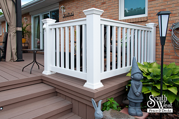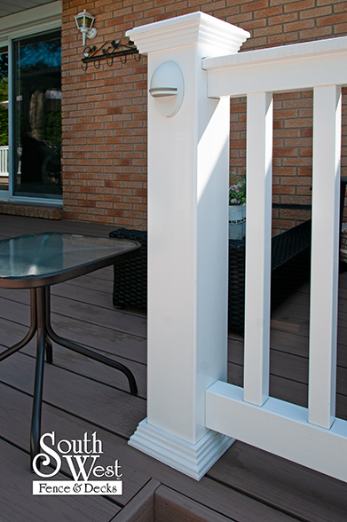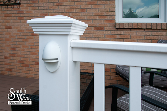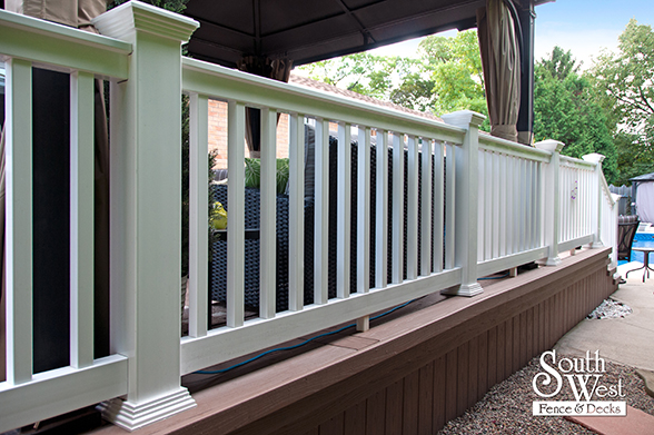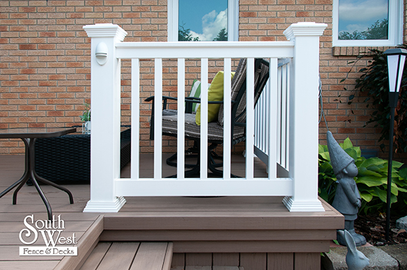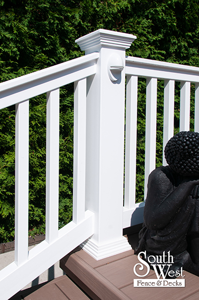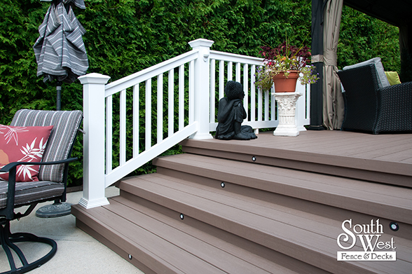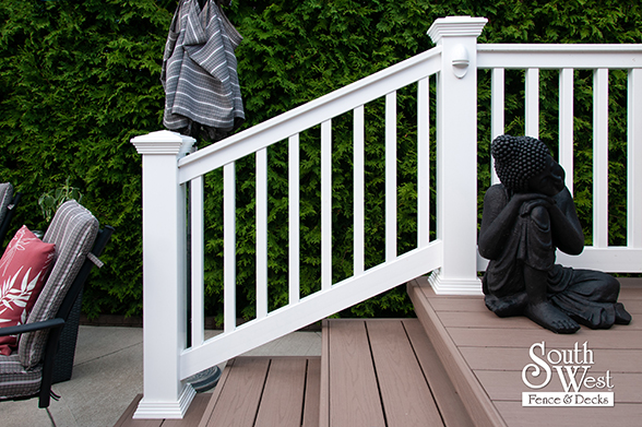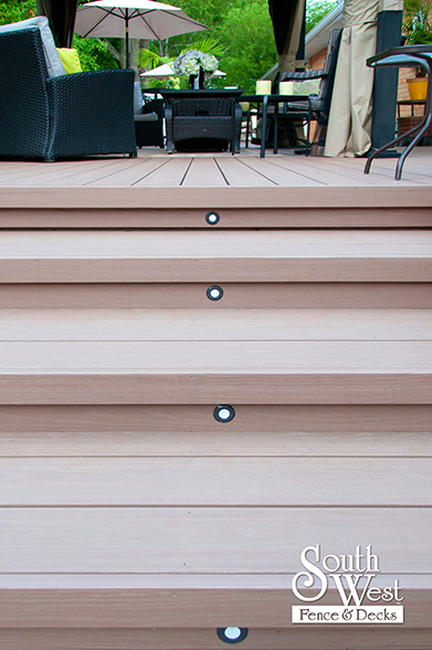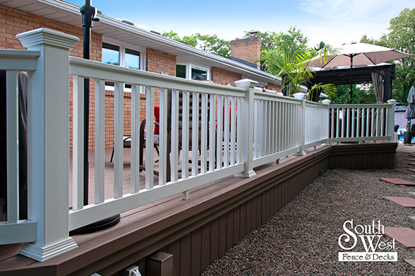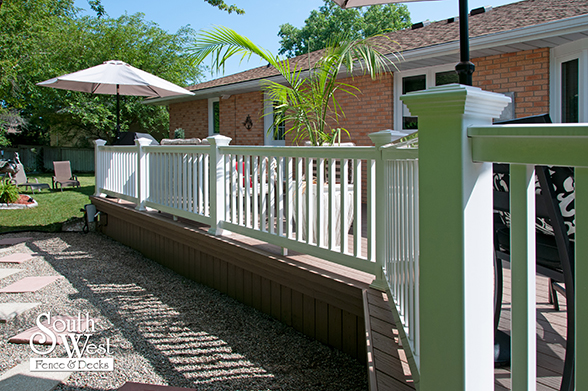 This feature project designed and installed by South West Fence & Decks is a lengthy, low-maintenance, Azek deck with dual stairs, white vinyl railings, and low-voltage lighting.