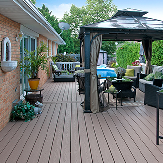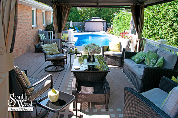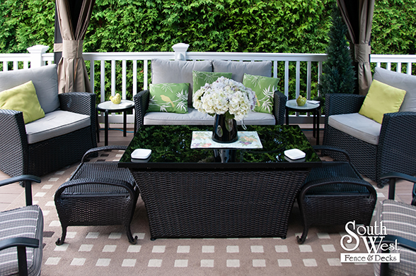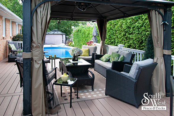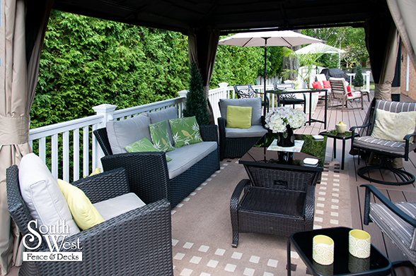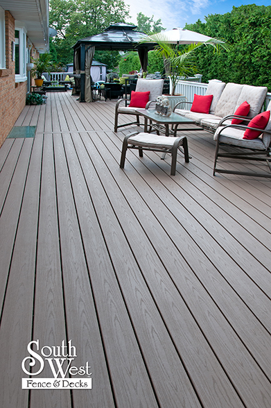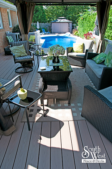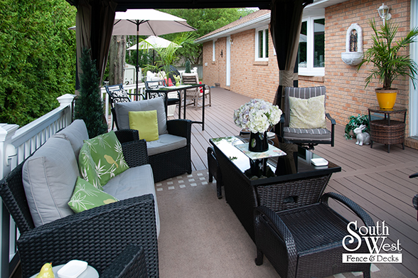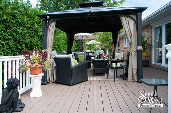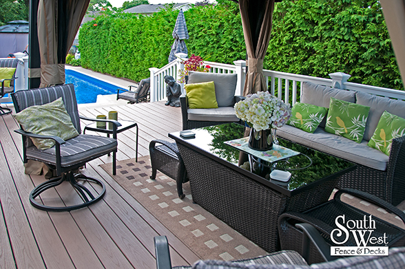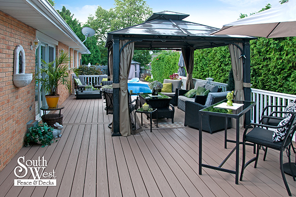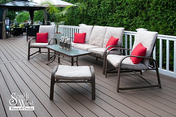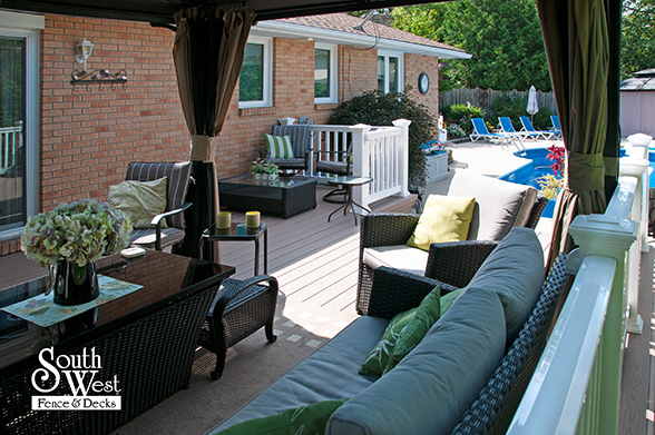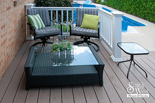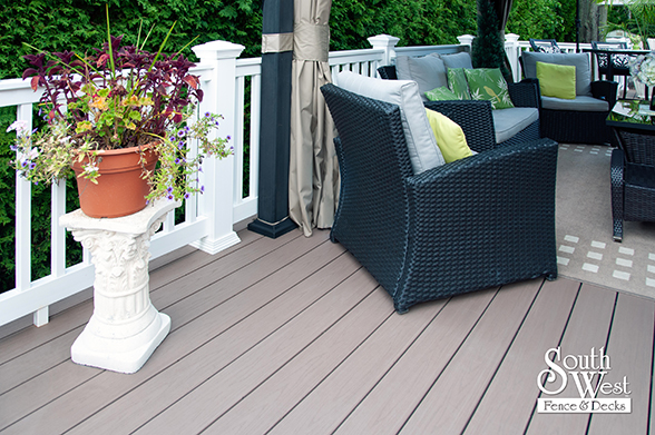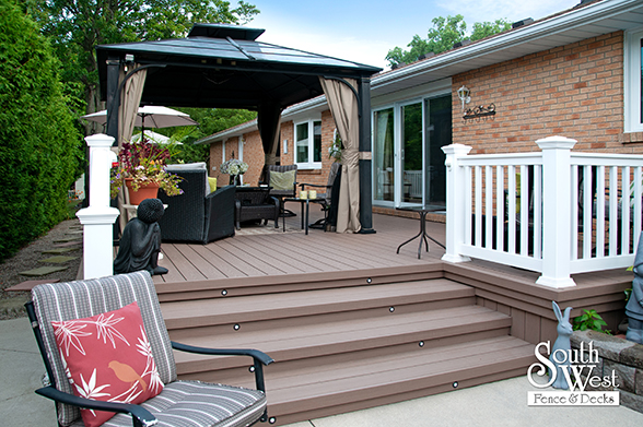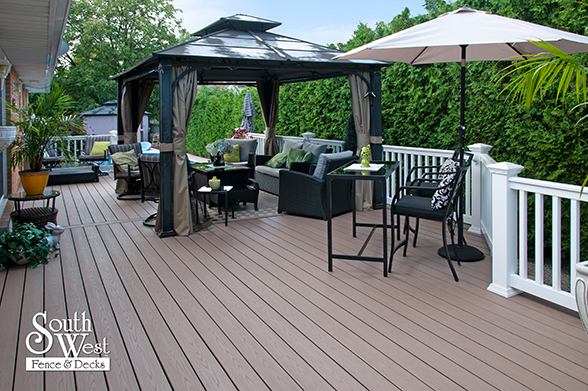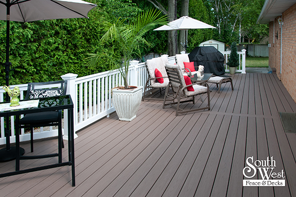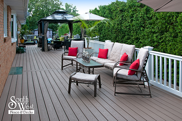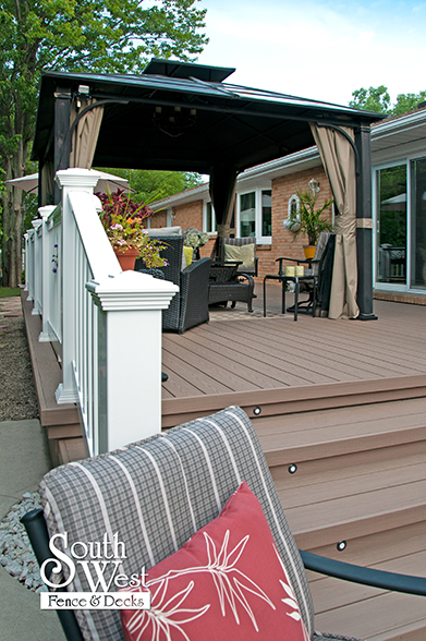 This feature project designed and installed by South West Fence & Decks is a lengthy, low-maintenance, Azek deck with dual stairs, white vinyl railings, and low-voltage lighting.