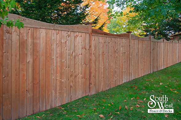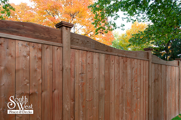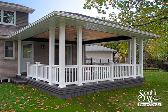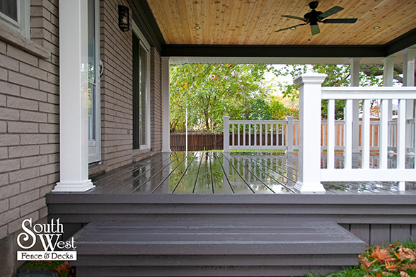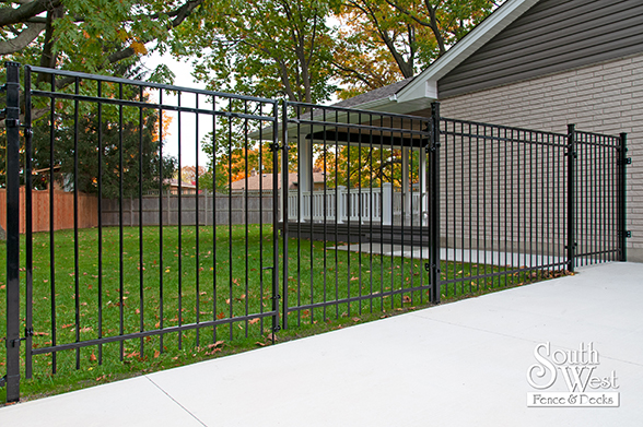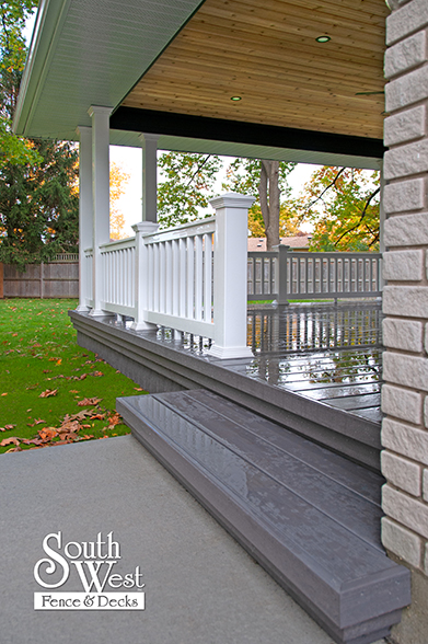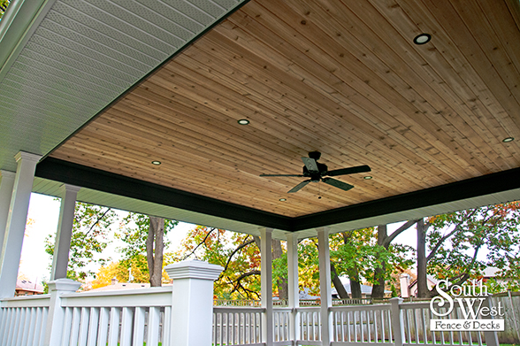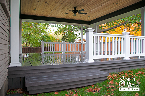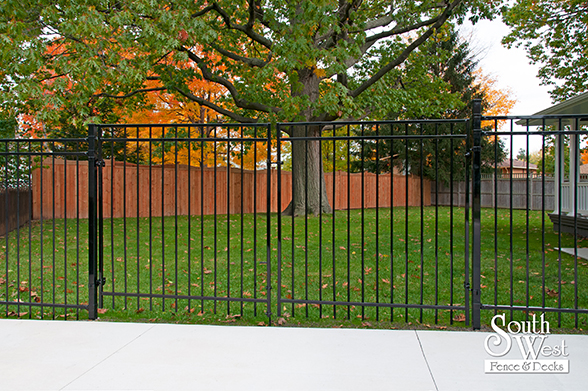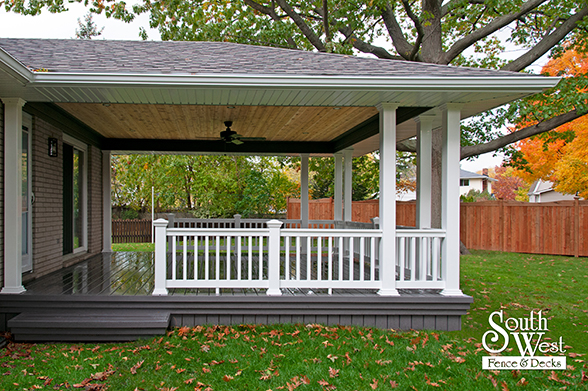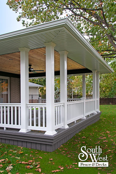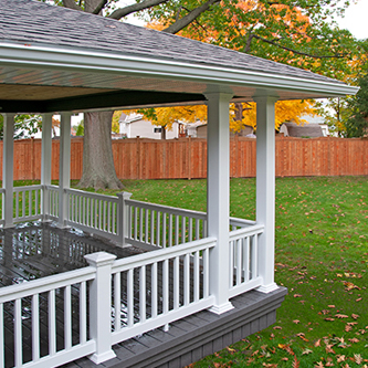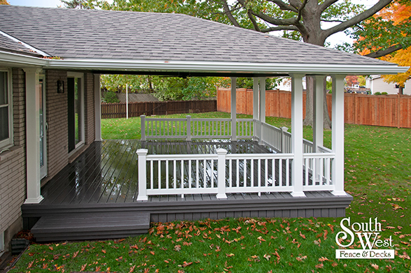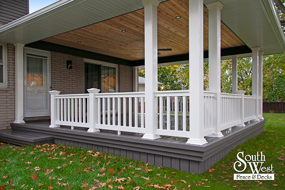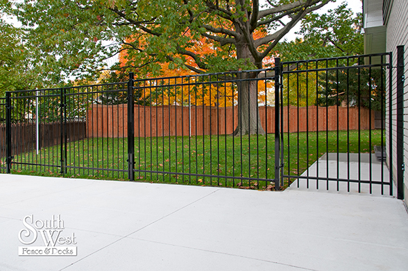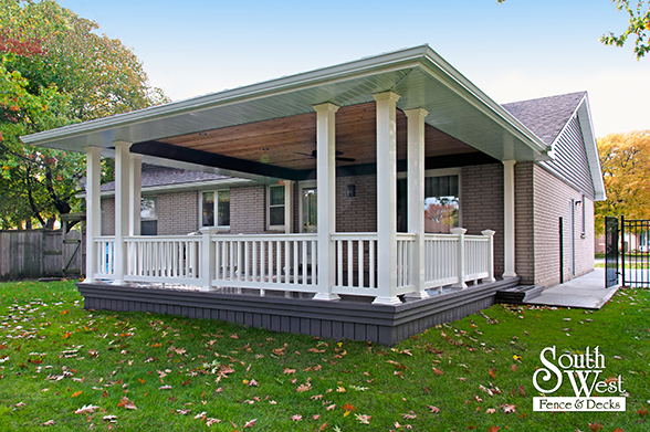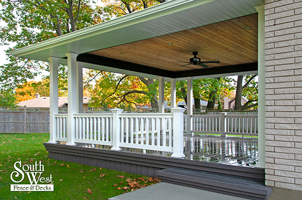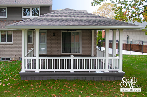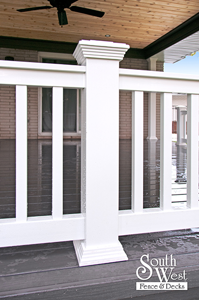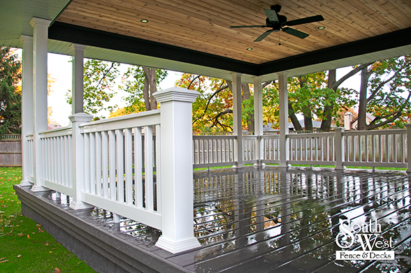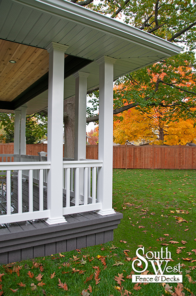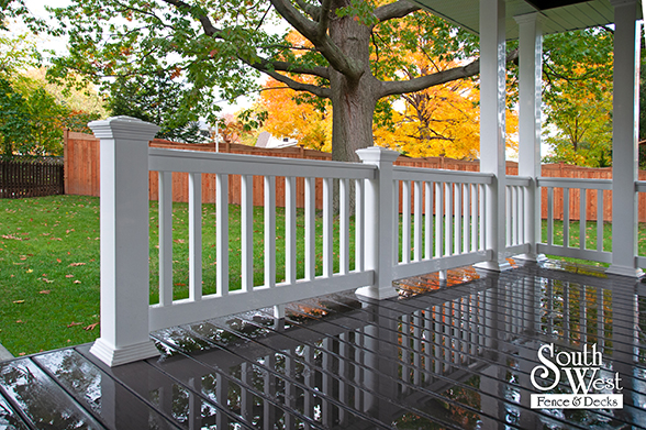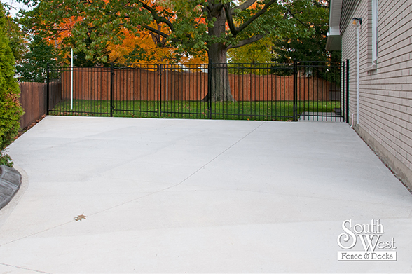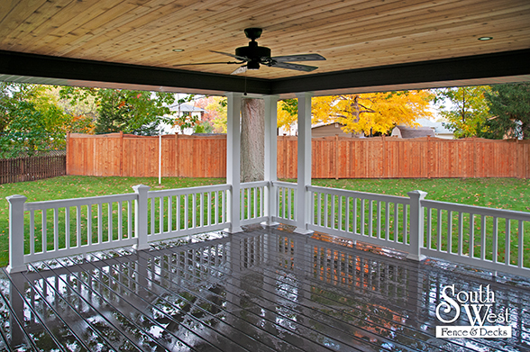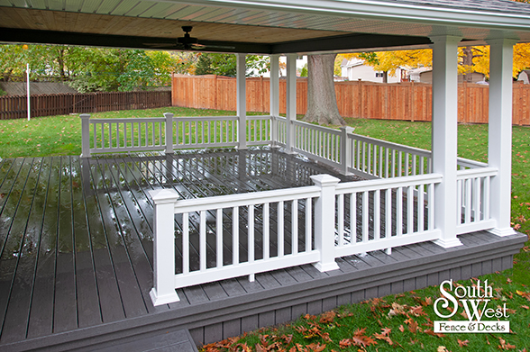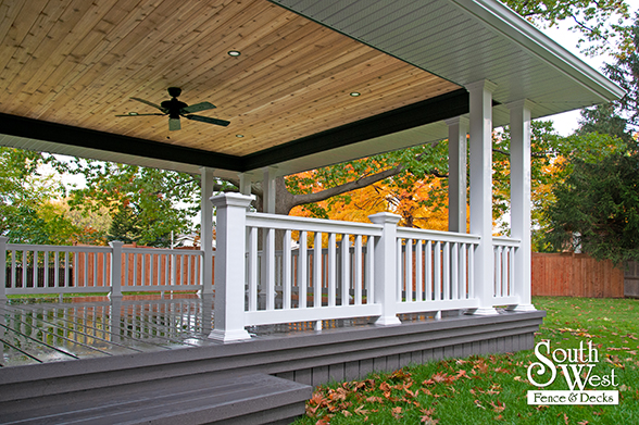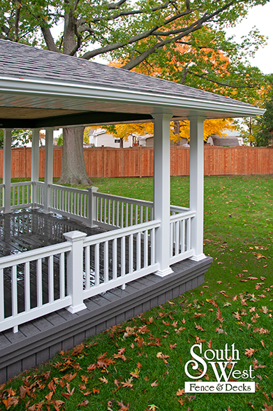 This feature project, designed and installed by South West Fence & Decks, is a low-maintenance, Azek deck with white vinyl railings and an overhead roof structure. Other project features include a a pressure-treated wood privacy fence, ornamental iron fence with gates, and a broom-finished concrete driveway and walkway.
